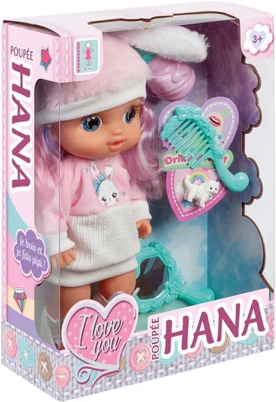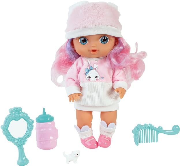 DIMENSIONI: Bambola alta 30 cm, dimensione perfetta per le mani piccole, con adorabili abiti rosa e bianchi ACCESSORI: Set completo compreso un pettine turchese, uno specchio decorativo, un biberon rosa e una statuetta di gatto bianca CARATTERISTICHE: Capelli rosa e viola acconciabili, occhi blu espressivi e comodo abito invernale con berretto abbinato CARATTERISTICHE: La bambola può bere il biberon e fare pipì, offrendo un'esperienza di gioco interattiva e realistica ETÀ CONSIGLIATA: Progettato per bambini dai 3 anni, perfetto per sviluppare l'immaginazione e le capacità di cura