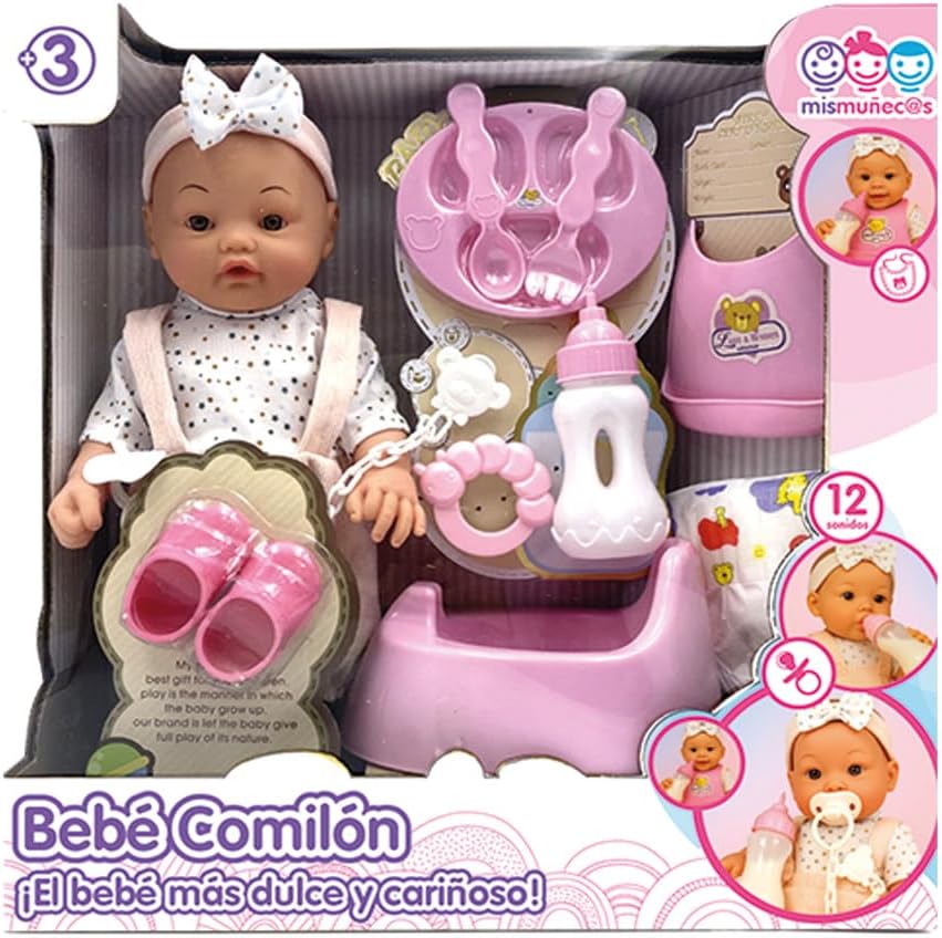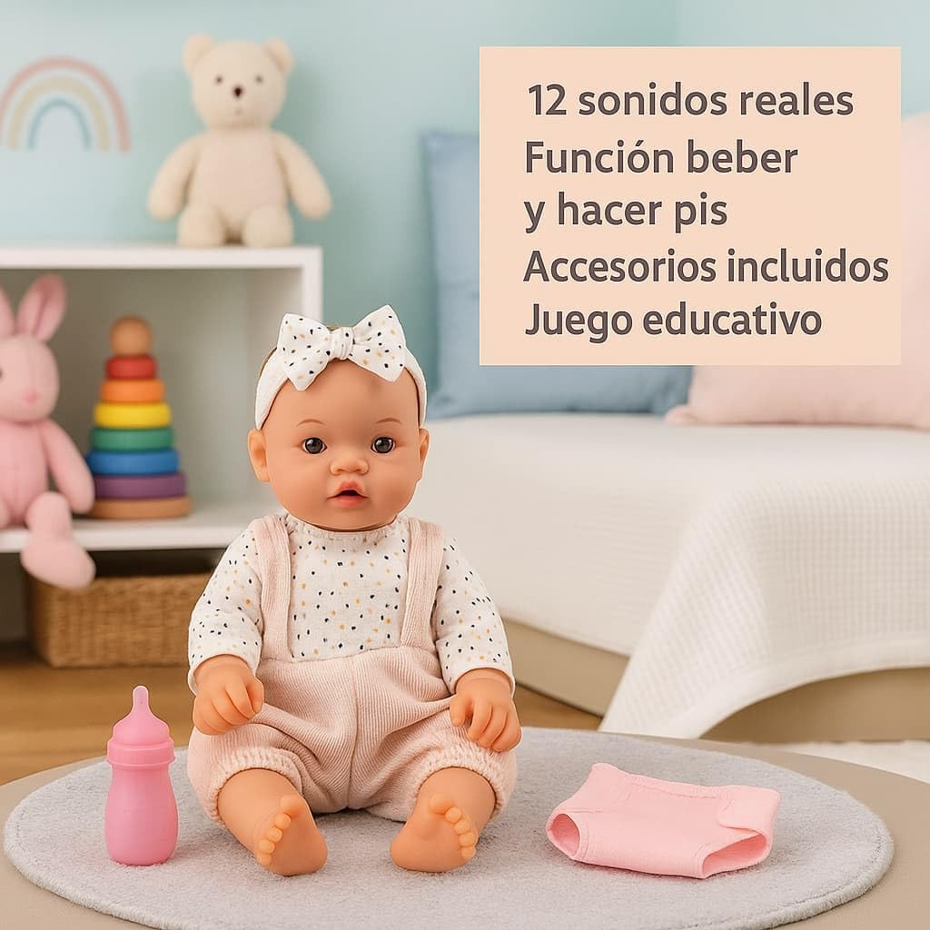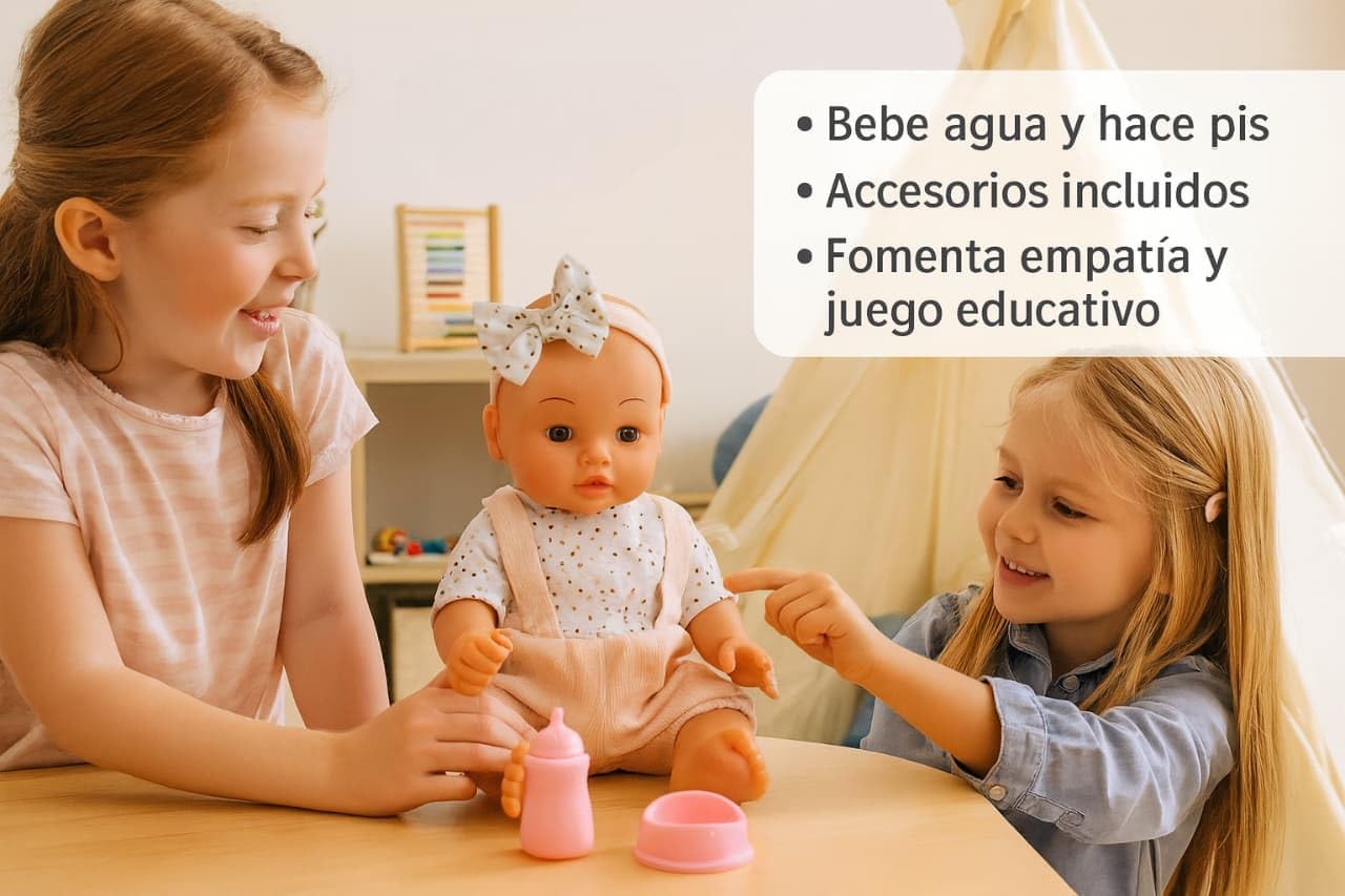 Bambola interattiva da 35 cm con fascia per capelli: questa adorabile bambola JugaToys è dotata di un design tenero e realistico, con fascia decorativa e corpo articolato, ideale per coccolare, vestire e prendersi cura. Bevi acqua e fai pipì come un vero bambino: riempi la bottiglia inclusa, dagli da bere e guarda come fa pipì. Una funzione che stimola il gioco dell'imitazione e la responsabilità fin dalla tenera età. Include accessori e 12 suoni realistici: il set contiene un biberon, un vasetto, un ciuccio e altri accessori per la cura quotidiana. La bambola emette anche 12 suoni diversi, come ridere, piangere o chiamare la mamma. Incoraggia il gioco simbolico e l'empatia: ideale per lo sviluppo emotivo e sociale di ragazzi e ragazze. Giocare a prendersi cura di un bambino rafforza l’immaginazione, l’affettività e l’autostima. Regalo educativo perfetto a partire dai 3 anni: una bambola completa, interattiva e sicura, ideale per compleanni, Natale o come primo giocattolo per neonati. Realizzato con materiali durevoli e dettagli accurati.