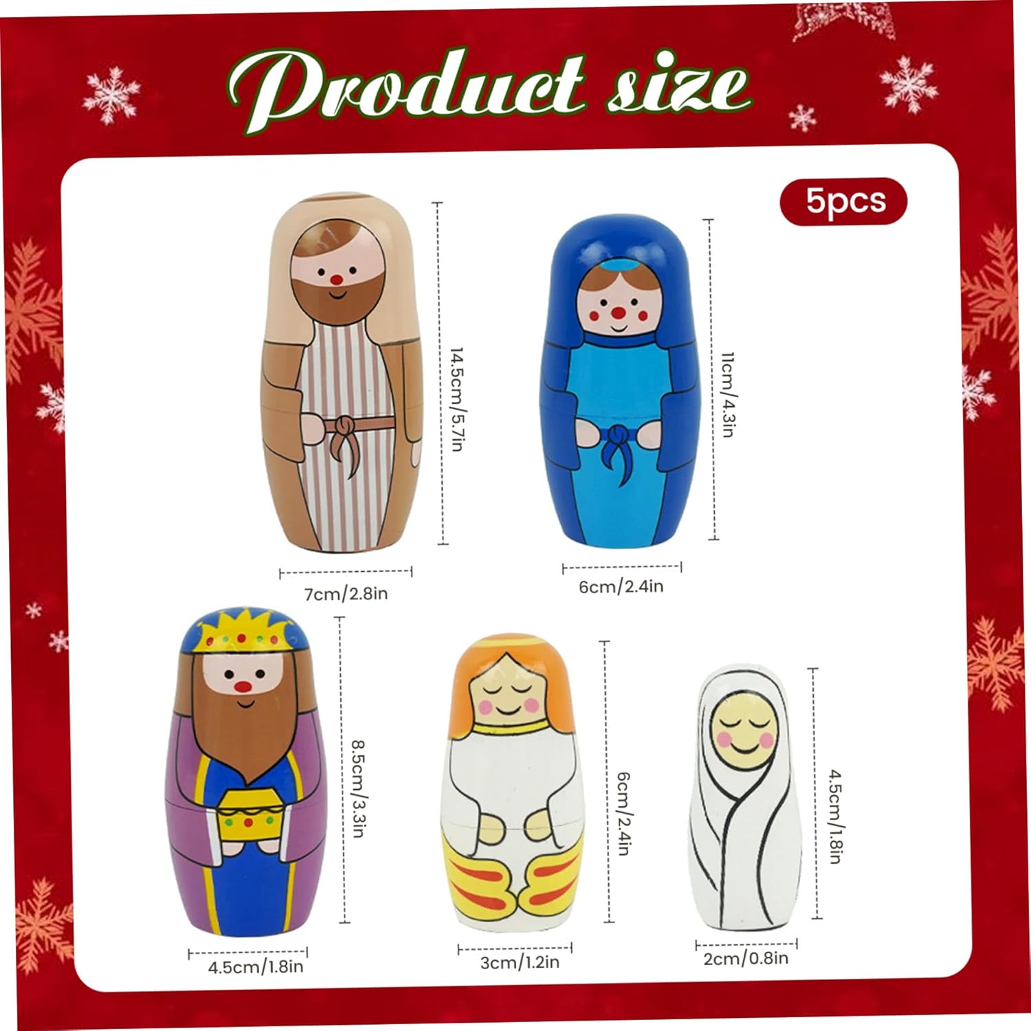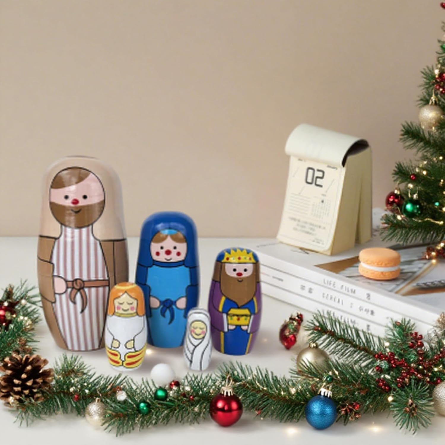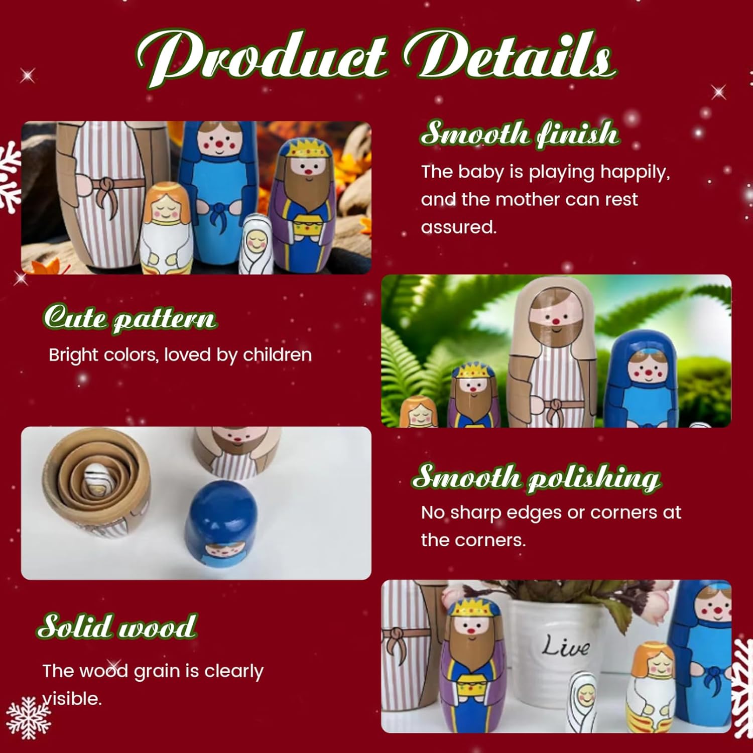 Artigianato in legno di alta qualità: realizzate in legno stabile, queste bambole matrioska in stile russo offrono un fascino duraturo e una finitura liscia sicura per i bambini..La struttura robusta garantisce anni di divertimento e visualizzazione in famiglia. Autentica arte del presepe: dipinte a mano con dettagli squisiti, queste bambole da nidificazione in legno raffigurano magnificamente il presepe di Gesù, portando uno spirito sincero e tradizionale alle tue celebrazioni di Natale, Pasqua o compleanno..Ogni bambola sfoggia colori vivaci e un design significativo che onora la storia della stagione. Divertimento educativo e interattivo: progettate per neonati e bambini, queste bambole da nidificazione promuovono le capacità motorie, la coordinazione occhio-mano e il gioco fantasioso..La loro funzione di annidamento incoraggia la risoluzione dei problemi e la curiosità, rendendo l'apprendimento gioioso e coinvolgente per i bambini. Set compatto e da collezione: questo set di bambole da nidificazione da 5 pezzi è compatto per riporlo e trasportarlo facilmente, incoraggiando la raccolta e l'esposizione..La sua miscela unica di design tradizionale della bambola russa con il simbolismo della Natività cristiana la rende un ricordo prezioso. Regalo e decorazione perfetti: ideale da presentare a Natale, Pasqua o compleanni, questo set funge sia da regalo significativo che da decorazione festosa per la casa..La vivace opera d'arte a tema Natività migliora l'arredamento natalizio e ispira la celebrazione.