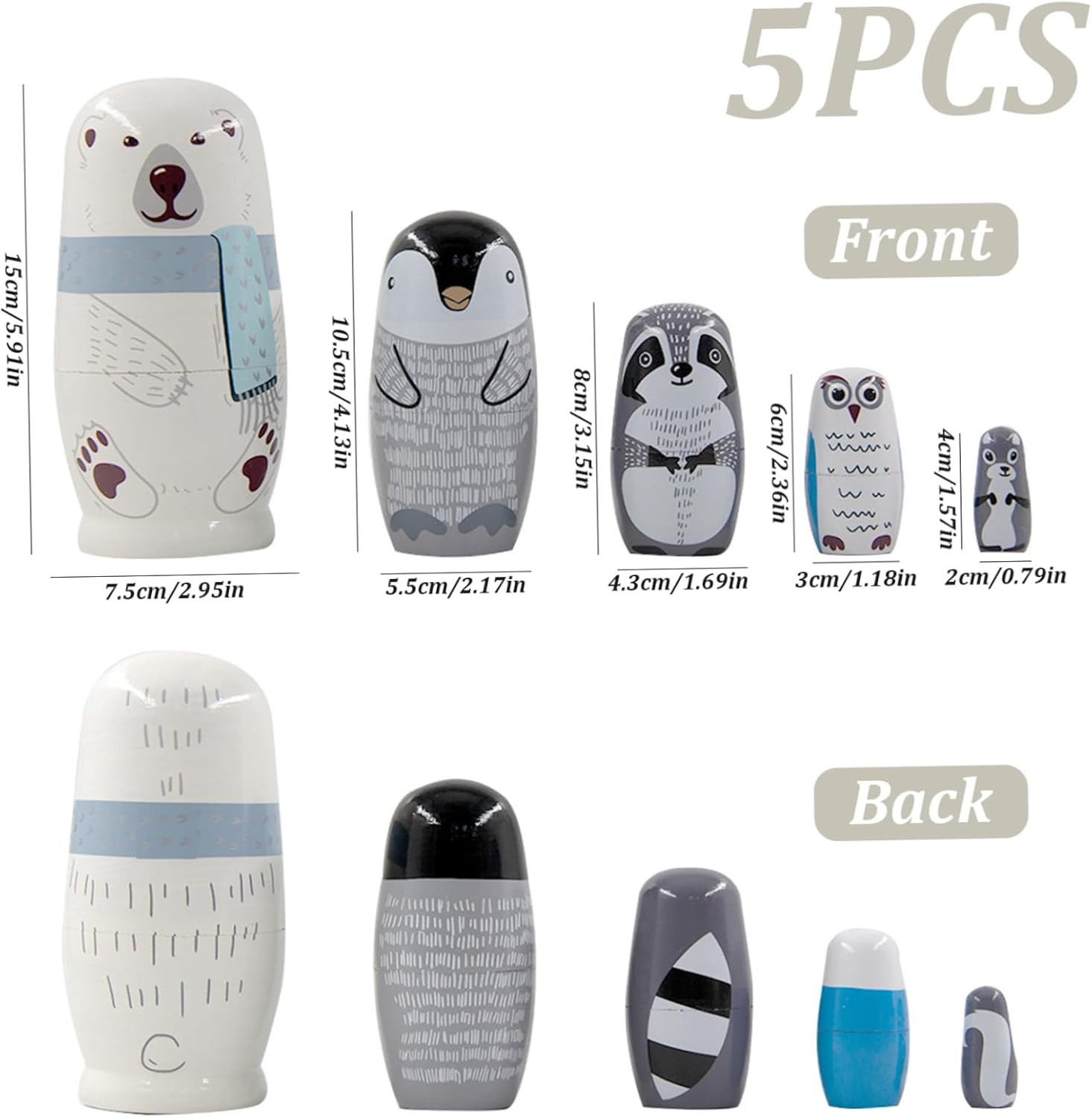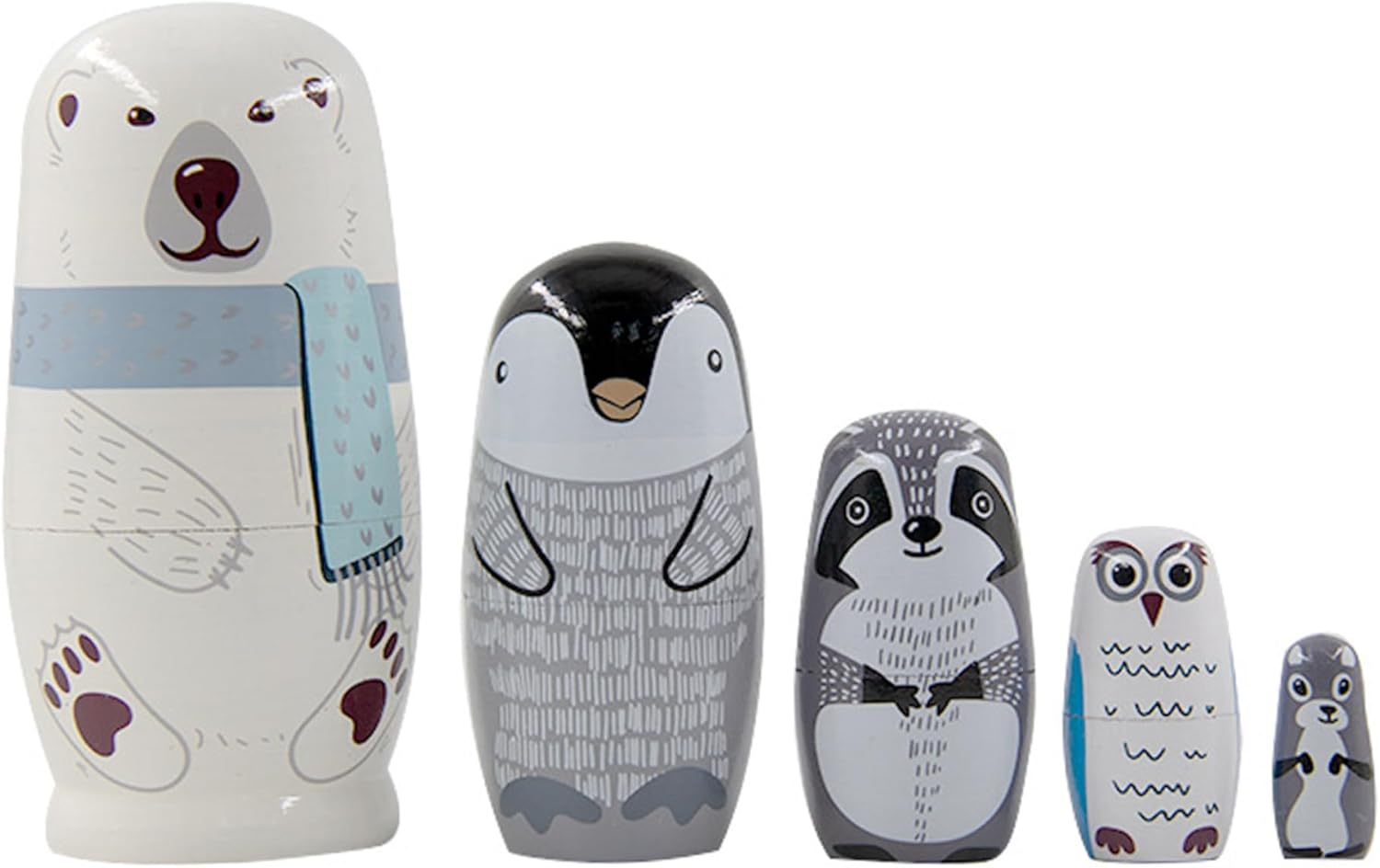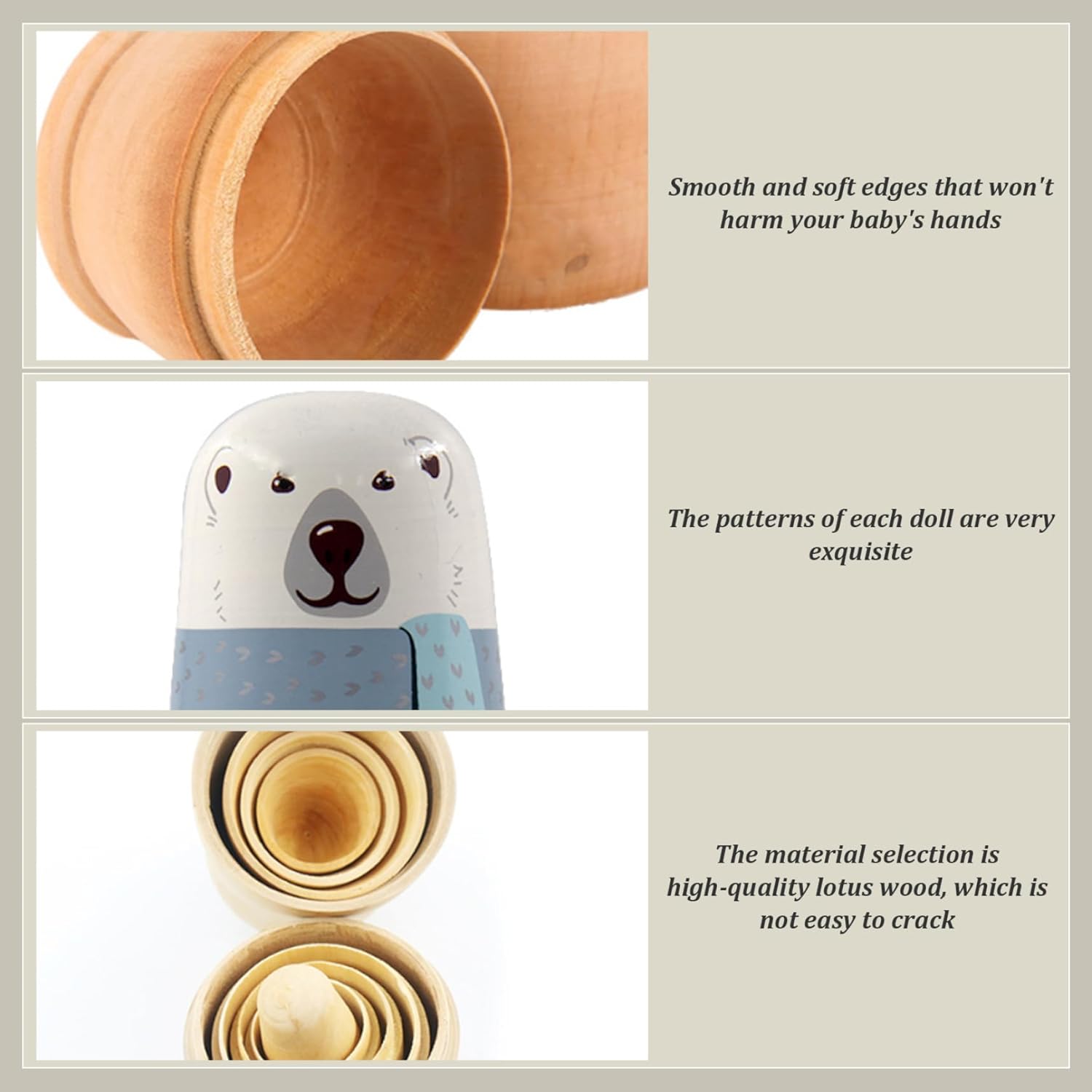 Set di 5: questa collezione è composta da cinque affascinanti bambole russe impilate una sopra l'altra per formare un pezzo decorativo visivamente accattivante e salvaspazio..Ogni bambola è una miniatura che mette in mostra l'arte tradizionale russa. Educativo e interattivo: introduce un momento educativo nel gioco con queste bambole nidificanti..Lascia che i bambini imparino le dimensioni, le sequenze e le capacità motorie delle bambole mentre esplorano il divertimento di impilare e disimpilare le bambole. Legno: queste bambole russe sono realizzate in legno per una maggiore durata..La superficie liscia e la struttura assicurano che ogni bambola sia un pezzo senza tempo che può essere tramandato di generazione in generazione. Decorazione multiuso: disposti in set o singolarmente, possono essere utilizzati come pezzi decorativi per infondere glamour culturale nel tuo spazio posizionandoli su una libreria, una mensola o un tavolo o come una scatola per articoli vari, caramelle e altro ancora. Design adorabile: le bambole presentano un adorabile motivo a forma di orso bianco e sono decorate con colori vivaci e motivi intricati..Ogni strato presenta un nuovo personaggio, aggiungendo sorpresa e divertimento all'esperienza di nidificazione.