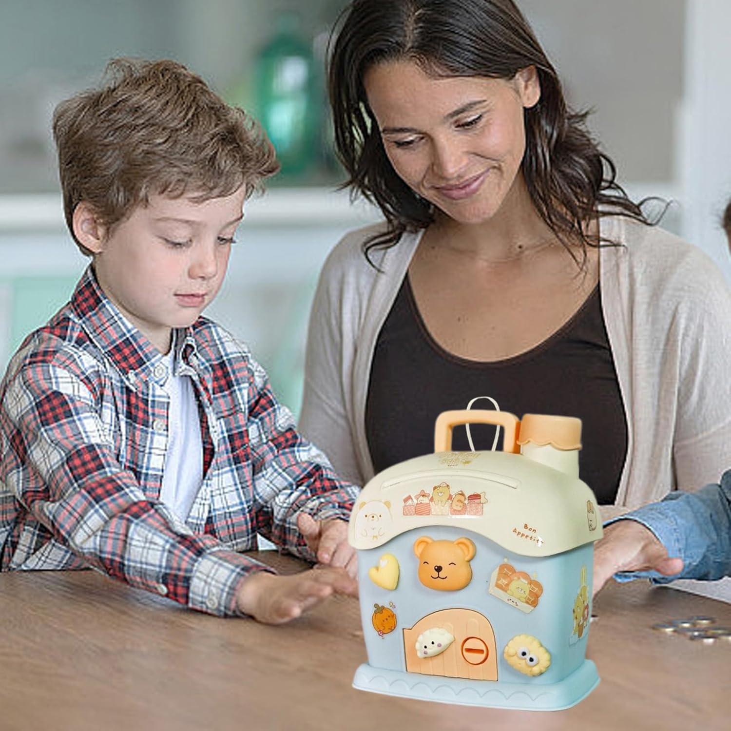 Volume elevato: con grande capacità, questo salvadanaio domestico memorizza una notevole quantità di denaro senza la necessità di smontare. Recuperare la tua stanza è sicuro e facile, ogni volta che ne hai bisogno. Promuovere la responsabilità: consente ai giovani risparmiatori di risparmiare e decorare il loro salvadanaio a forma di casa con 1 grazioso adesivo e 2 chiavi, favorendo la coscienza finanziaria creando una soluzione di risparmio unica. Imparare giocando: migliorare le competenze di risparmio con questa banca di valuta. Il suo design interattivo e divertente funge da strumento didattico per insegnare la responsabilità finanziaria, instillando l'importanza di risparmiare per il futuro. Semplice da pulire: progettato in modo intelligente per una facile manutenzione, questa banca a forma di casa richiede solo una rapida pulizia con un panno umido. Non c'è bisogno di risciacquare con acqua. Versatile: posiziona questa bella banca di denaro sullo scaffale, sul tavolo o sulla scrivania per una bella decorazione per la casa. Non è solo colorato: aiuta anche a mantenere i tuoi risparmi sani e salvati, con un tocco di morbidezza in ogni stanza caduta.
