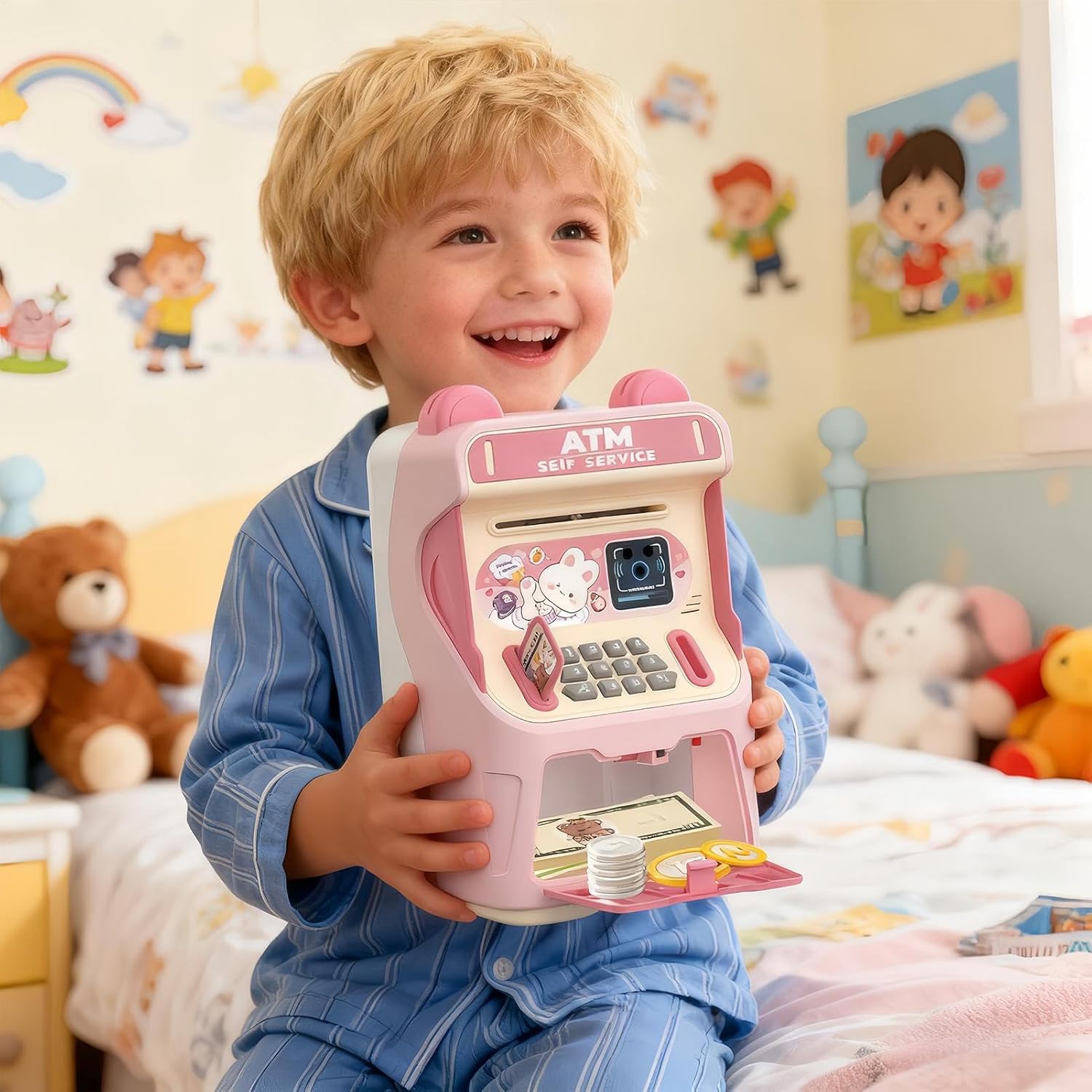 Momenti di Risparmio Gioiosi: Il salvadanaio ATM per bambini integra un feedback audio allegro e una riproduzione musicale automatica, trasformando le ordinarie attività di risparmio in esperienze memorabili piene di felicità ed entusiasmo per i giovani risparmiatori, sia a casa che durante eventi scolastici. Questo approccio rende il risparmio un momento di gioia e divertimento, incoraggiando i bambini a sviluppare abitudini positive in modo coinvolgente e piacevole, con suoni che catturano l'a Archiviazione Sicura Denaro: L'ATM Salvadanaio funziona come un contenitore di risparmio bloccabile, aiutando i bambini a imparare la responsabilità finanziaria mentre protegge monete e banconote attraverso un design sicuro che previene l'accesso non autorizzato. Lo rende ideale per insegnare abitudini di risparmio a casa o in classe, con una struttura robusta che assicura durabilità e sicurezza. Promuove un senso di proprietà e responsabilità nei giovani utenti, facilitando l'apprendimento Traccia Risparmi Visibile: Caratterizzato da un approccio rituale al risparmio, il salvadanaio ATM utilizza un meccanismo monete innovativo con un design accattivante che permette agli utenti di osservare la crescita dei propri risparmi in reale. Questa tracciabilità visiva mantiene la motivazione quotidiana, trasformando il risparmio in un'abitudine gratificante e coinvolgente che supporta un impegno costante verso gli obiettivi finanziari personali. Simulazione Bancaria Realistica: Con la speciale funzione di riconoscimento facciale, il Bancomat per Bambini offre una sessione bancaria interattiva e unica, permettendo ai bambini di esplorare il risparmio e le transazioni in modo creativo e innovativo, favorando l'educazione finanziaria attraverso un'esperienza pratica e coinvolgente con il gioco del bancomat. Cassaforte Divertente per Bambini: Progettato con un tema a coniglio, il Kids ATM funge da strumento interattivo per incoraggiare il risparmio adatto ai bambini, rendendo piacevole il deposito di denaro e favorendo la consapevolezza finanziaria attraverso scenari di gioco immaginativi a casa. Questo salvadanaio coinvolgente aiuta i piccoli a imparare il valore del denaro in modo giocoso, mentre si divertono a usare la cassaforte per simulare operazioni di risparmio quotidiane, trasformand