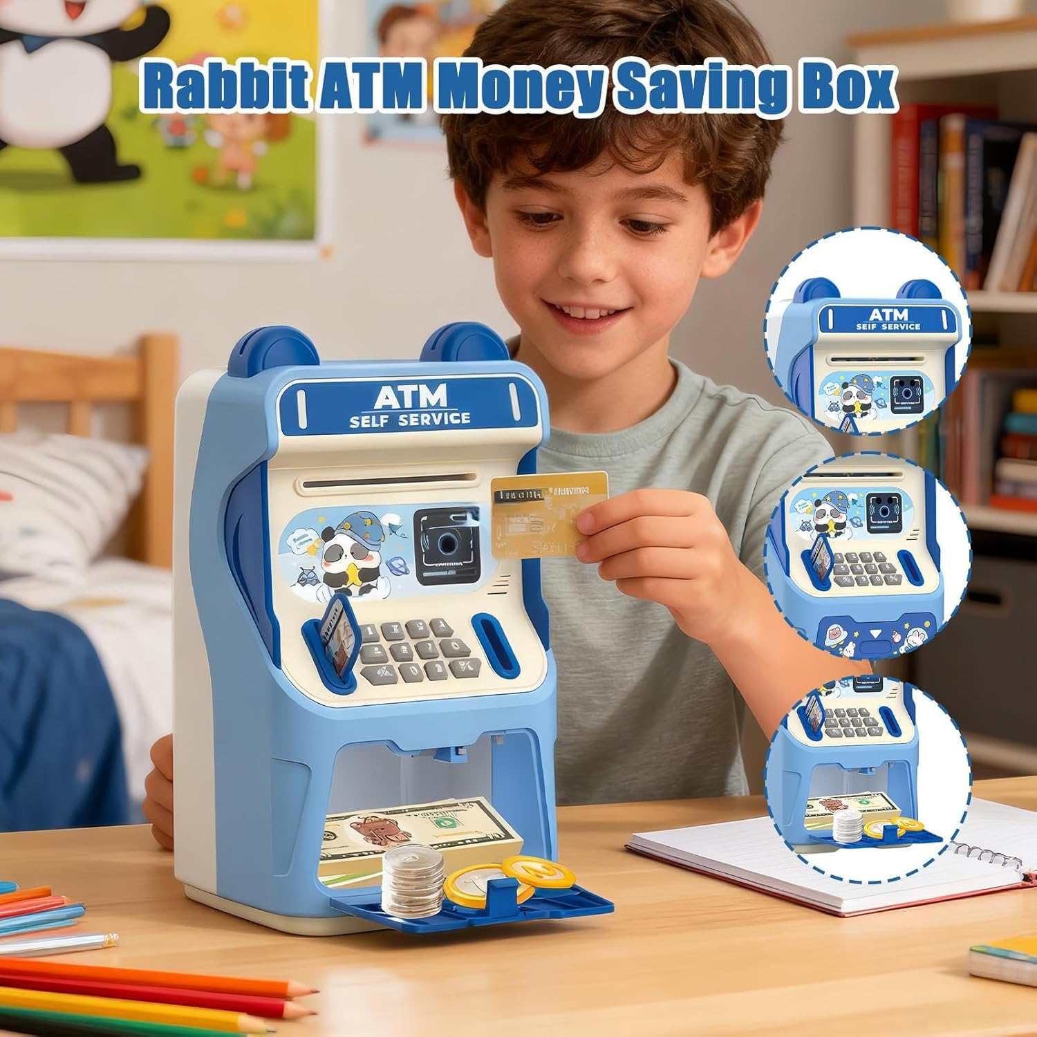 Esperienza Musicale Interattiva: Con la sua capacità di produrre effetti sonori deliziosi e melodie automatiche, questo salvadanaio rende il risparmio coinvolgente per i bambini, aggiungendo un tocco gioioso ad ogni deposito di moneta durante l'uso quotidiano o le occasioni speciali. L'esperienza interattiva e musicale trasforma il risparmio in un gioco, mantenendo alto l'interesse e la motivazione, con suoni che rendono ogni transazione un momento di felicità e coinvolgimento per i giovani Costruttore Abitudini Finanziarie: L'ATM Salvadanaio funge da costruttore di abitudini finanziarie, incoraggiando pratiche di risparmio disciplinate attraverso caratteristiche interattive e un di archiviazione sicuro. Aiuta a instillare competenze di gestione del denaro a lungo termine durante gli anni formativi, promuovendo una mentalità finanziaria responsabile e consapevole. Il giocattolo educativo supporta lo sviluppo di routine positive per il risparmio, in modo coinvolgente e sicur Processo Risparmio Innovativo: Questo salvadanaio ATM incorpora un meccanismo monete innovativo che crea un processo di risparmio chiaramente visibile, offrendo agli ti un modo speciale e interattivo per accumulare monete. Tale approccio unico lo rende ideale per favorire la disciplina finanziaria nel , facilitando un'esperienza pratica che ispira i bambini a seguire l'evoluzione dei loro risparmi in modo semplice e regolare. Gioco Interattivo con Carta: Integrando il gioco interattivo con carta e la simulazione realistica di un bancomat, questo Bancomat per Bambini crea un ambiente coinvolgente i bambini possono praticare la gestione del budget e le decisioni finanziarie, rendendo l'apprendimento della gestione del denaro sia divertente che per sviluppare competenze finanziarie di base in modo giocoso e coinvolgente. Risparmio per Bambini: Questo Kids ATM incorpora un design incantevole a coniglio che aumenta il suo appeal come giocattolo e motiva i bambini a risparmiare, trasformando i compiti di risparmio di routine in un'attività entusiasmante durante compleanni o occasioni di regalo festivo. Il tema del coniglio rende il risparmio un gioco divertente e memorabile, incoraggiando i piccoli a usare la cassaforte in modo regolare per costruire abitudini monetarie attraverso esperienze interattive e piac