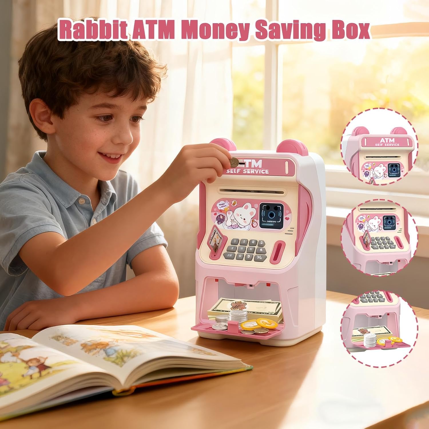 Esperienza Musicale Interattiva: Con la sua capacità di produrre effetti sonori deliziosi e melodie automatiche, questo salvadanaio rende il risparmio coinvolgente per i bambini, aggiungendo un tocco gioioso ad ogni deposito di moneta durante l'uso quotidiano o le occasioni speciali. L'esperienza interattiva e musicale trasforma il risparmio in un gioco, mantenendo alto l'interesse e la motivazione, con suoni che rendono ogni transazione un momento di felicità e coinvolgimento per i giovani Costruttore Abitudini Finanziarie: L'ATM Salvadanaio funge da costruttore di abitudini finanziarie, incoraggiando pratiche di risparmio disciplinate attraverso caratteristiche interattive e un di archiviazione sicuro. Aiuta a instillare competenze di gestione del denaro a lungo termine durante gli anni formativi, promuovendo una mentalità finanziaria responsabile e consapevole. Il giocattolo educativo supporta lo sviluppo di routine positive per il risparmio, in modo coinvolgente e sicur Traccia Risparmi Visibile: Caratterizzato da un approccio rituale al risparmio, il salvadanaio ATM utilizza un meccanismo monete innovativo con un design accattivante che permette agli ti di osservare la crescita dei propri risparmi in reale. Questa tracciabilità visiva mantiene la motivazione quotidiana, trasformando il risparmio in un'abitudine gratificante e coinvolgente che supporta un impegno costante verso gli obiettivi finanziari personali. Gioco Immersivo di Gestione Denaro: Progettato come giocattolo per l'alfabetizzazione finanziaria, questo prodotto combina un'esperienza bancaria immersiva con interazioni pratiche con la carta, insegnando ai bambini le competenze essenziali di gestione del denaro mentre si divertono nel role-play come banchieri o clienti a casa, in un ambiente di gioco realistico e educativo. Risparmio per Bambini: Questo Kids ATM incorpora un design incantevole a coniglio che aumenta il suo appeal come giocattolo e motiva i bambini a risparmiare, trasformando i compiti di risparmio di routine in un'attività entusiasmante durante compleanni o occasioni di regalo festivo. Il tema del coniglio rende il risparmio un gioco divertente e memorabile, incoraggiando i piccoli a usare la cassaforte in modo regolare per costruire abitudini monetarie attraverso esperienze interattive e piac