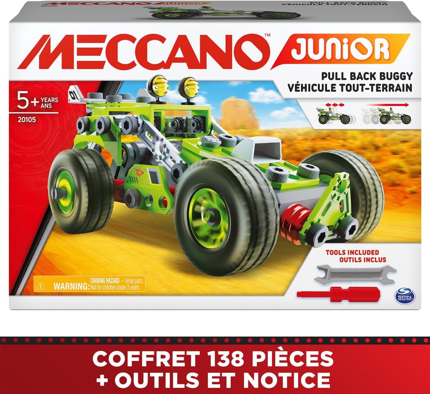 KIT DI COSTRUZIONE BUGGY – Scopri l’auto a retro-frizione di Meccano Junior: un veicolo che accelera a tutta velocità dopo una semplice spinta all’indietro. Una volta montato, può essere smontato per ricostruirlo da capo! MOTORE RETRO-FRIZIONE INCLUSO – Con il motore a retro-frizione, il buggy offre accelerazioni sorprendenti. Tiralo indietro, rilascialo e guarda l’auto sfrecciare! CONTENUTO DEL KIT – 138 pezzi, 2 attrezzi, 1 foglio di adesivi e 1 manuale con tutte le fasi di montaggio del veicolo Meccano. GIOCATTOLO DAI 5 ANNI IN SU – Un regalo divertente a partire dagli 5 anni, che favorisce l’apprendimento della meccanica, lo sviluppo della manualità e assicura ore di gioco creativo. Un vero piacere anche per adolescenti, adulti costruttori, collezionisti e fan delle auto rétro. COMPATIBILE CON L’UNIVERSO MECCANO – I kit Meccano sono compatibili tra loro, permettendo ai veicoli di essere evolutivi e personalizzabili. Combina i pezzi con altri modelli per creare veicoli unici!