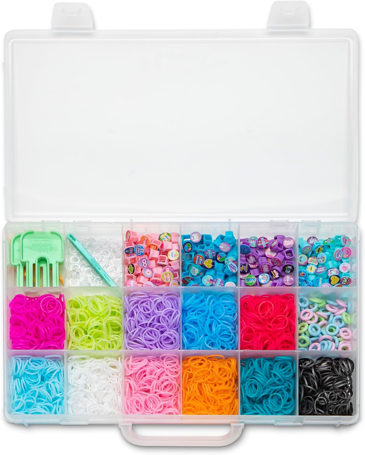 GIOCO CREATIVO BREVETTATO - Rainbow Loom offre molti kit e scatole con materiali resistenti per realizzare gioielli che durano nel tempo. Il kit Rainbow Loom Beadmoji Deluxe presenta perline ed elastici resistenti per realizzare molti braccialetti completamente personalizzabili in dimensioni e colori! GIOIELLI PERSONALIZZABILI - I braccialetti possono essere personalizzati con i Beadmoji contenuti in questo kit. Si tratta di perline con messaggi, icone, per rendere ogni braccialetto assolutamente unico. Ancora meglio per crearli e regalarli con gli amici! Confezione completa idea regalo per bambini. Questo kit per la produzione di braccialetti include: 2200 elastici senza lattice, 240 Beadmoji, 2 ganci Beadmoji, 100 perline di separazione, 2 telai Speed Loom, 2 ganci doppi, 50 C clip, una scatola di immagazzinaggio, un manuale di istruzioni passo passo. Tempo libero creativo per bambini di 7 anni e + - Un'attività amichevole, i bambini potranno creare gioielli per loro o per i loro amici. Le numerose perline Beadmoji consentono di personalizzare ogni gioiello con messaggi o motivi. BRACCIALI ELASTICI CON MATERIALI RESISTENTI - Gli elastici sono resistenti, in gomma e senza lattice. Inoltre sono facili da maneggiare con i ganci con punta metallica appositamente adatti, o anche con le mani.
