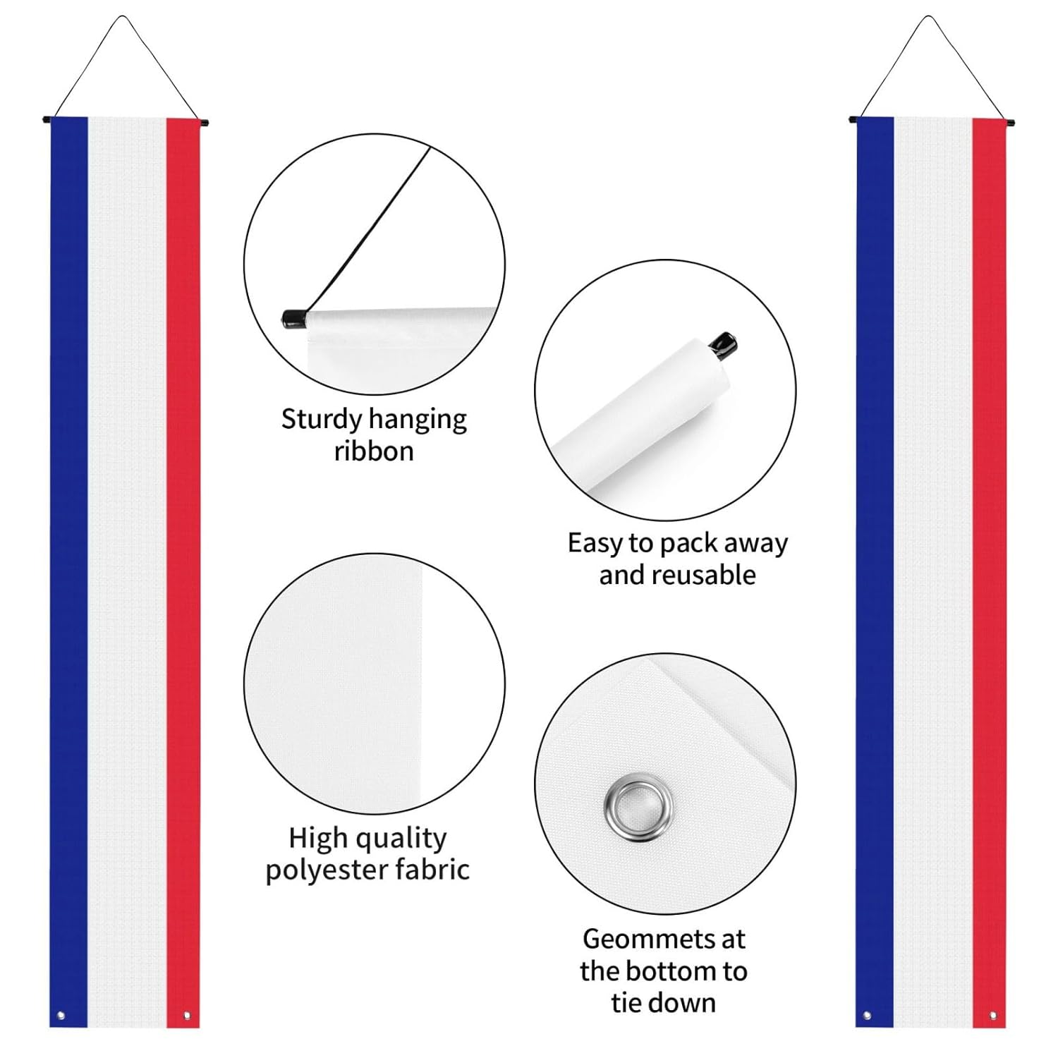 Dimensioni versatili per molteplici scenari: misurando 30 cm di larghezza e 180 cm di altezza, questo striscione stampato con bandiera francese si adatta perfettamente a vari ambienti come spazi interni, pareti esterne, giardini e portici. Materiale in poliestere: realizzato in tessuto di poliestere, questo striscione di laurea stampato con bandiera francese è robusto, lavabile e riutilizzabile. Per feste, cerimonie o come decorazione per la porta d'ingresso, garantendo un utilizzo duraturo. Installazione semplice: dotato di un'asta per appendere e di corde sulla parte superiore, questo striscione per portico di laurea può essere appeso facilmente ovunque all'interno o all'esterno senza complicate installazioni. Si piega in modo compatto per riporlo facilmente dopo le celebrazioni. Accessori all-inclusive: viene fornito con aste e corde preassemblate per appenderlo senza problemi. Inoltre, due fori passacavo inferiori consentono di proteggerlo dal vento aggiungendo pesi o utilizzando nastro adesivo per una maggiore stabilità. Tutte le celebrazioni di laurea: adatte per decorare eventi universitari, scuole superiori o feste di laurea. Che si tratti di uno sfondo interno o di una festa all'aperto, questo striscione aggiunge fascino festivo e funge da regalo di laurea.