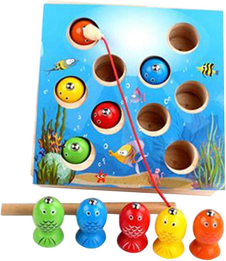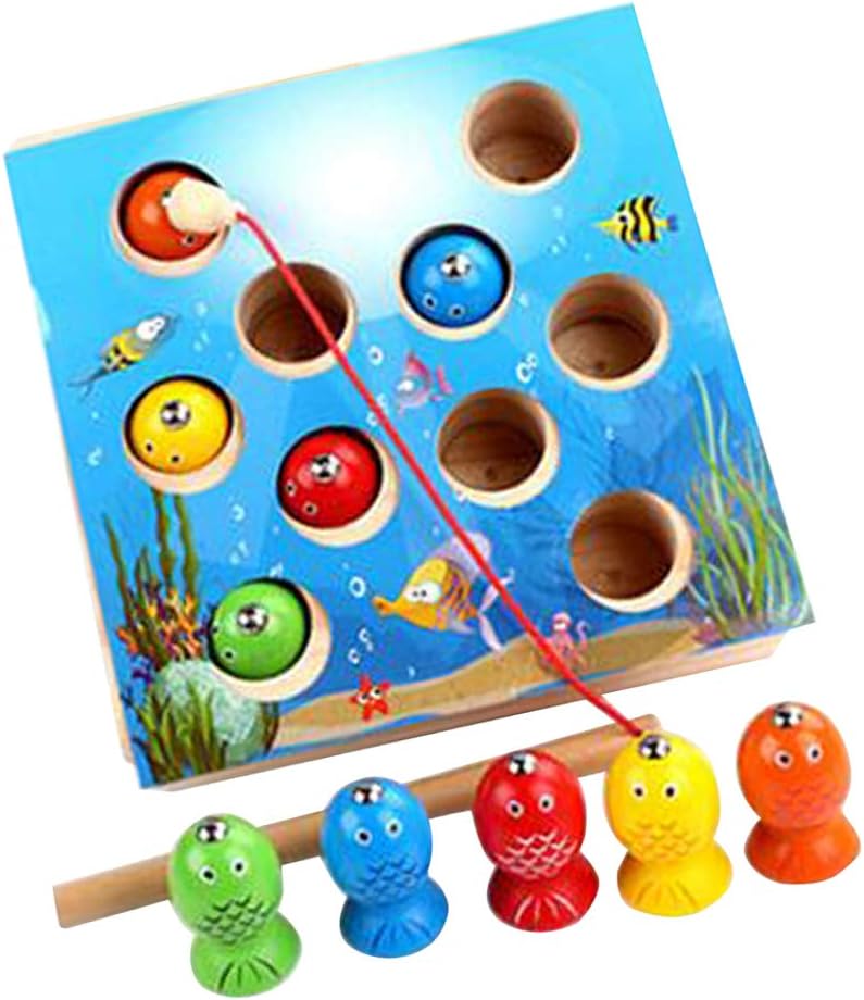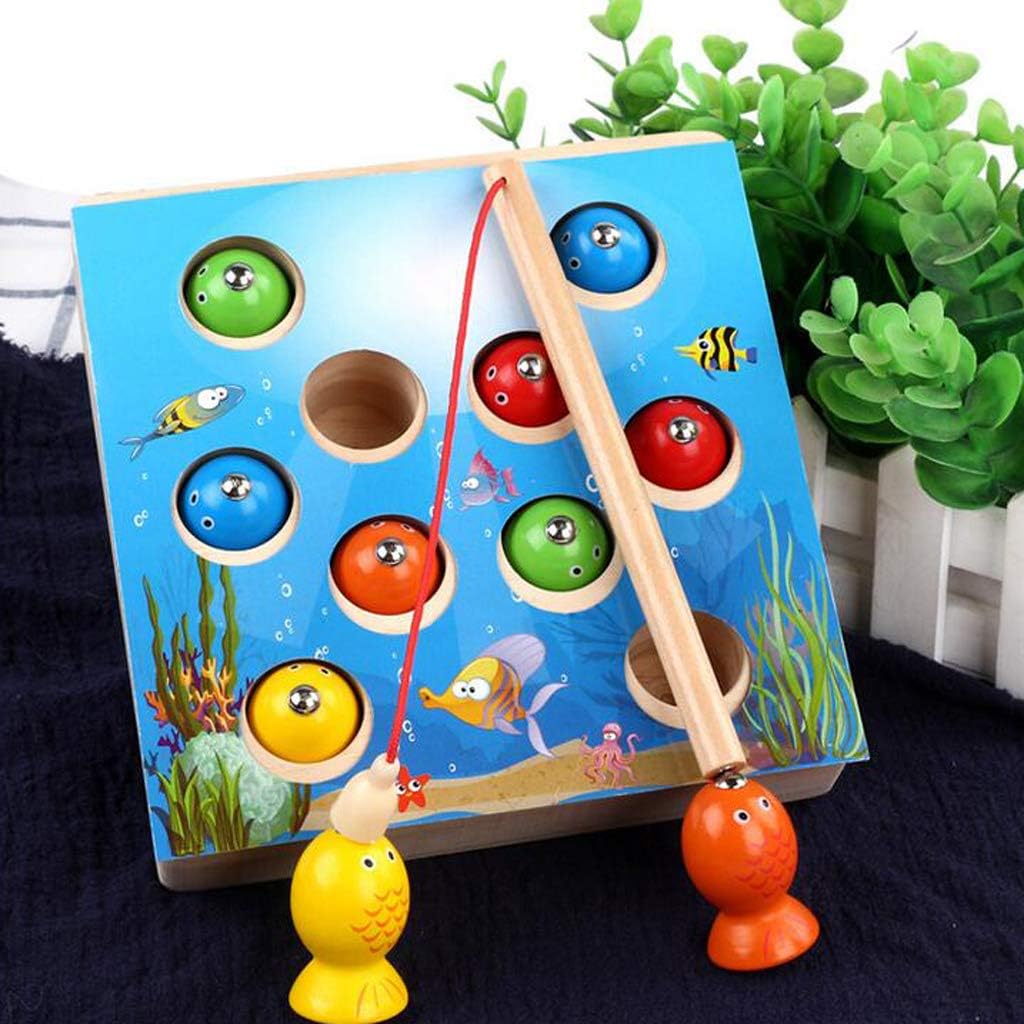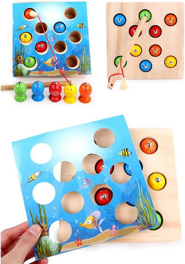 Gioco di pesca per sviluppare pazienza, coordinazione di mani e occhi, cognizione di colori e forme, dei numeri. Viene fornito con 10 pezzi di pesce sulla scatola da pesca e 1 canna da pesca. Giocattoli creativi di legno del gioco magnetico di pesca per l'apprendimento in anticipo dei bambini / del bambino. Colori vivaci e design di immagini di cartoni animati per attirare interessi dei bambini. educativo in legno per bambini in età prescolare.