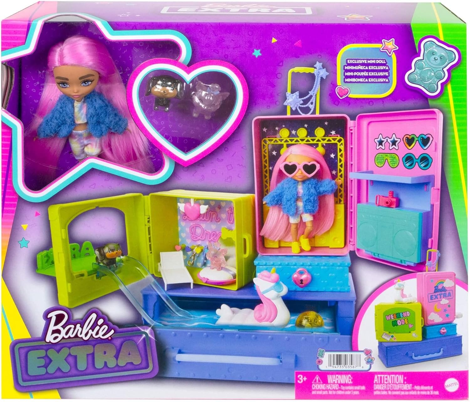 I bambini potranno ricreare feste EXTRA-ordinarie ovunque grazie a questa Barbie Extra Travel Box con animali domestici e accessori per le feste! Questa scatola a tema viaggi e feste è dotata di maniglia per il trasporto e rivela al suo interno 4 spazi di gioco per immaginare serate indimenticabili. Organizza la festa del secolo con 2 adorabili cuccioli e un'esclusiva bambola Mini Barbie Extra dal look straordinario: lunghi capelli rosa, un completo tie-dye, una giacca di pelliccia e altri accessori. Apri la scatola per rivelare una pista da ballo, un'area di restyling, una terrazza, una piscina con scivolo, un ascensore a forma di nuvola che va su e giù e altro ancora, il tutto delle dimensioni perfette per le bambole e gli animali domestici Mini Barbie Extra! Ispira i bambini con migliaia di storie di vacanze con accessori a tema come 2 sedie a sdraio, un anello di unicorno rimovibile, un pallone da spiaggia, 2 spazzole per capelli, un portacipria con specchio, occhiali da sole e una macchina fotografica. Questo set Barbie Extra Viaggio è un'ottima idea regalo per i bambini dai 3 anni in su, soprattutto se amano distinguersi!