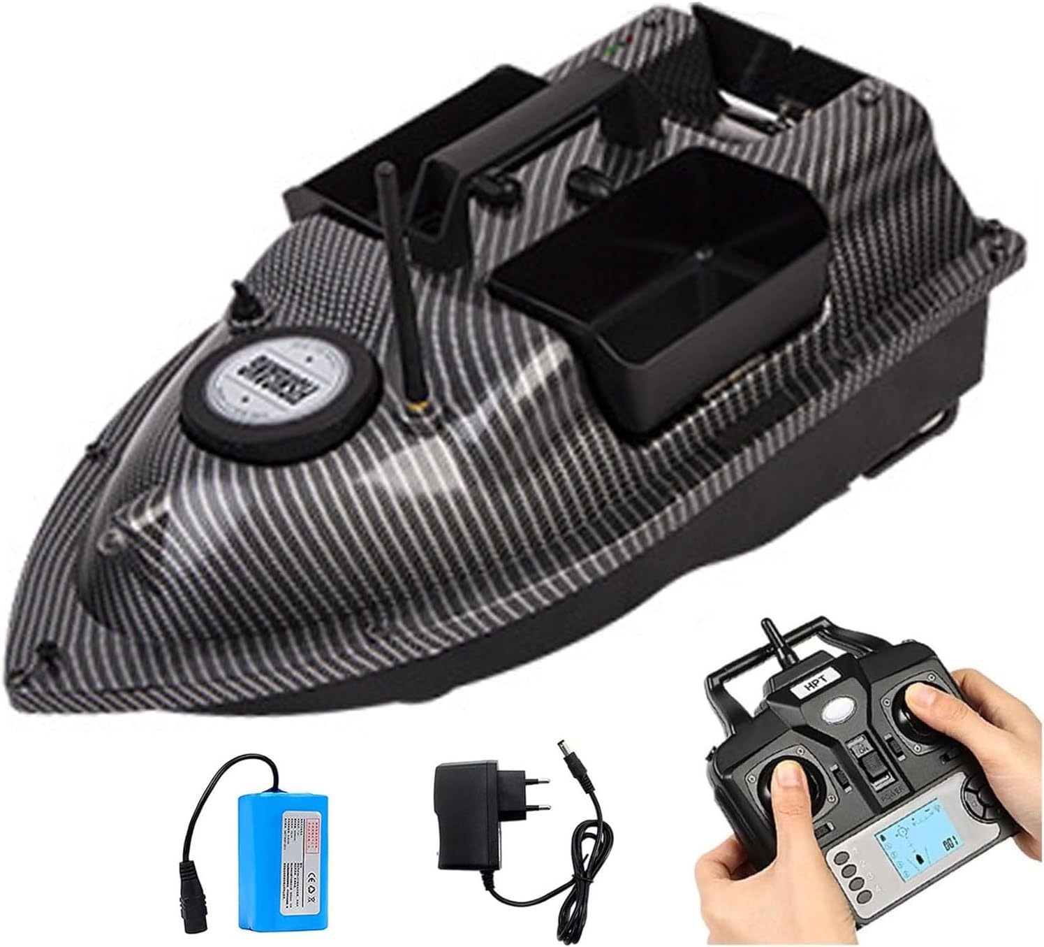 One Key Cruise: barca telecomandata con funzione cruise control. Correzione automatica dello sterzo, nessuna imbardata. Carico grande da 2 kg: è possibile trasportare contemporaneamente diversi pesi di esca da 2 kg. Varietà di acque: la barca telecomandata può navigare in sicurezza in varie acque di fiumi, laghi e mari. Due motori: tre eliche e un doppio motore forniscono una forte potenza alla barca telecomandata. Telecomando 2.4G: segnale anti-interferenza potenziato da 500 m. Distanza di posizionamento del telecomando: 500 metri.