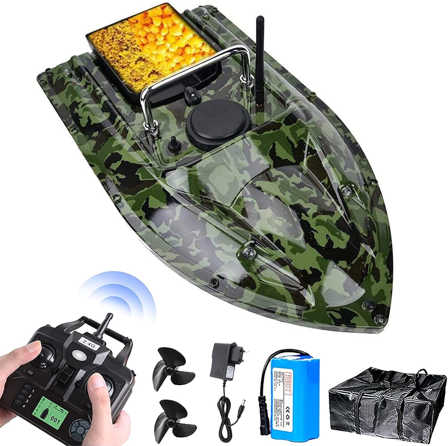 (Rilevamento della distribuzione dei pesci): la nostra barca da mangiatoia è dotata di un ecoscandaglio intelligente che, utilizzando il posizionamento del sonar, riconosce le condizioni e il contorno del fondo dell'acqua in tempo reale. Se la temperatura dell'acqua viene visualizzata in °C o °F, i simboli dei pesci indicano, determinano la posizione e la profondità dei pesci. La ricezione del segnale dell'ecoscandaglio è di 100 me l'intervallo di profondità di misurazione: 0,6-36 m. (Adattarsi a una varietà di ambienti): la barca a motore è dotata di doppi motori ed eliche a tre ali che forniscono molta forza per i viaggi veloci., una forma monopezzo completamente chiusa e uno scafo anticollisione adatto a una varietà di ambienti. acque. (Batteria al litio ad alte prestazioni): il motoscafo funziona con una batteria al litio da 10.000 mAh. Può essere caricato separatamente ed è facile da installare. Dopo ogni ricarica completa, la batteria da 10.000 mAh può essere utilizzata per circa 4-5 ore. Il rilevatore può essere caricato tramite USB. Puoi scegliere un altro numero di batterie di backup in base alle tue esigenze.