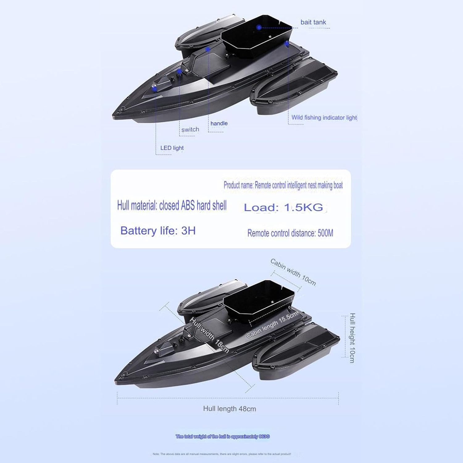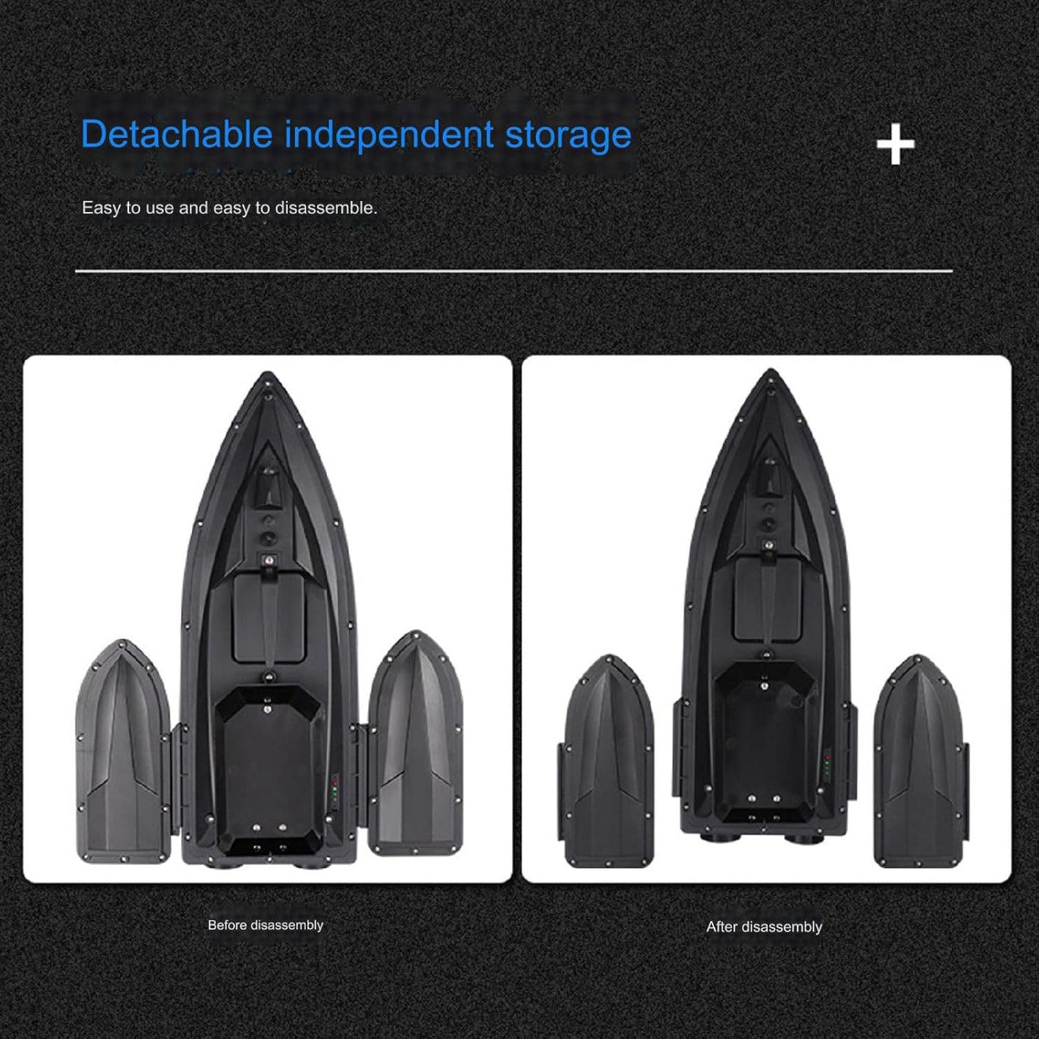 MATERIALE: La nostra barca esca è realizzata in plastica ABS, con un corpo impermeabile e anti-collisione, che può resistere a forti venti e onde e offre prestazioni di lunga durata. Può resistere a forti venti e onde ed è esteticamente gradevole. Il fondo a forma di M può ridurre le vibrazioni. DESIGN A DOPPIO GUSCIO: il guscio del motore per impieghi gravosi adotta un design a doppio motore, che funziona più velocemente e la capacità di carico può raggiungere circa 1,5 kg e i due lati sono bilanciati per ottenere una buona stabilità dell'equilibrio PESCA NOTTURNA: Questa barca da pesca è dotata di luci a LED per ampliare il raggio visivo durante la pesca notturna. È possibile valutare facilmente la direzione di navigazione, garantire un'esca precisa e catturare carpe con successo. TELECOMANDO: distanza di controllo remoto di 500 m senza interferenze, il segnale è più stabile in un ambiente pulito. La barca esca è dotata di un sistema di bilanciamento automatico. Quando la barca devia a causa di vento e onde eccessivi durante la navigazione, correggerà automaticamente la deviazione per mantenere la barca in movimento in linea retta.