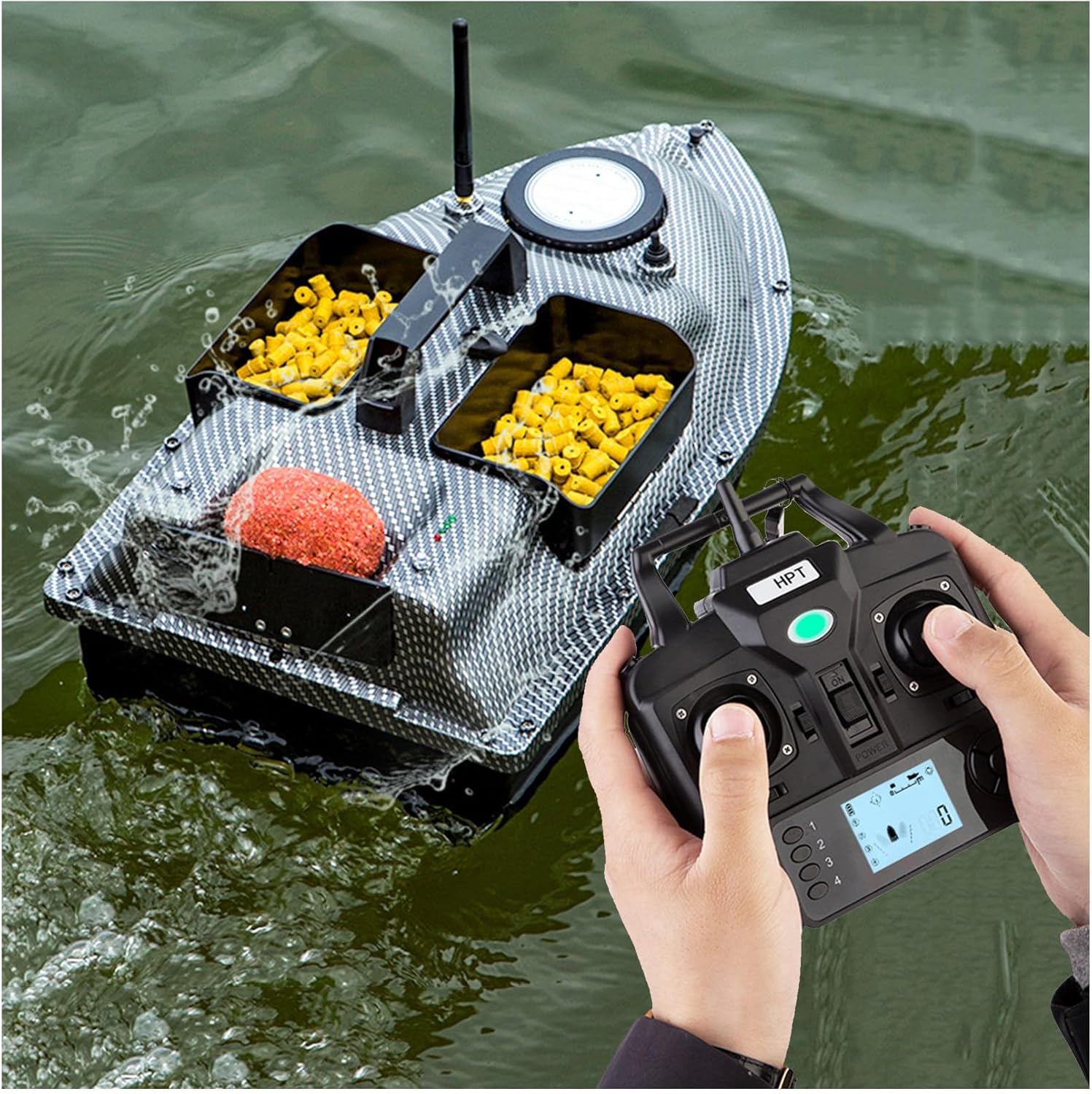 Ritorno One-Touch (versione GPS). È possibile impostare il punto di partenza e premere il pulsante "Ritorno One-Touch" per tornare al punto di partenza. Semplice da usare e facile da controllare. Potenza potente: tre eliche e due motori forniscono una potenza potente alla barca RC. Telecomando 2.4G: segnale anti-jamming potenziato a 500 m. Distanza di posizionamento remoto di 500 m. Un pulsante per qualsiasi punto (versione GPS). La versione GPS del telecomando consente di impostare 3 punti di posizionamento arbitrari, che possono essere spostati avanti e indietro a piacimento. Acque versatili. La barca radiocomandata può navigare in sicurezza in diverse acque di fiumi, laghi e mari.