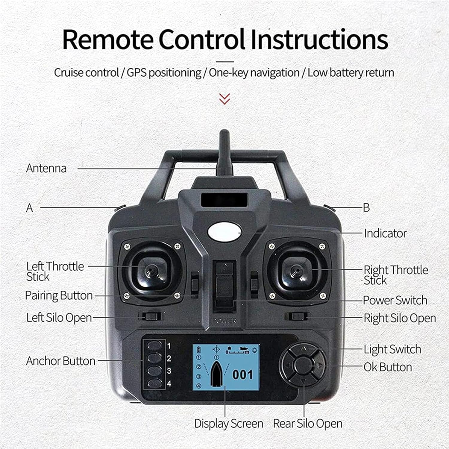 Ritorno One-Touch (versione GPS). È possibile impostare il punto di partenza e premere il pulsante "Ritorno One-Touch" per tornare al punto di partenza. Semplice da usare e facile da controllare. Potenza potente: tre eliche e due motori forniscono una potenza potente alla barca RC. Telecomando 2.4G: segnale anti-jamming potenziato a 500 m. Distanza di posizionamento remoto di 500 m. Un pulsante per qualsiasi punto (versione GPS). La versione GPS del telecomando consente di impostare 3 punti di posizionamento arbitrari, che possono essere spostati avanti e indietro a piacimento. Acque versatili. La barca radiocomandata può navigare in sicurezza in diverse acque di fiumi, laghi e mari.