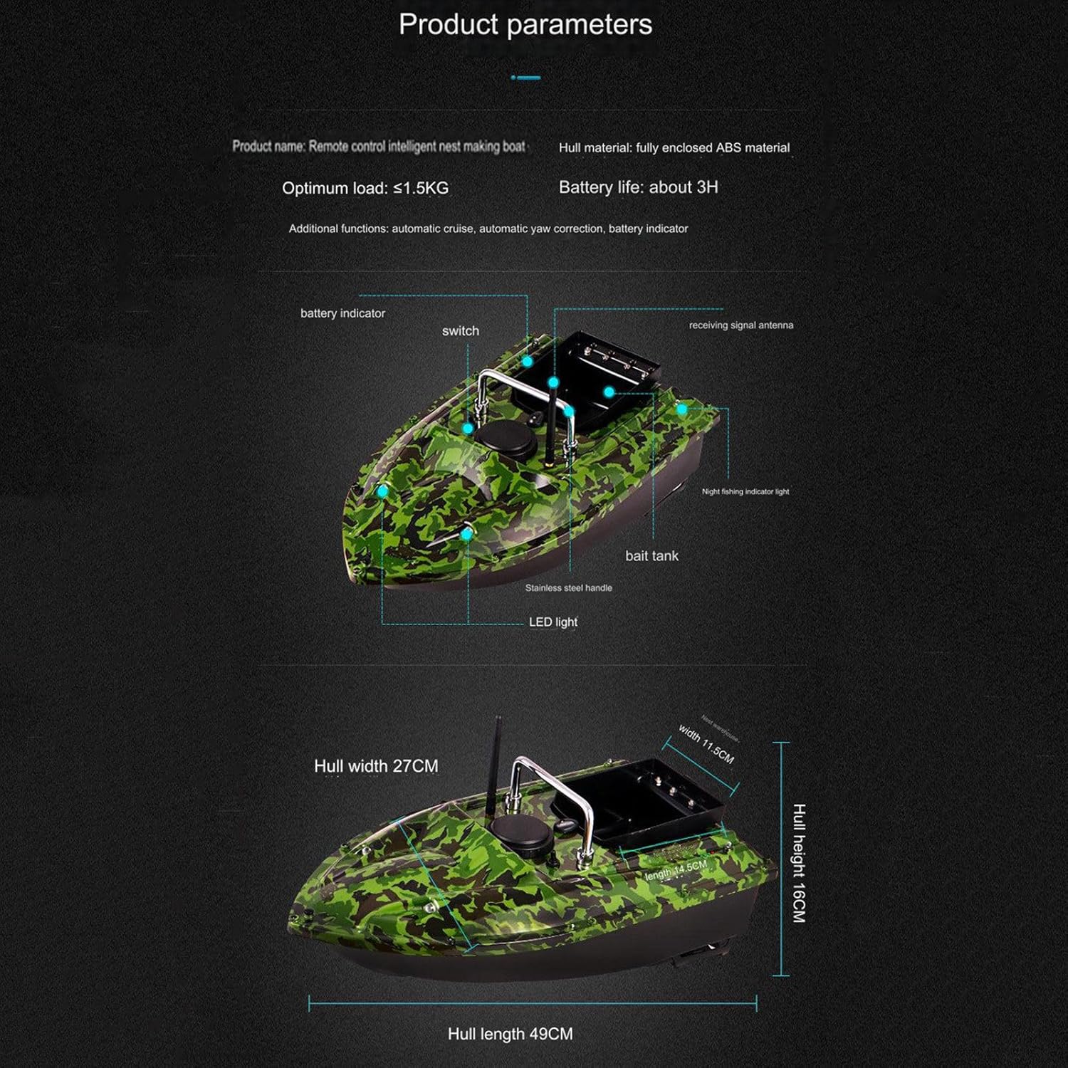 MATERIALI: La barca esca telecomandata è realizzata in ABS di alta qualità mediante stampaggio a iniezione. Presenta un'eccellente resistenza agli urti e all'usura, un design anticollisione e una sigillatura per proteggere in modo sicuro la batteria. CORREZIONE AUTOMATICA DELL'IMBARCAZIONE: sistema di bilanciamento automatico integrato, che può aiutare a correggere automaticamente l'imbardata e garantire che la barca mantenga la linea retta sotto vento/onde e carico TELECOMANDO: La portata della barca esca è di 400-500 metri. Può essere posizionata in stagni e laghi. Il segnale del telecomando è persistente e stabile, senza interferenze, permettendoti di godere della comodità della tecnologia. PORTATILE E VERSATILE: facile da trasportare, adatto a carichi di grandi dimensioni, scomparto indipendente può sopportare 1,5 kg, correzione automatica della rotta, non teme interferenze del vento e delle onde