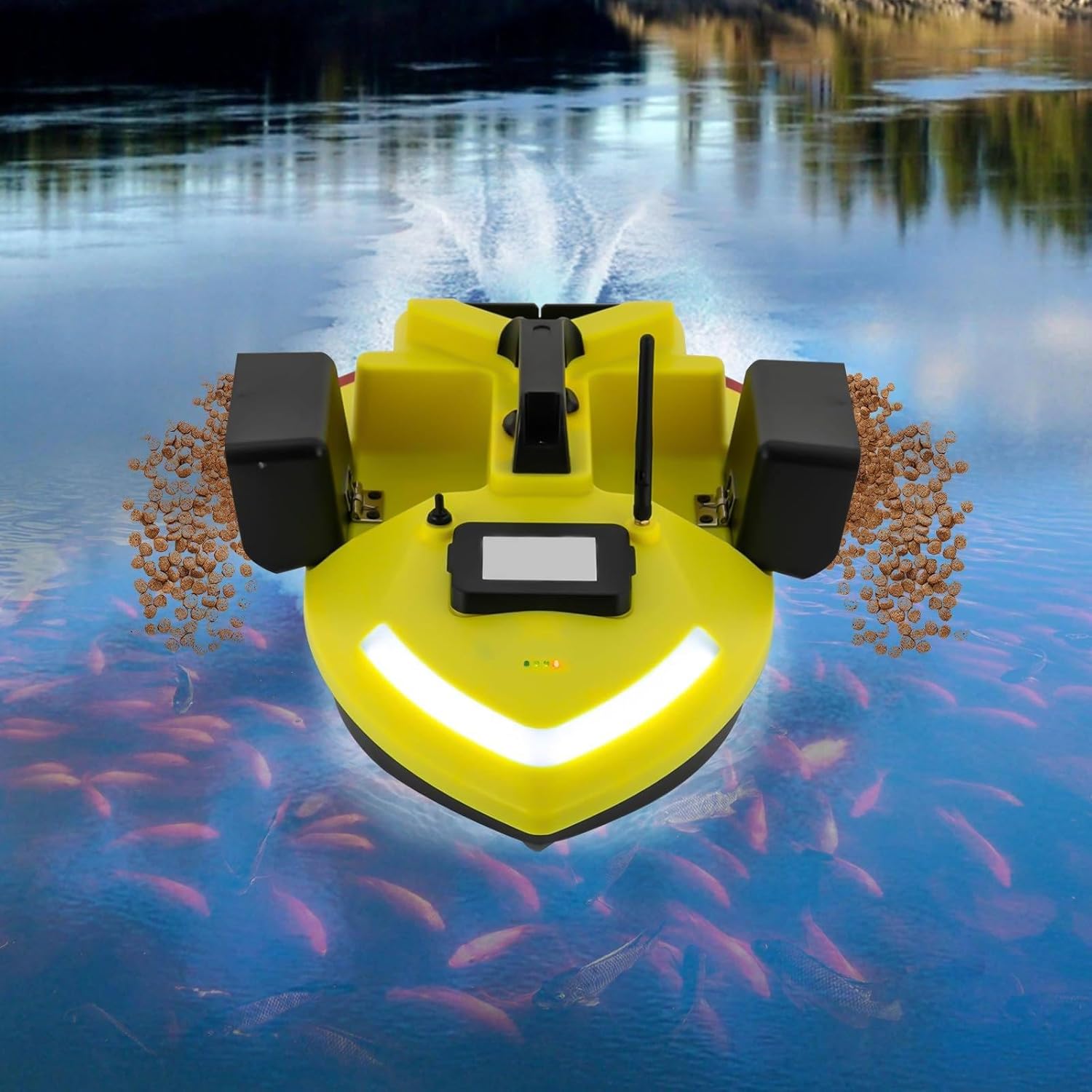 【Potenza potente】: la barca da pesca telecomandata adotta un potente design a doppio motore per fornire potenza sufficiente alla barca ed è dotata di un'elica a tre pale per aumentare la spinta e l'area delle pale nell'acqua, rendendo la potenza forte e la barca telecomandata viaggia veloce. Batteria al litio da 12000 mAh, ricarica più rapida e più durevole. 【Buone prestazioni】: la barca esca adotta una frequenza di controllo di 2,4 G e la distanza del telecomando può raggiungere i 1640,42 piedi. La barca da pesca è dotata del sisteme di calibrazione automatica Beidou e del sistemad di posizionamento GPS; è possibile impostare 40 punti di posizionamento per garantire un posizionamento accurato e migliorare l'efficienza della pesca. 【Elevata sicurezza】: il livello di potenza della barca da pesca con rilascio dell'esca viene visualizzato sullo schermo del telecomando. Se la batteria dell'imbarcazione per un lungo periodo, le luci dell'imbarcazione lampeggeranno, e l'imbarcazione tornerà automaticamente in posizione. Allo stesso tempo, lo scafo lineare riduce la resistenza all'acqua e la resistenza alla formazione di onde raggiunge il livello 7-8, garantendo la sicurezza durante il funzionamento e l'uso. 【Correzione automatica del prezzo】: la piccola barca da pesca è dotata di un sistemas di bilanciamento automatico integrato, in grado di correggere in modo intelligente il percorso di guida per garantire che l'esca mantenga una velocità uniforme e una linea retta in presenza di ventos, onde e carico. 【Design intelligente】: la barca RC ha tre scomparti per esche controllabili indipendentemente con una capacità di carico di circa 4,41 libbre, che consentono di controllare l'applicazione del nido a piacimento. Il contenitore posteriore dell'esca è inoltre dotato di un design anti-manomissione che consente di estrarre l'amo dalla lenza ed evitare che questa si aggrovigli.