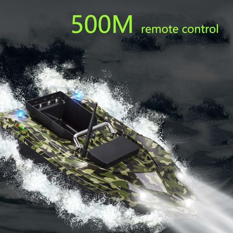 Batteria ad alta capacità: dotata di tre batterie da 12000 mAh, ciascuna fornisce 4-6 ore di funzionamento continuo per sessioni di pesca prolungate senza ricariche frequenti. Comodi ganci per il trasporto: sono dotati di ganci per il trasporto facili da usare per un posizionamento preciso dell'esca, integrati da un telecomando fino a 500 m, incluso il ritorno intelligente con un solo tocco e la crociera automatica per una pesca senza sforzo. Capacità di pesca notturna: gli indicatori LED integrati illuminano la barca per le operazioni notturne, consentendo una chiara visibilità della direzione di navigazione e garantendo un lancio accurato dell'esca in condizioni di scarsa illuminazione. Portata estesa del segnale: l'imbarcazione telecomandata ha una portata di ricezione del segnale di 300-500 m, garantendo un funzionamento affidabile, sebbene le prestazioni possano variare a seconda degli ostacoli o delle interferenze del segnale. Design impermeabile e durevole: progettato con doppio motore impermeabile e copertura impermeabile, garantisce protezione contro l'ingresso di acqua e migliora la durata per l'uso a lungo termine in vari ambienti di pesca.