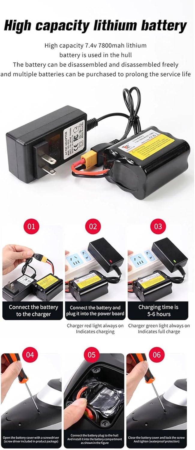 TECNOLOGIA WIRELESS 2.4GHZ: circuito speciale e telecomando dedicato con modulazione di frequenza automatica digitale, risolvono completamente l'interferenza tra la navigazione multi-trasmissione; la distanza del telecomando può raggiungere i 500 M LUCI DI NAVIGAZIONE NOTTURNE CONTROLLABILI: adottano il design di luci bicolore anteriori e posteriori controllabili a lunga distanza, che possono confermare chiaramente la posizione della nave a lunga distanza e fornire un buon ambiente di illuminazione nei giorni e nelle notti nuvolose per determinare il punto di posizionamento BATTERIA AL LITIO AD ALTA CAPACITÀ: Lo scafo adotta una batteria al litio ad alta capacità da 7,4 V e 7800 mAh. La batteria può essere smontata e rimontata liberamente. Dopo una carica, può soddisfare le esigenze di più viaggi di andata e ritorno per posizionare i materiali di nidificazione, riducendo il problema delle ricariche frequenti. PROTEZIONE DI SICUREZZA: quando la barca è bloccata tra le alghe, il motore si fermerà automaticamente per 15 secondi e il controller deve essere riavviato e proteggere efficacemente tutte le parti dello scafo
