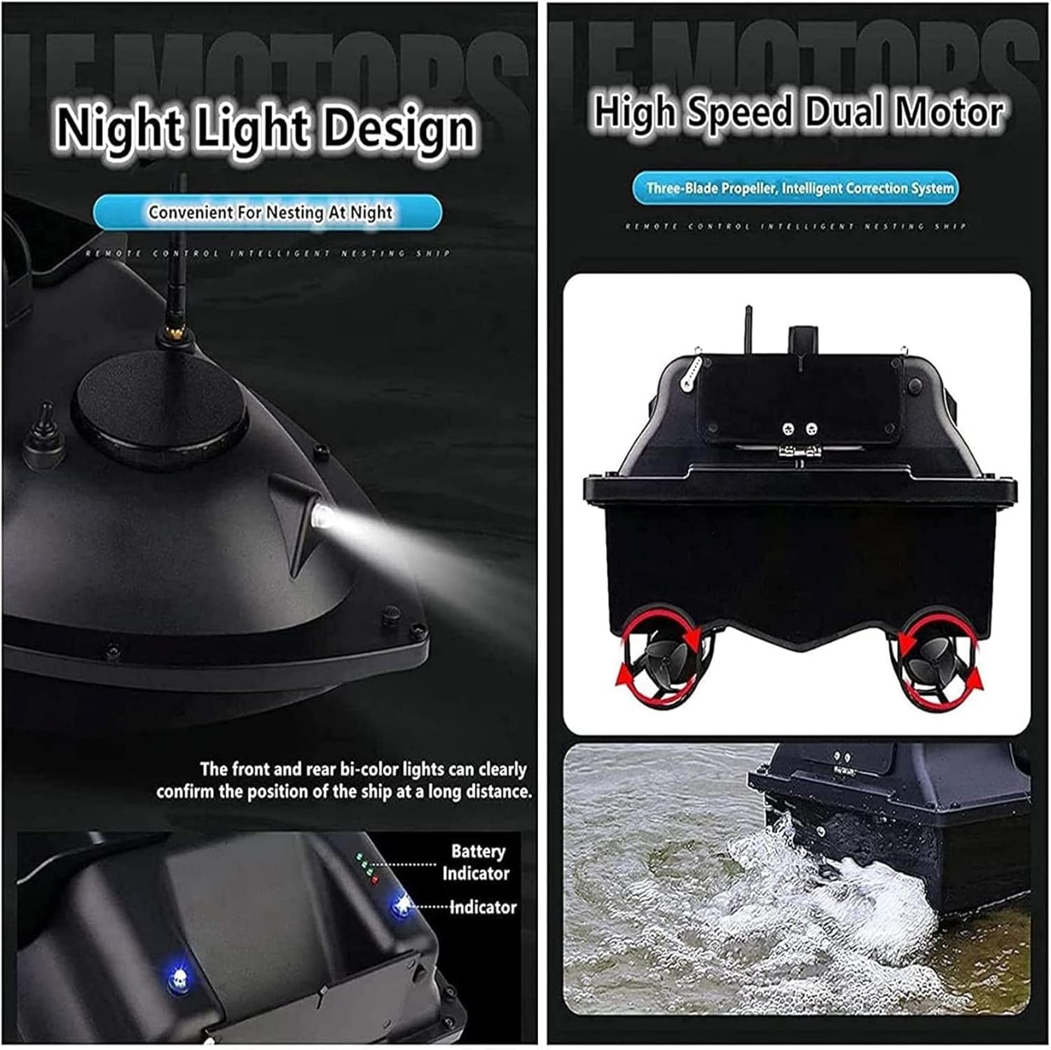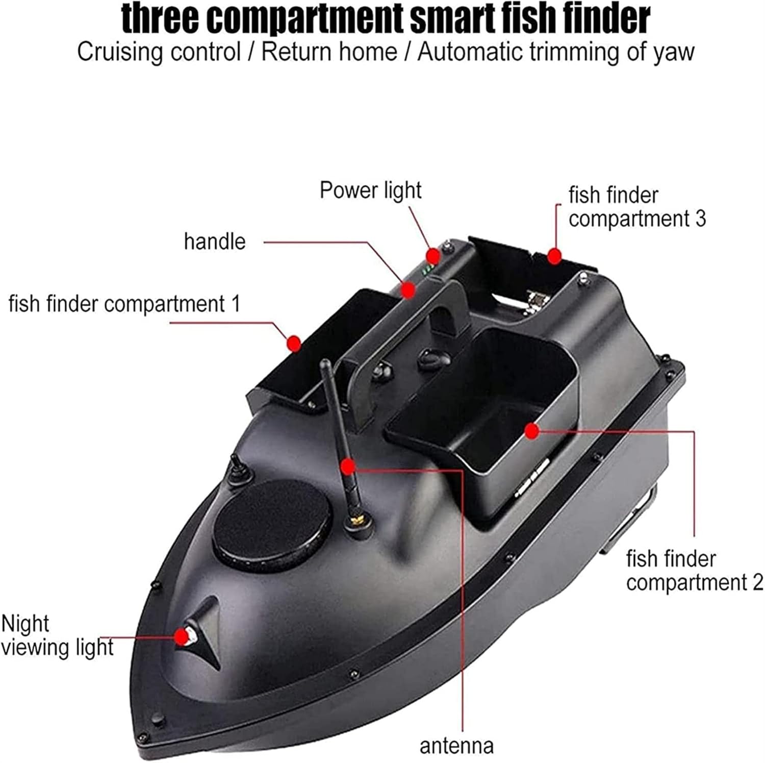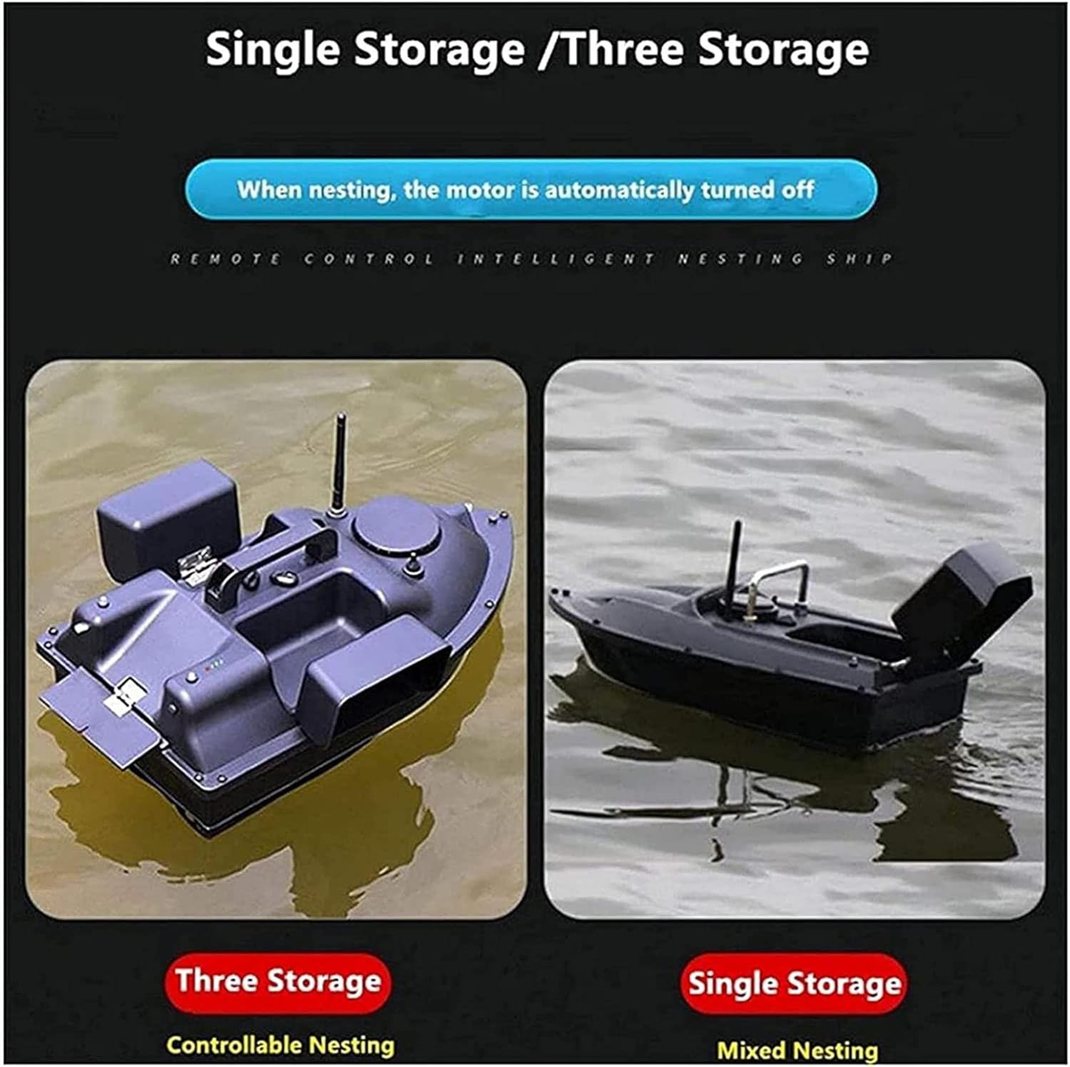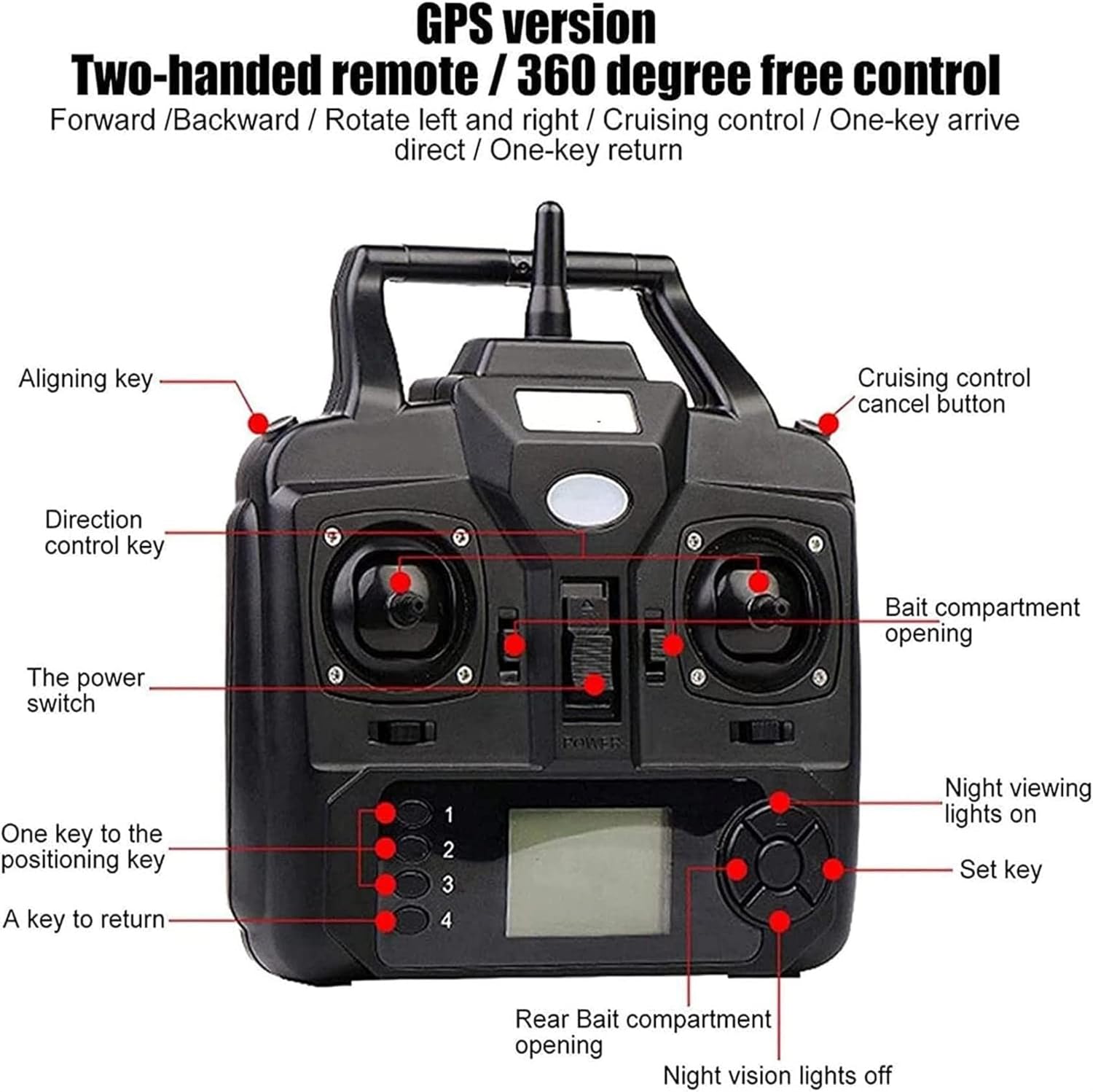 [Ritorno a casa tramite GPS]: con funzione di navigazione GPS. Il telecomando LCD può impostare 1 posizione di partenza e 3 punti di ancoraggio, consentendo al gommone di muoversi tra i 3 punti di ancoraggio. In caso di perdita del segnale o di batteria scarica, il gommone tornerà automaticamente alla posizione originale dopo 15 secondi. Lo schermo del telecomando mostrerà il livello della batteria, la bussola e i metri di navigazione del gommone! [Ricezione del segnale a 500 m]: Con una distanza di controllo remoto di 500 m in caso di interferenza del segnale, è possibile portare l'esca a un banco di pesci denso senza preoccuparsi di una distanza di controllo remota eccessiva. La tensione della batteria è di 7,4 V e la corrente è di 12000 V, che può essere utilizzata ininterrottamente per circa 2 ore! ! ! [Luce di navigazione notturna controllabile]: la luce bicolore anteriore e posteriore può essere controllata a distanza per determinare chiaramente la posizione dell'imbarcazione a distanza, fornendo un ambiente di illuminazione ottimale nelle giornate nuvolose e di notte. Identifica i punti di ancoraggio di notte. La luce dell'esca può essere regolata verso l'alto o verso il basso per facilitare la pesca notturna e attirare l'attenzione dei pesci. [Unità di stoccaggio esche di grande capacità]: La barca porta esche è dotata di una struttura a doppio motore. La barca porta esche è dotata di 3 contenitori per esche con una capacità di carico di circa 2 kg, controllabili individualmente. La barca porta esche è stampata a iniezione in materiale ABS di alta qualità, completamente dotata di serbatoio, con uno scafo ampio, un baricentro stabile e non teme vento e onde. [Barca esca telecomandata ideale]: la barca esca telecomandata è una scelta eccellente e uno strumento pratico per la pesca in fiumi, laghi o acque poco profonde. Con funzioni di rotazione avanti/indietro, sinistra/destra e di esca, è adatta ad appassionati di pesca e pescatori.