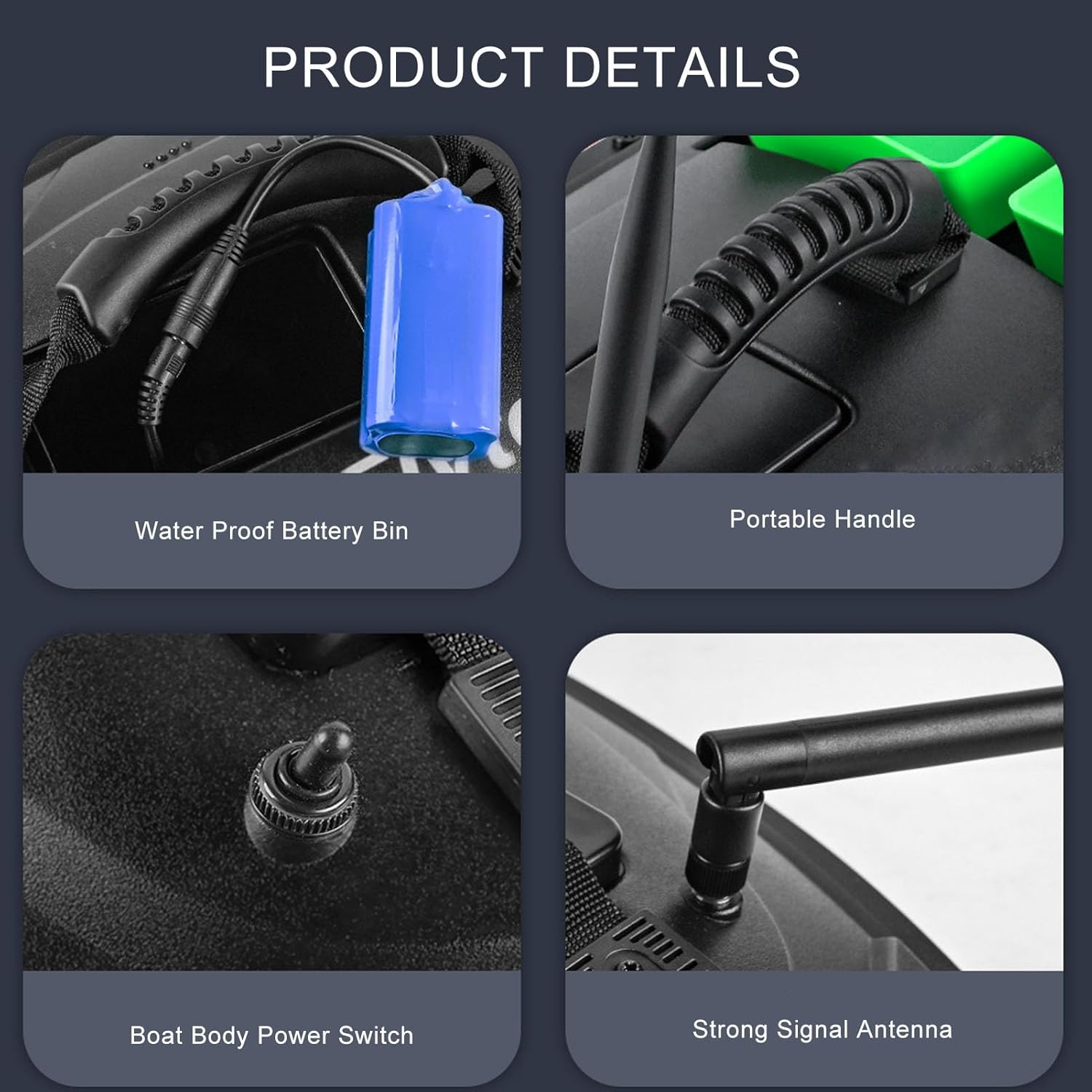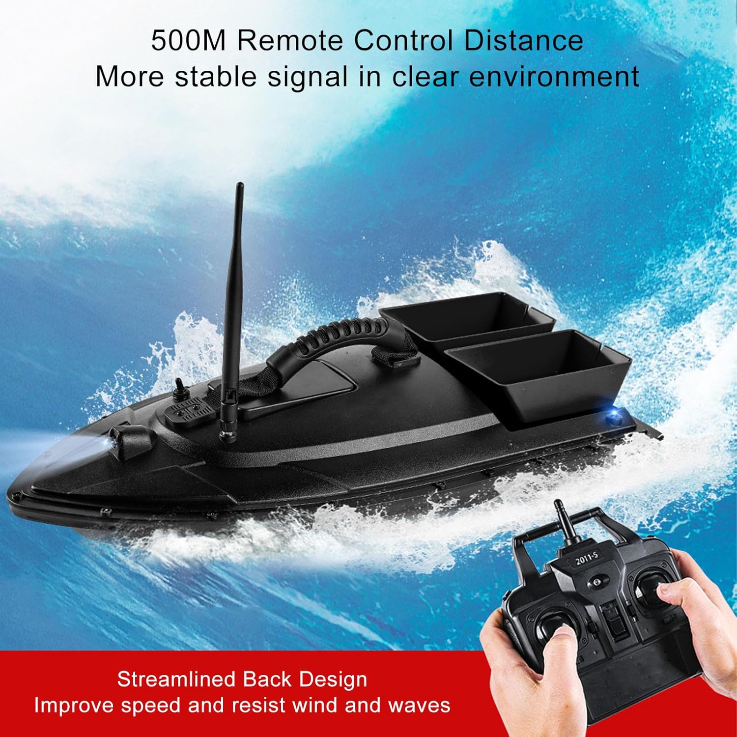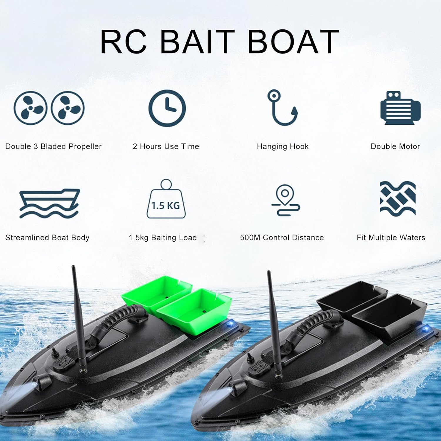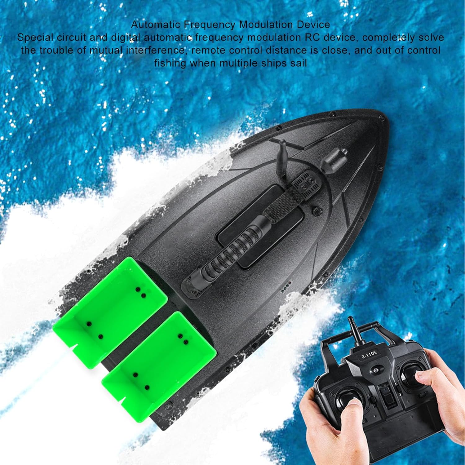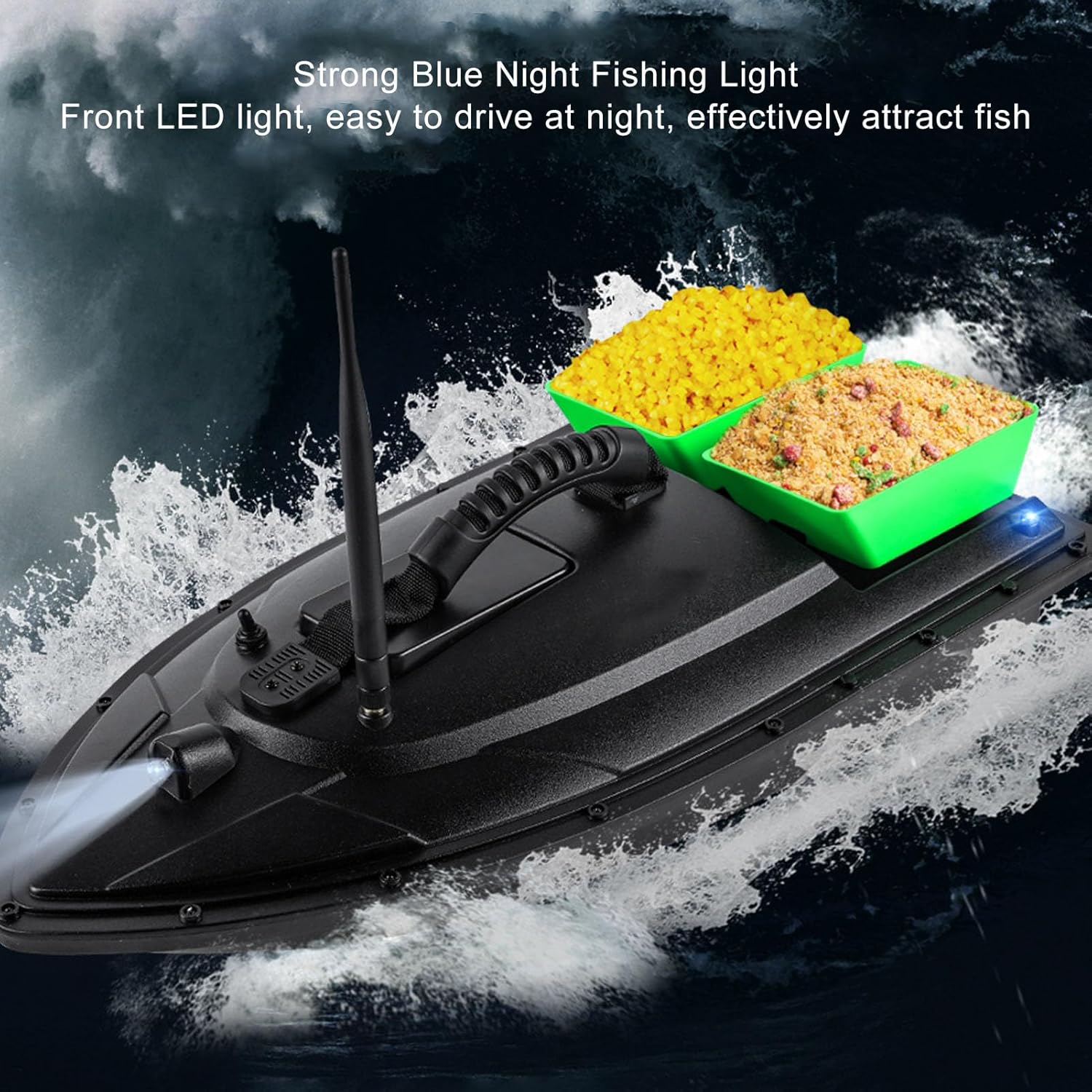 Doppi motori: questa barca da pesca telecomandata è dotata di doppi motori e un design resistente, che fornisce una potenza elevata. Dotato di copertura impermeabile, impedisce efficacemente che erbacce e altri detriti interferiscano con l'. Contenitori per esca doppi: forniscono 2 contenitori per esca indipendenti, con una capacità di carico di circa 1,5 kg. Design a contenitore aperto, ogni contenitore per l'esca può essere aperto individualmente per l'esca, con impostazione flessibile, adatto per ambienti di pesca con ampie zone d'acqua. Telecomando da 500 M: questo peschereccio RC supporta il controllo remoto senza ostacoli entro un raggio di 500 metri, con un segnale ampio e stabile, che consente di non essere vincolati dalla lenza e di migliorare notevolmente l'efficienza della pesca. Plastica ABS: il corpo principale della barca da esca è realizzato in materiale tecnico ABS mediante stampaggio a iniezione una tantum, che ha una forte resistenza agli urti e all'usura e una lunga durata. Bello e generoso, robusto e stabile. Batteria di grande capacità: questo kit viene fornito con una batteria al litio da 12000 mAh che può durare 4 ore di navigazione continua, con basso rumore e basso consumo energetico. La batteria è posizionata nel contenitore centrale della barca per un eccellente equilibrio e stabilità.
