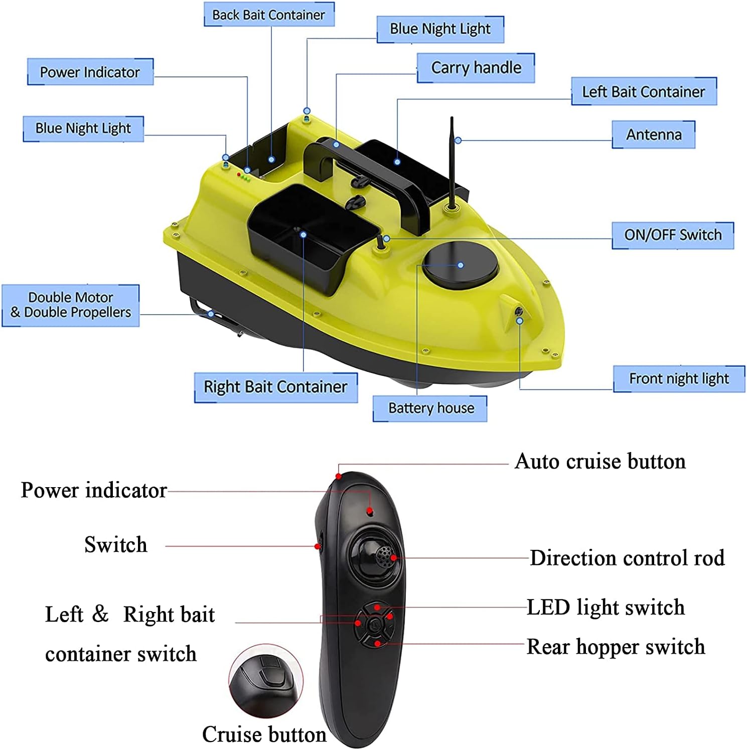 Nuovissimo design intelligente della barca con esche da pesca, con maniglia del telecomando a 1 mano, telecomando da 400-500 m, nessuna interferenza per migliorare il segnale. Dotato di un giroscopio intelligente, verrà calibrato automaticamente quando si cambia direzione e la direzione può essere calibrata automaticamente quando viene imbardata in caso di vento forte e onde, risparmiando tempo e fatica 3 contenitori per esche possono essere controllati in modo indipendente, il che può evitare il rilascio singolo di esche diverse e realizzare un posizionamento multi-punto Vengono utilizzati doppi motori ad alta velocità ed eliche a tre pale, che sono più potenti e il carico massimo è di circa 2 kg La nostra barca RC per la pesca è realizzata in materiale ABS. Lo scafo è grande, il centro è stabile e non è facile capovolgersi. L'intera struttura è completamente sigillata e ha ottime prestazioni. La prua è inoltre dotata di luci a LED, utilizzabili anche di notte Servizio: Se avete domande su questo prodotto, non esitate a contattarci, vi risponderemo entro 24 ore!