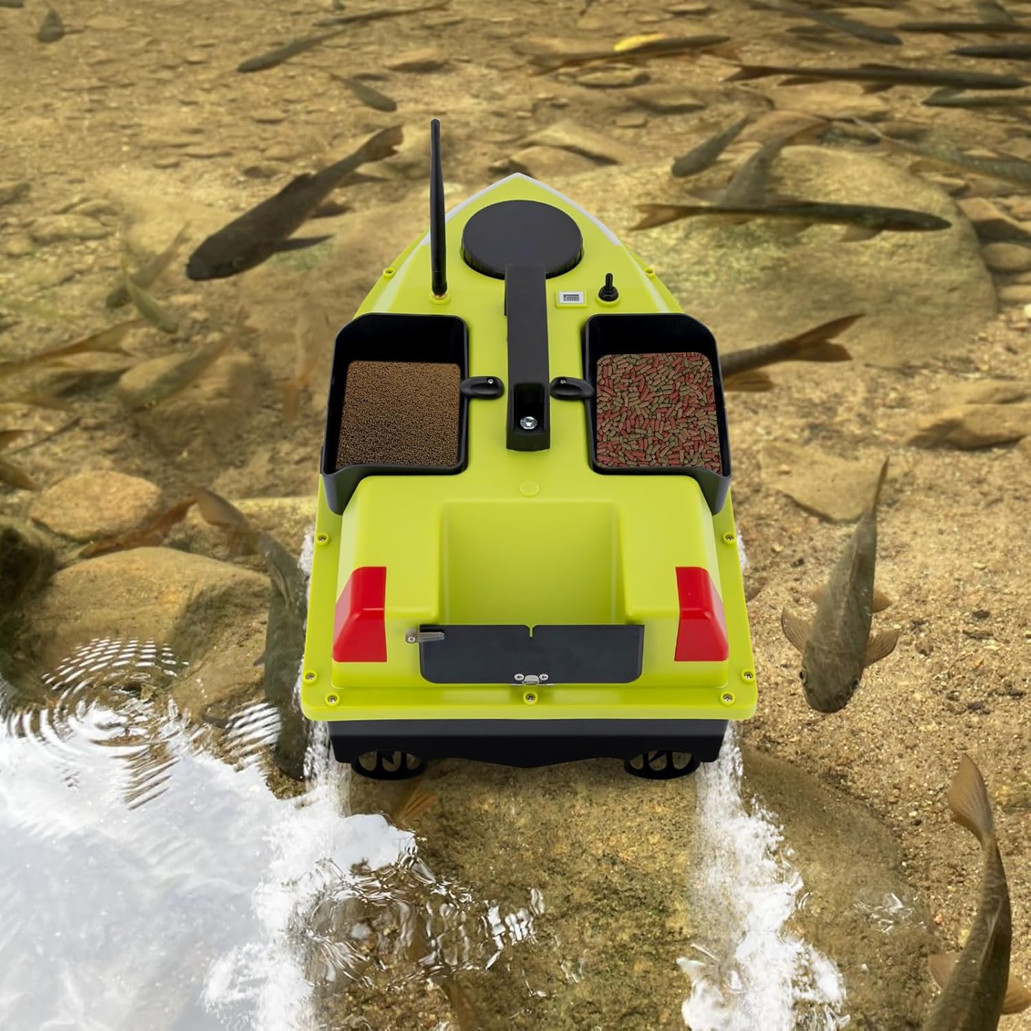 Robusto e durevole: è realizzato in ABS di alta qualità realizzato con processo di sabbiatura. Questo lo rende antigraffio, impermeabile, resistente all'usura, che garantisce una lunga durata. Goditi la tua pesca: è alimentato da due motori 390 con una potenza di 52 W, una velocità massima di 10.000 giri/min, una velocità di guida di 5,91 ft/s e 99 punti da traina. Inoltre, i tre contenitori possono contenere fino a 4,4 libbre, che a loro volta possono essere caricati con mais, esche ed esche artificiali, consentendo un'esperienza di pesca precisa ed efficiente nelle tue spotting! Shine in the Dark: adotta luci di navigazione notturna a LED, una striscia luminosa regolabile in sette colori (blu, bianco, rosso, verde, viola, arancione, giallo) che possono essere controllate manualmente commutando la striscia per controllare l'effetto dell'acqua che scorre, anche se si pesca di notte, è anche possibile osservare chiaramente la vostra barca da pesca esca e identificare la direzione nel tempo! Design pensato: lo scafo aerodinamico è completamente chiuso e impermeabile, il che riduce la resistenza all'acqua e rende la barca da pesca più stabile, mentre la copertura dell'elica impedisce all'esca di aggrovigliarsi nell'erba o nelle piante. Inoltre, la correzione automatica dell'imbardatura, la perdita di connessione e il ritorno automatico a batteria scarica assicurano che è possibile utilizzare in sicurezza la barca anche in ampie acque e il telecomando ti avvisa automaticamente quando il livello della batteria è basso. Libera le tue mani: il design ingegnoso del telecomando può essere utilizzato in un intervallo di circa 1968 piedi per soddisfare le tue esigenze, mentre lo schermo LCD è comodo per osservare il livello di potenza, segnale segnale GPS, promemoria posizione casa, luci di navigazione barca, punto di ritorno, punto di posizionamento, distanza, e una varietà di tasti precisi, ruote, ecc. possono aiutarti. il messo, torna al mare, posizionamento e così via.
