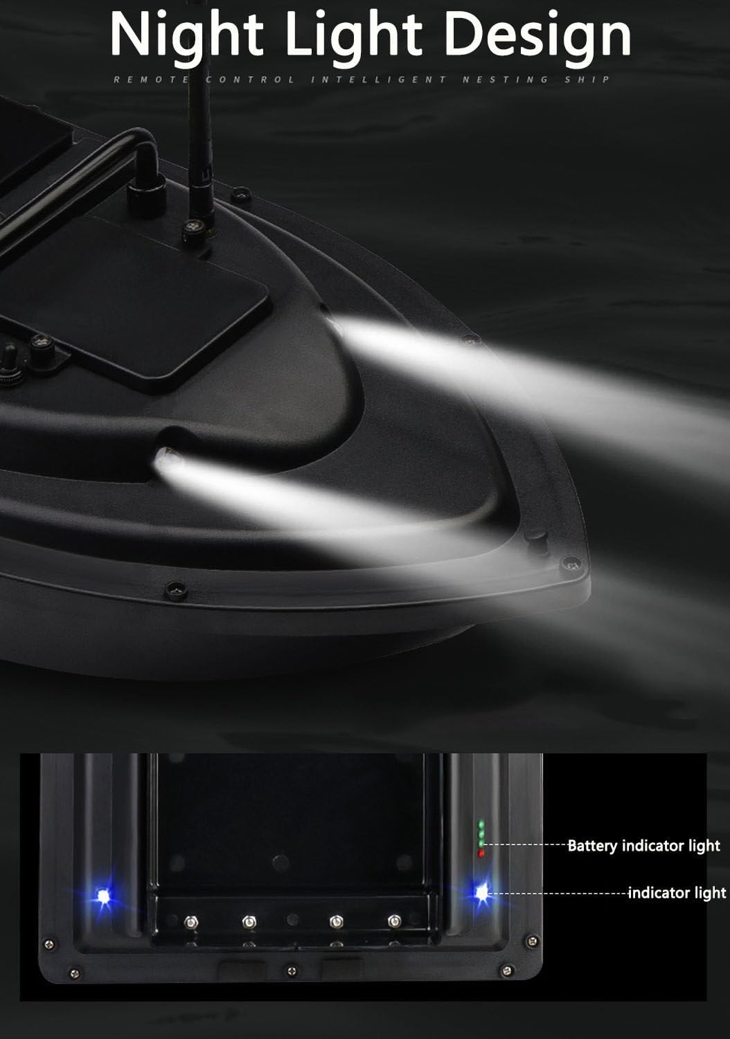 Barca con esca telecomandata da 500 m: rispetto ai metodi di pesca tradizionali, la barca con esca telecomandata è più precisa e più veloce. Può portare esche e ami nelle profondità del lago per pescare o posizionare esche. Spesso porta sorprese agli appassionati di pesca. 【Due potenti motori】: la barca da esca ha una funzione di crociera automatica. Assicurati che la barca possa viaggiare in linea retta a velocità costante, risparmiando tempo ed energia. La barca esca è dotata di due motori per controllare efficacemente la direzione di guida della barca esca telecomandata. Forte ricezione del segnale: la distanza del telecomando della nostra barca da esca può raggiungere circa 500 metri, può resistere a vento e onde di livello 7-8 ed è impermeabile. Il segnale del telecomando per la barca da esca è forte e puoi controllare la distanza semplicemente premendo i pulsanti sul telecomando. Doppia batteria da 19000 mAh: la barca da esca dotata di borsa per il trasporto ha 3-4 ore di durata della batteria e molta potenza. Questo alimentatore da pesca con telecomando wireless può trasportare 1,5 kg di esca, rendendo la pesca più semplice e conveniente. Luci da pesca notturne: la barca con esca è dotata di luci per la visione notturna, che facilitano la pesca notturna e consentono di vedere chiaramente la barca a distanza anche di notte. Rende la ricerca dei punti di pesca più precisa di notte.