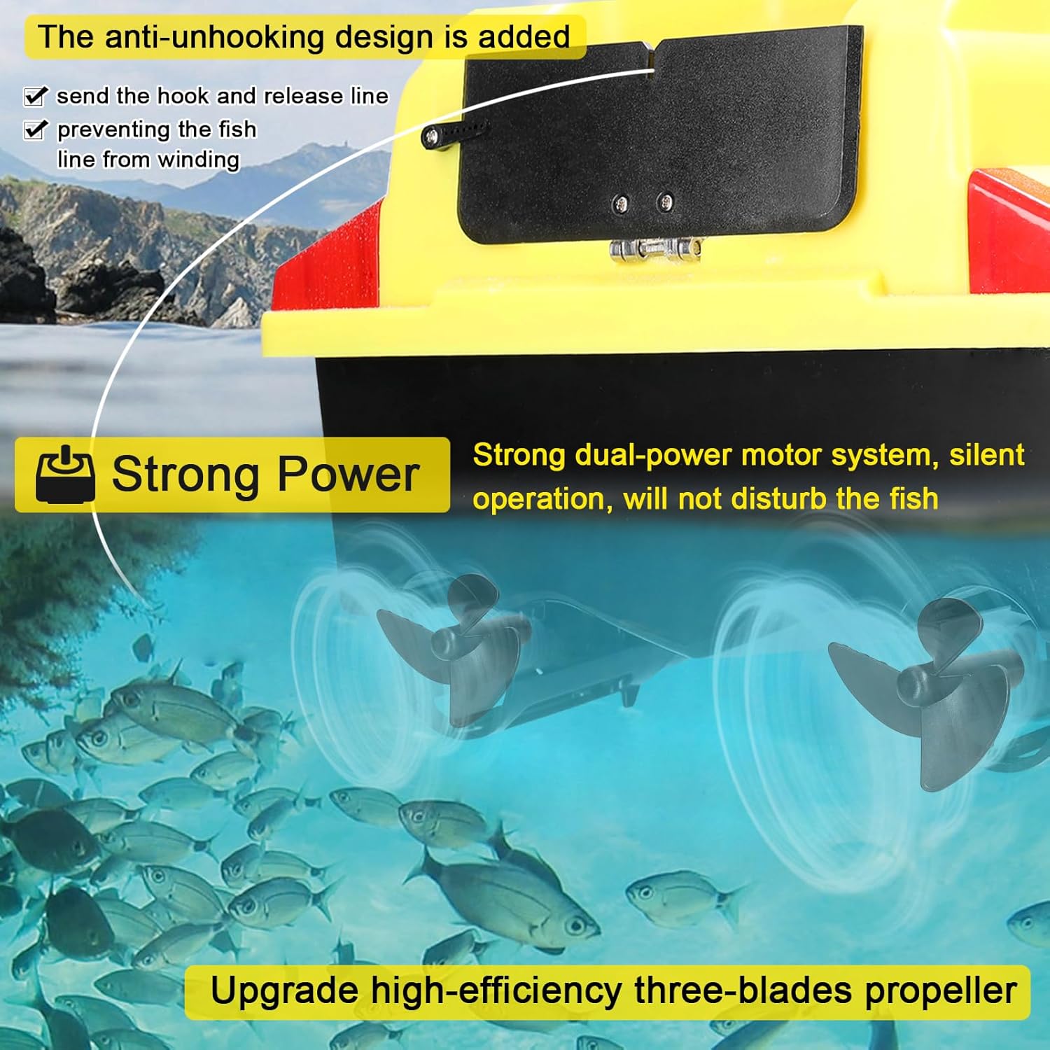 Ritorno automatico: la portata del telecomando è entro i 500 metri. Quando la batteria dell'imbarcazione è scarica, perde il segnale o supera i 500 metri, tornerà automaticamente. Non temere di perderlo. Cruise Control: basta un clic per attivare il sistema di cruise control e mantenere l'imbarcazione a una velocità costante e in linea retta, risparmiando tempo e fatica e liberando le mani. Crociera a punto fisso: sistema di posizionamento satellitare doppio Beidou/GPS, è possibile impostare 40 punti di posizionamento, a partire dal punto di partenza, per ottenere una crociera automatica verso la destinazione. Correzione automatica della rotta: sistema di bilanciamento automatico integrato, che può aiutare a correggere automaticamente l'imbardata e garantire che l'imbarcazione continui a procedere dritta nonostante il vento/le onde e il carico. Potenza elevata: potente sistema di motore a doppia potenza, funzionamento silenzioso, non disturberà i pesci. L'elica a tre pale ad alta efficienza migliorata può fornire potenza elevata e velocità di crociera elevata.