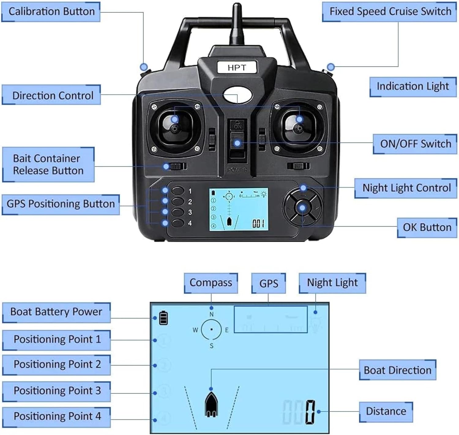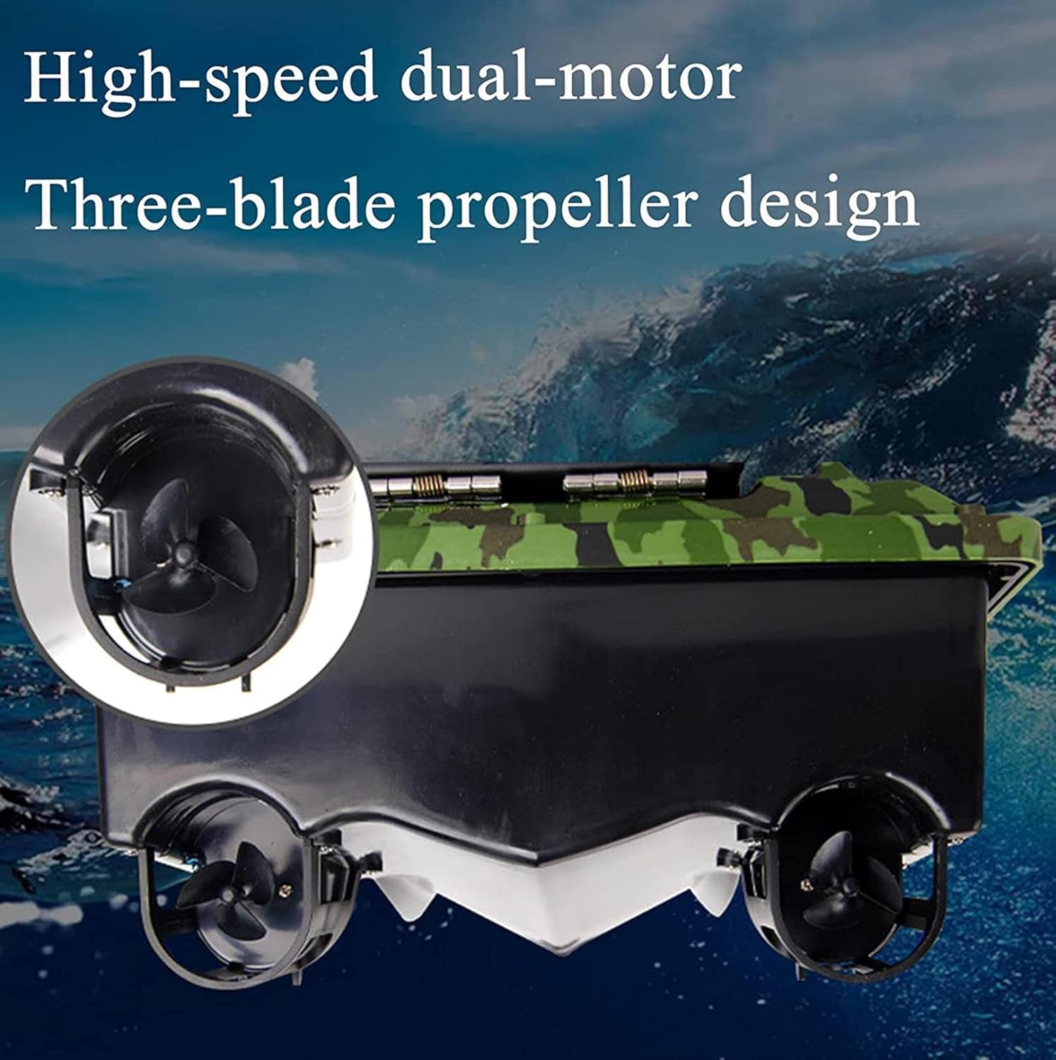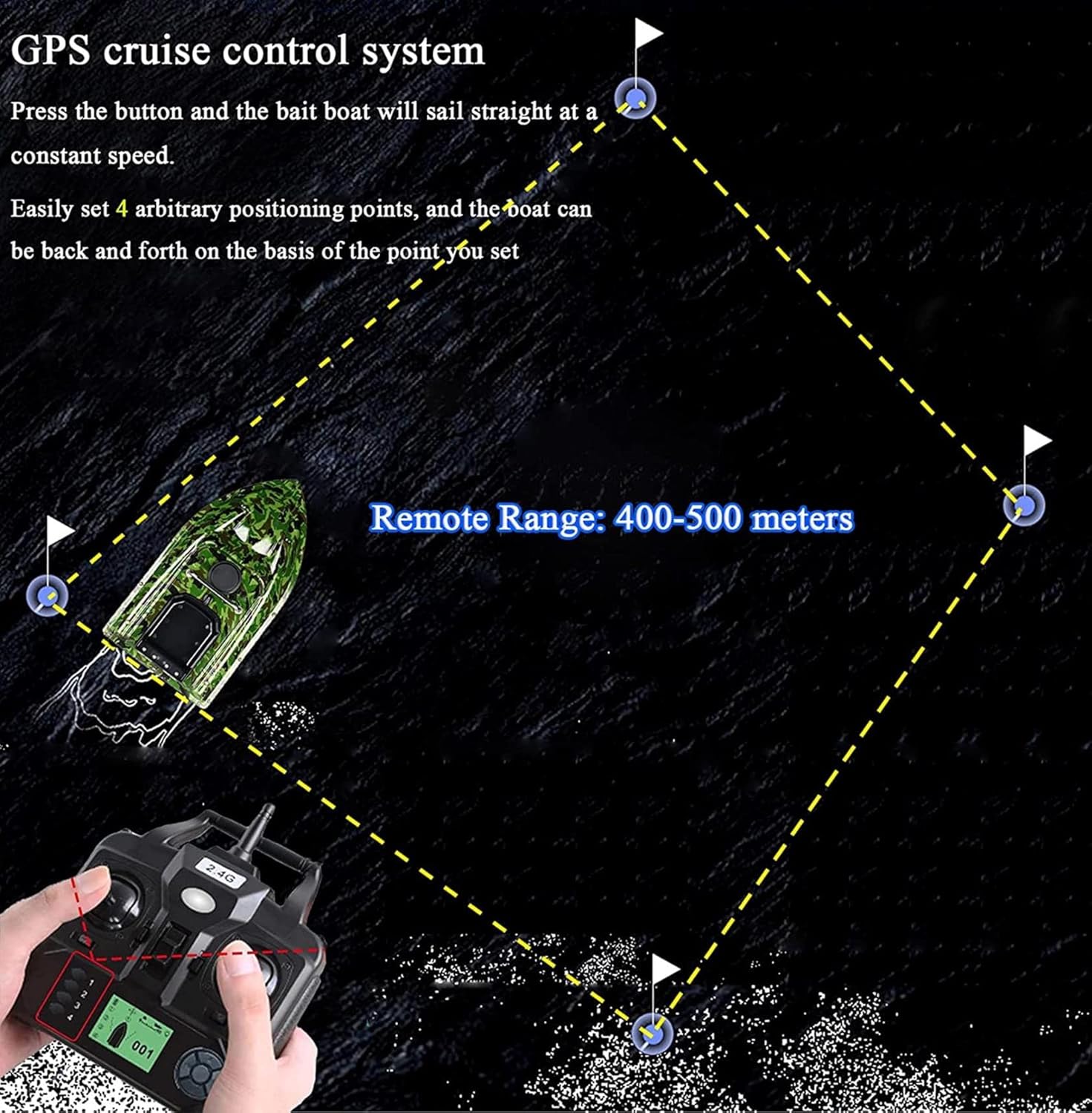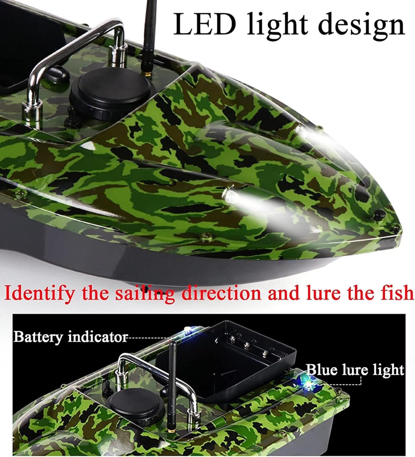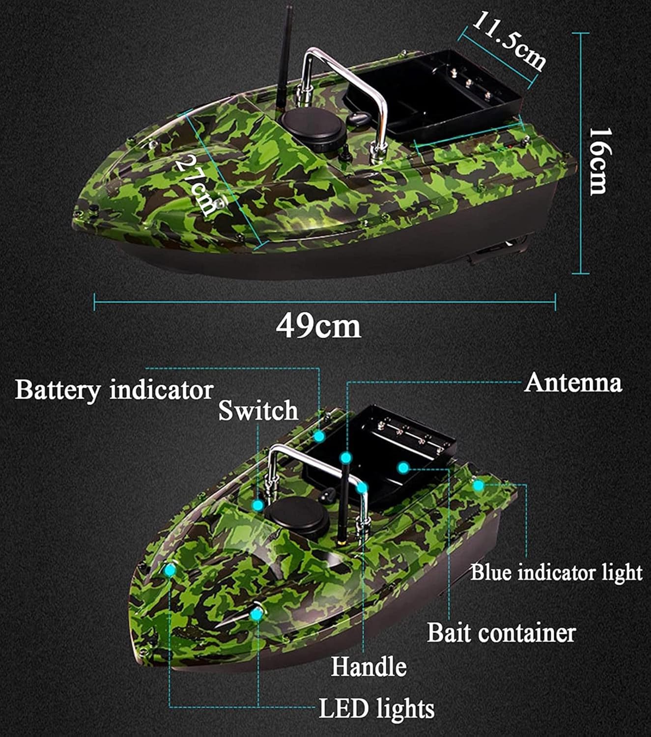 (Barca da pesca): la barca intelligente per esche può trasportare esche e ami nelle acque più lontane dalla riva. Può essere utilizzata con il fish finder. A seconda della tua esperienza di pesca, puoi mettere l'esca nelle aree in cui si radunano i pesci. Spesso porta sorprese inaspettate per gli appassionati di pesca. (Telecomando LCD): Il telecomando LCD può impostare 1 posizione originale e 3 punti di ancoraggio, e la barca esca può muoversi avanti e indietro tra i 3 punti di ancoraggio. In caso di perdita del segnale o di batteria scarica, la barca torna automaticamente alla posizione originale dopo 15 secondi e sullo schermo del telecomando mostra il supporto della batteria della barca di alimentazione, la bussola e il numero di metri percorsi! (Contenitore per esche di grande capacità): il Fischkader Boot ha un contenitore per esche in cui è possibile caricare un totale di 1,5 kg di esche. Il telecomando può controllare l'apertura del contenitore per esche in modo indipendente. Molti pesci vengono attratti posizionando l'esca nel lago. Inoltre, l'amo da pesca può essere appeso ai contenitori per esche per evitare che cada. (Eccellente design dettagliato): 1. La barca da pesca telecomandata ha due motori e due eliche, l'alloggiamento dell'elica può bloccare efficacemente l'aggrovigliamento delle piante acquatiche. 2. La barca esca è dotata di stella notturna in modo da poter vedere bene la barca da una grande distanza di notte. 3. Lo stivale Fischkaber è costituito da materiale ABS, fusoliera aerodinamica, forte resistenza agli urti e resistenza all'abrasione. (Batteria al litio ad alte prestazioni): la barca da feed è alimentata da una batteria al litio da 5200 mAh 12000 mAh. Può essere caricata separatamente ed è facile da installare. Dopo ogni carica completa, la batteria da 5200 mAh può essere utilizzata per circa 2-3 ore e la batteria da 12000 mAh per circa 5-6 ore. È possibile selezionare batterie diverse a seconda delle esigenze. La barca esca è molto adatta per la pesca alla carpa.