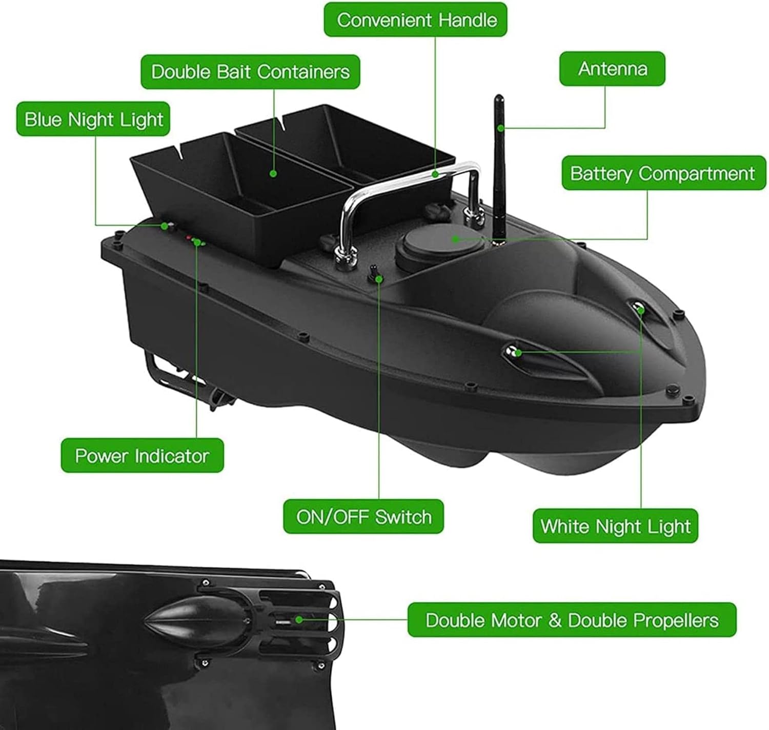 [Materiale ABS di alta qualità] La barca da pesca è realizzata in ABS di alta qualità stampato a iniezione, più stabile e resistente, in grado di resistere a forti venti e onde. La velocità massima può raggiungere i 5,4 km/h, l'autonomia massima è di circa 2 ore e l'impostazione dell'allarme di batteria scarica garantisce il ritorno in sicurezza della barca radiocomandata. [Barca esca]: la barca esca intelligente adotta il sistema di posizionamento GPS per trasportare esche e ami per la pesca o per depositare le esche sul fondo del lago. Per gli appassionati di pesca, spesso riserva sorprese inaspettate. Ideale per i pescatori. [Ricezione del segnale a 500 m]: la barca esca con telecomando intelligente ha una funzione di telecomando intelligente, la distanza del telecomando è di 500 m, il raggio di sterzata è di 0,8-1,0 m, la trasmissione del segnale è stabile, 500 m senza interferenze e il segnale è più stabile in un ambiente pulito. [Design delle luci di navigazione notturne] Comodo da usare di notte o nelle giornate nuvolose. Il design dell'illuminazione, con luci anteriori e posteriori a due colori con telecomando, determina chiaramente la posizione della nave e fornisce un buon ambiente luminoso. [Ampia gamma di applicazioni] Adatto a fiumi, laghi e zone con acque poco profonde. È uno strumento di pesca indispensabile e pratico. È un'ottima scelta per te.