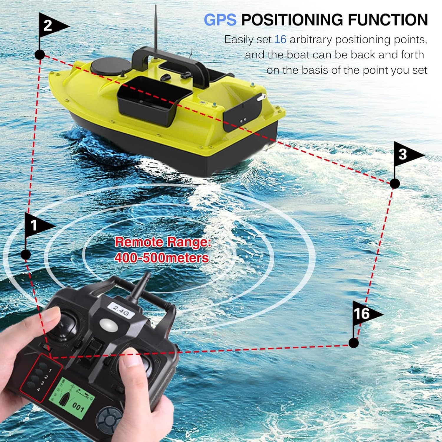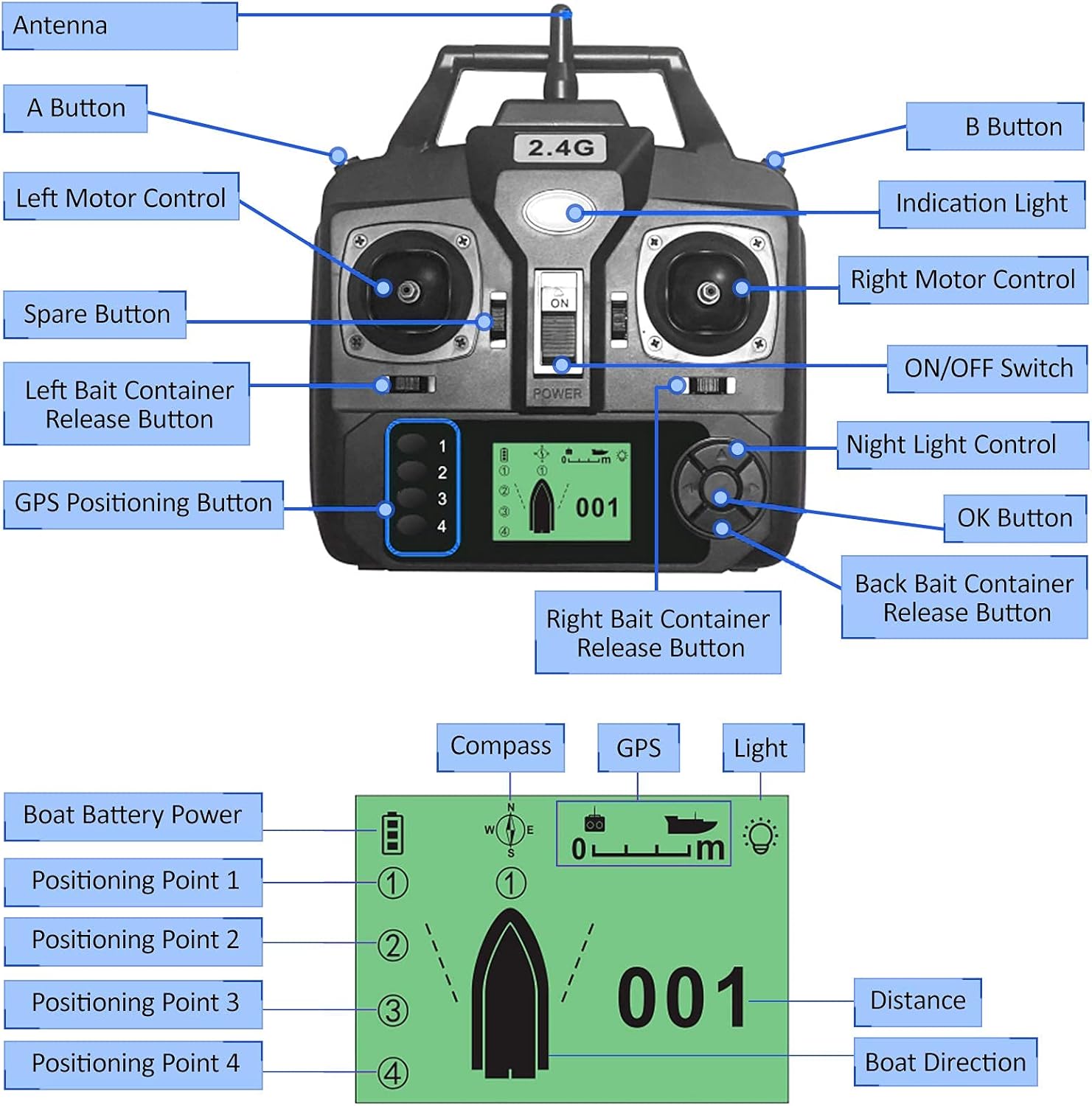 3 contenitori per esche con una capacità portante di circa 4,4 libbre per più esche. (NOTA: il contenitore per esche senza funzione di ritorno automatico, dovresti tirarlo indietro con le mani dopo averlo rilasciato.) La funzione GPS aiuta a impostare 16 punti di posizionamento arbitrari e la barca può essere avanti e indietro in base al punto impostato. Il display LCD del telecomando visualizzerà più dati per te, come la carica della batteria, la distanza, la bussola, la posizione e la luce. In caso di perdita di segnale o batteria scarica, la barca tornerà automaticamente all'origine dopo 15 secondi. Non preoccuparti di perdere. Il controllo wireless e l'interruttore di velocità fissa consentono di rilasciare l'esca lontano. (Gamma remota: 400-500 metri)