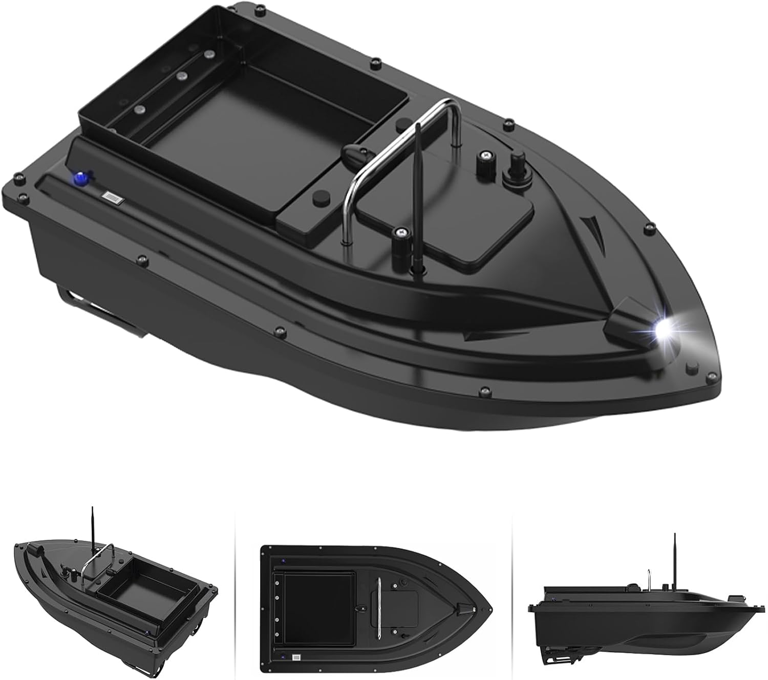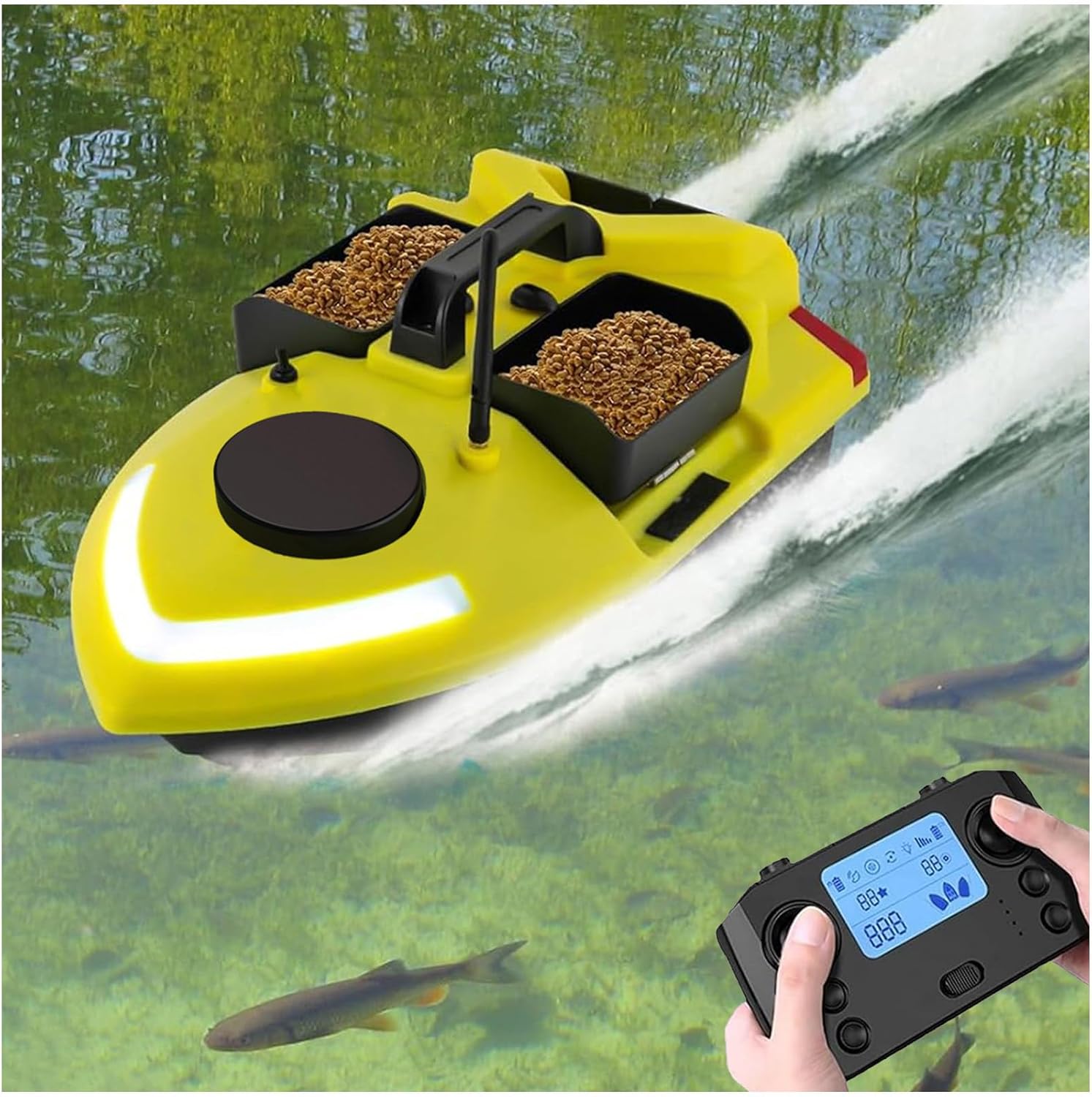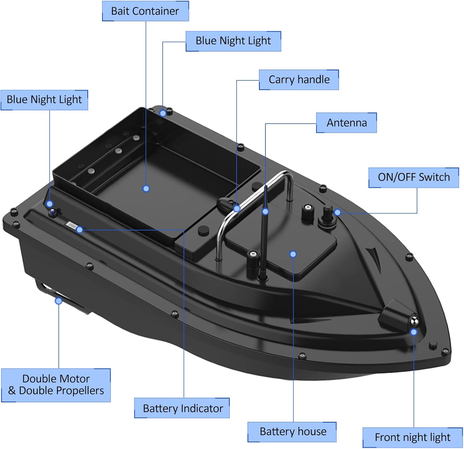 GPS function help to set 4 arbitrary positioning points,and the boat can be back and forth on the basis of the point you set. LCD display of the remote will display multiple datas for your,like battery power,distance,compass,position and light. Large bait container with about 4.4lb bearing capacity for more baits. When encountering signal loss or low battery,the boat will automatically return to the origin after 15 seconds.Don't worry about losing. Wireless control and fixed speed cruise switch,make it possible to release bait far. (Remote Range: 400-500 meters)
