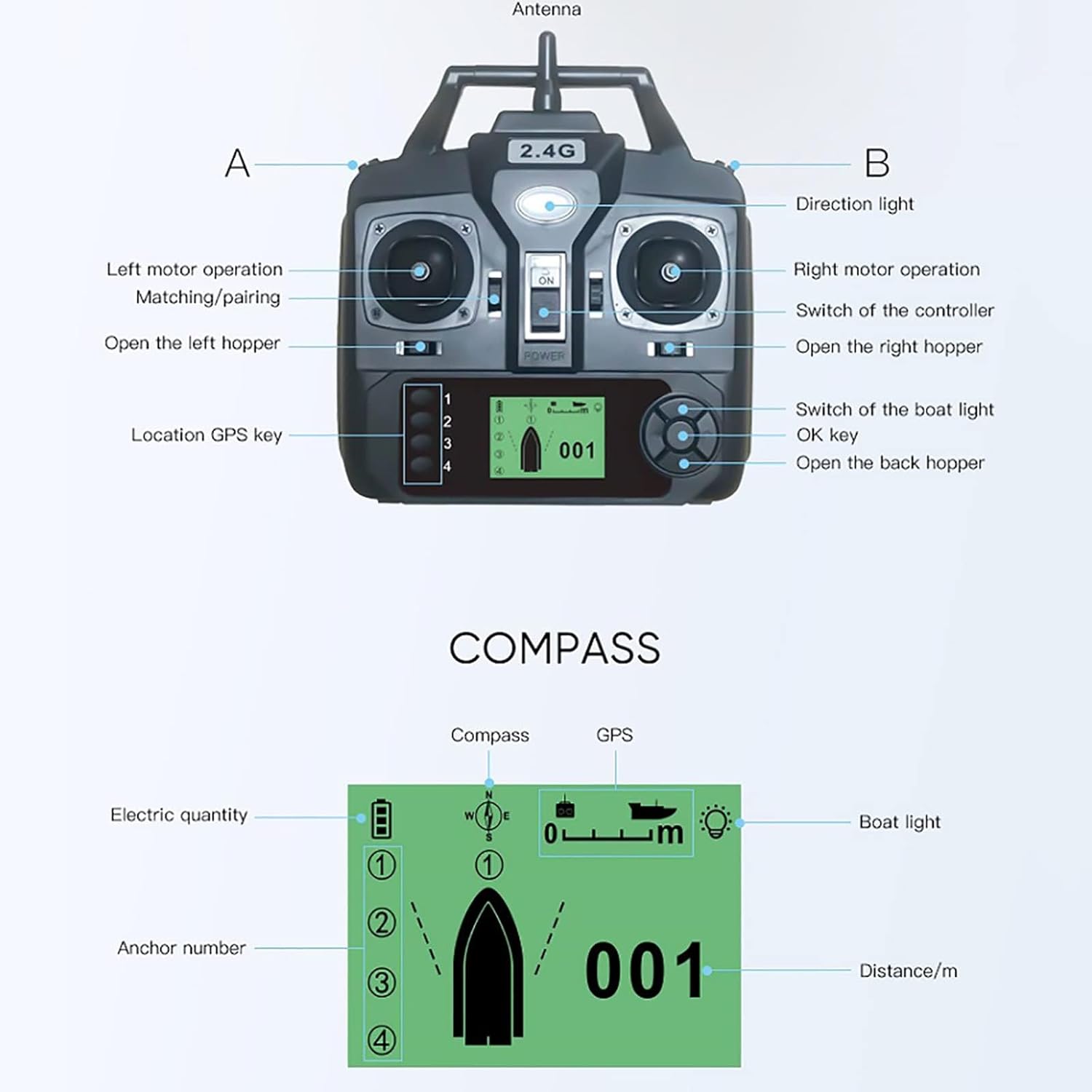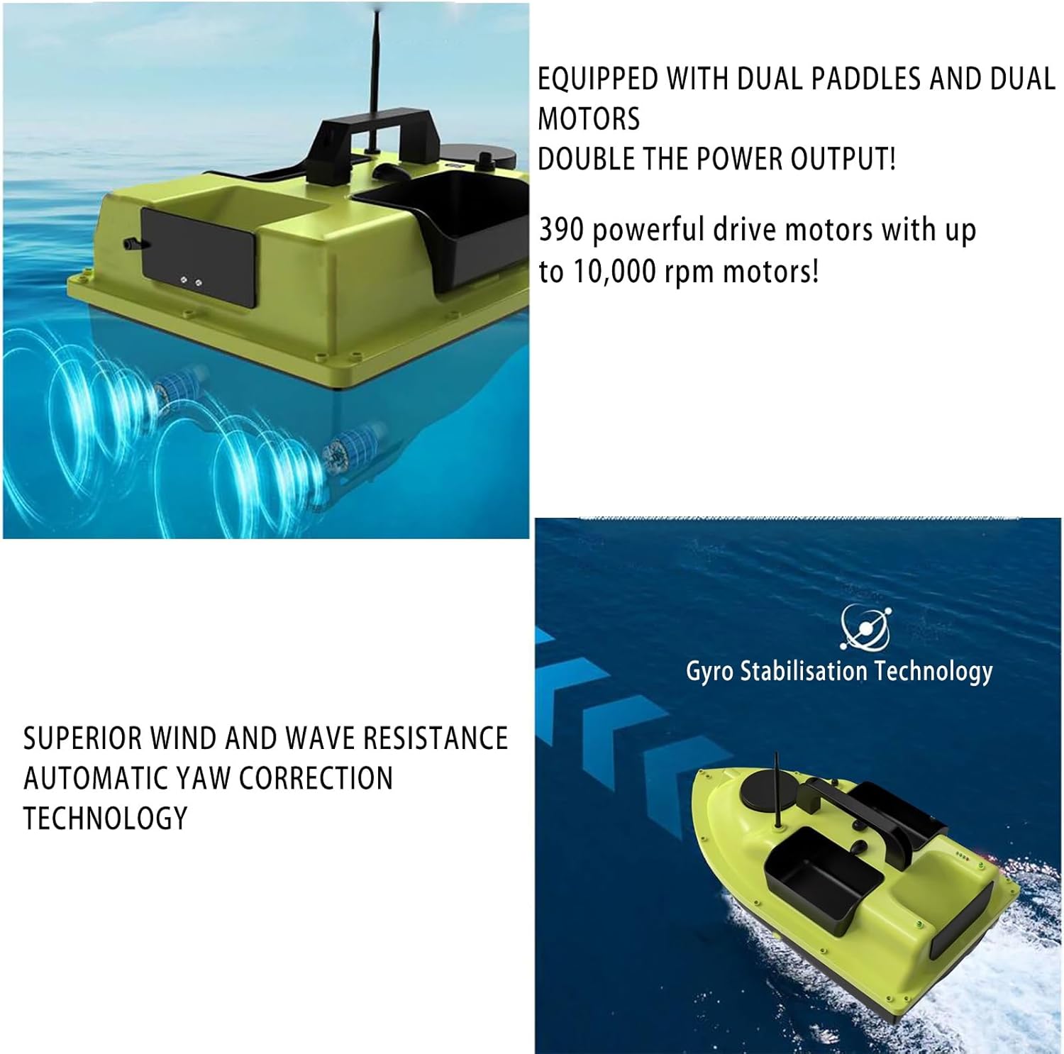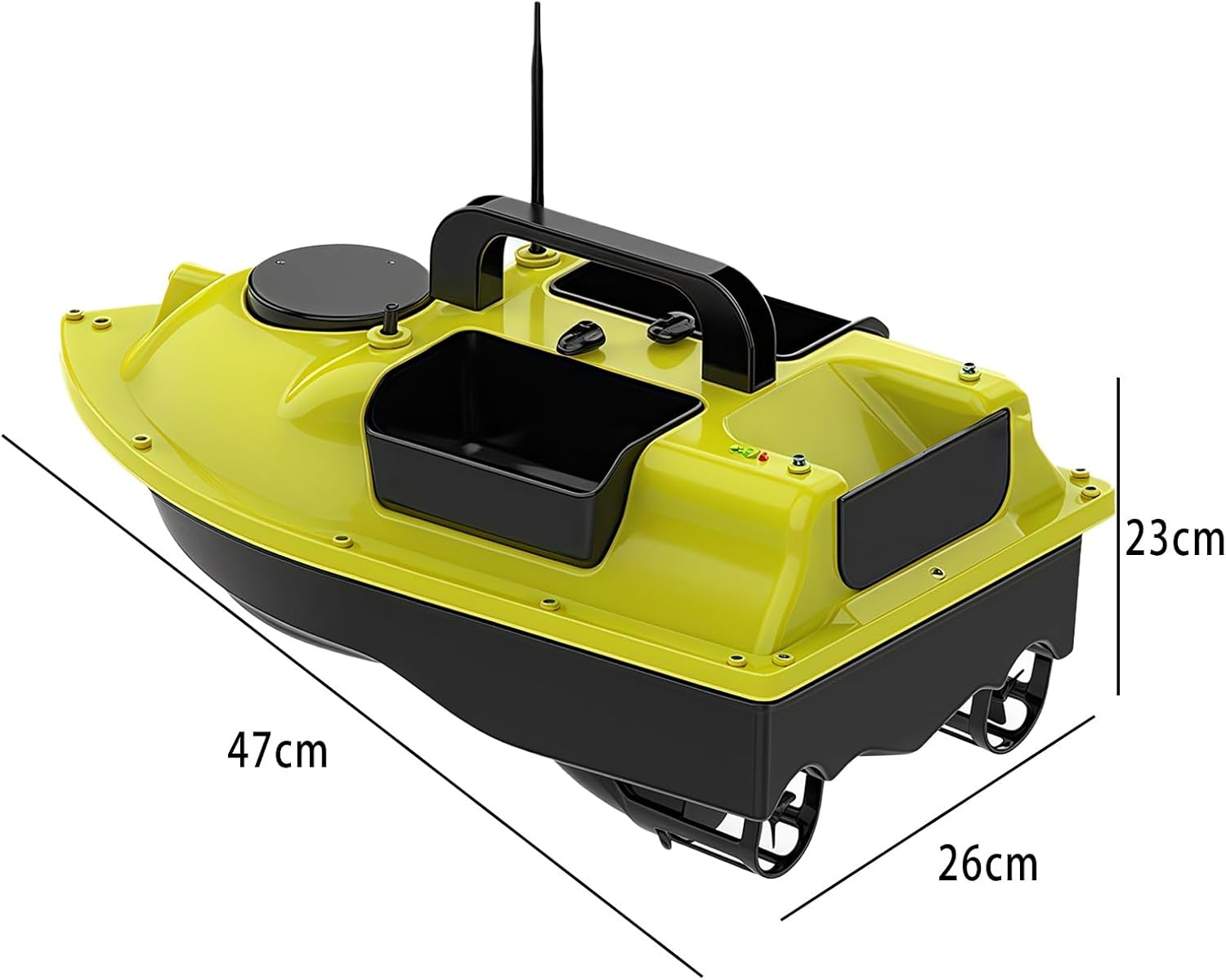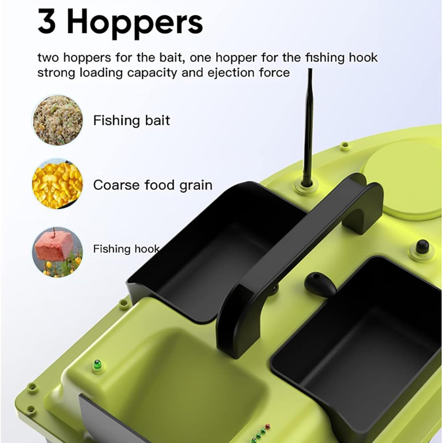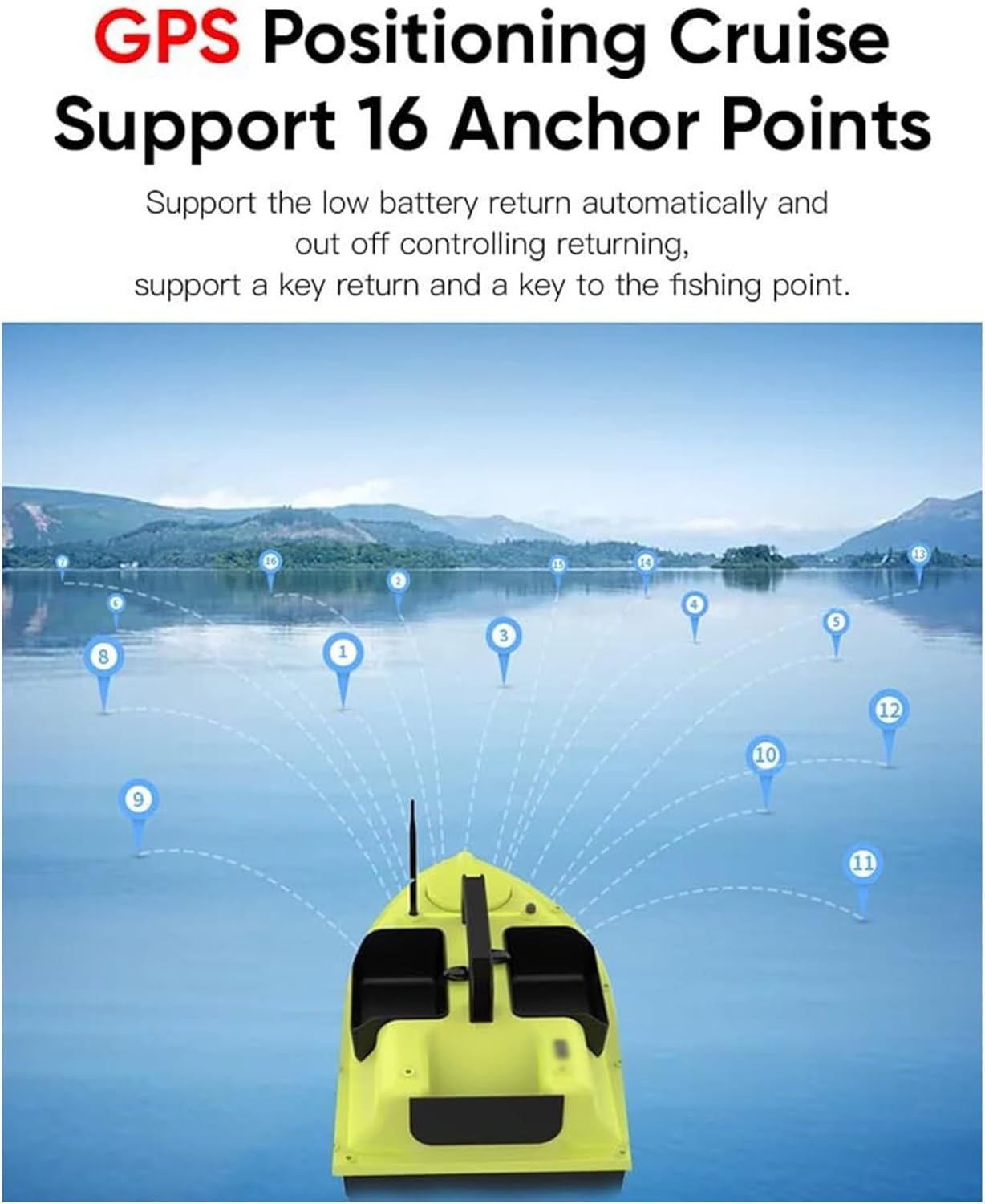 【3 serbatoi per esca】: design dell'esca a tre stadi, l'ingresso può essere controllato in modo indipendente per ottenere un'esca più precisa, guscio di stampaggio ad iniezione di materiale ABS ingegnerizzato. Ha un'eccellente resistenza agli urti e all'abrasione, è facile da trasportare ed è sigillato, sicuro. 【Posizionamento GPS】: il nostro motoscafo è dotato di telecomando GPS. Il telecomando GPS può contrassegnare fino a 16 punti focali entro un raggio di 500 metri e la barca per il cibo può spostarsi tra i 16 punti focali. 5200mAh/12000mAh. Dopo ogni carica completa, può essere utilizzata per circa 2-8 ore. Se si verifica una perdita di segnale o una batteria scarica durante la pesca, la barca da alimentazione tornerà automaticamente alla posizione iniziale impostata.,Design a doppio motore: il potente design a doppio motore, con un'elica a tre foglie, fornisce alla barca da esca una propulsione sufficiente per aumentare la velocità e le prestazioni sull'acqua. Velocità del motore fino a 10.000 giri/min