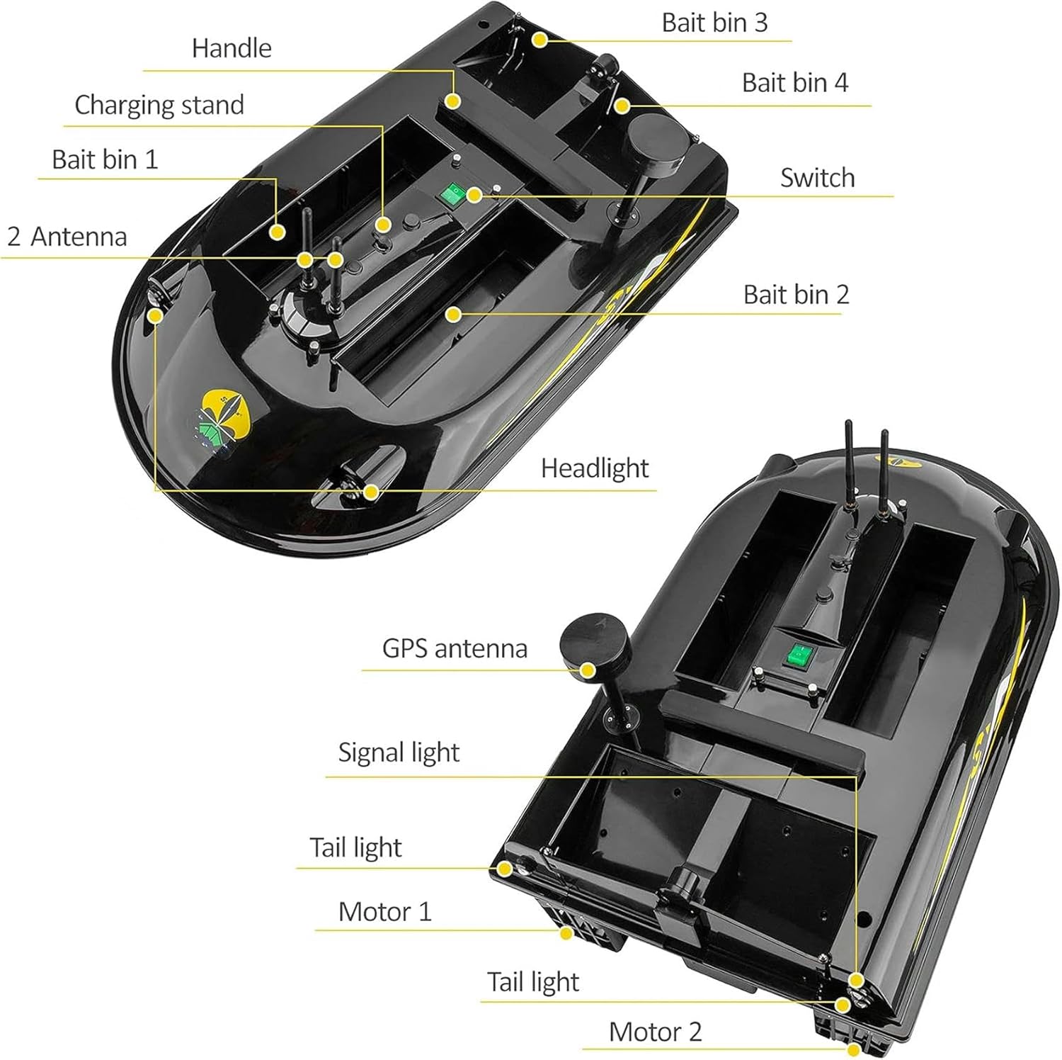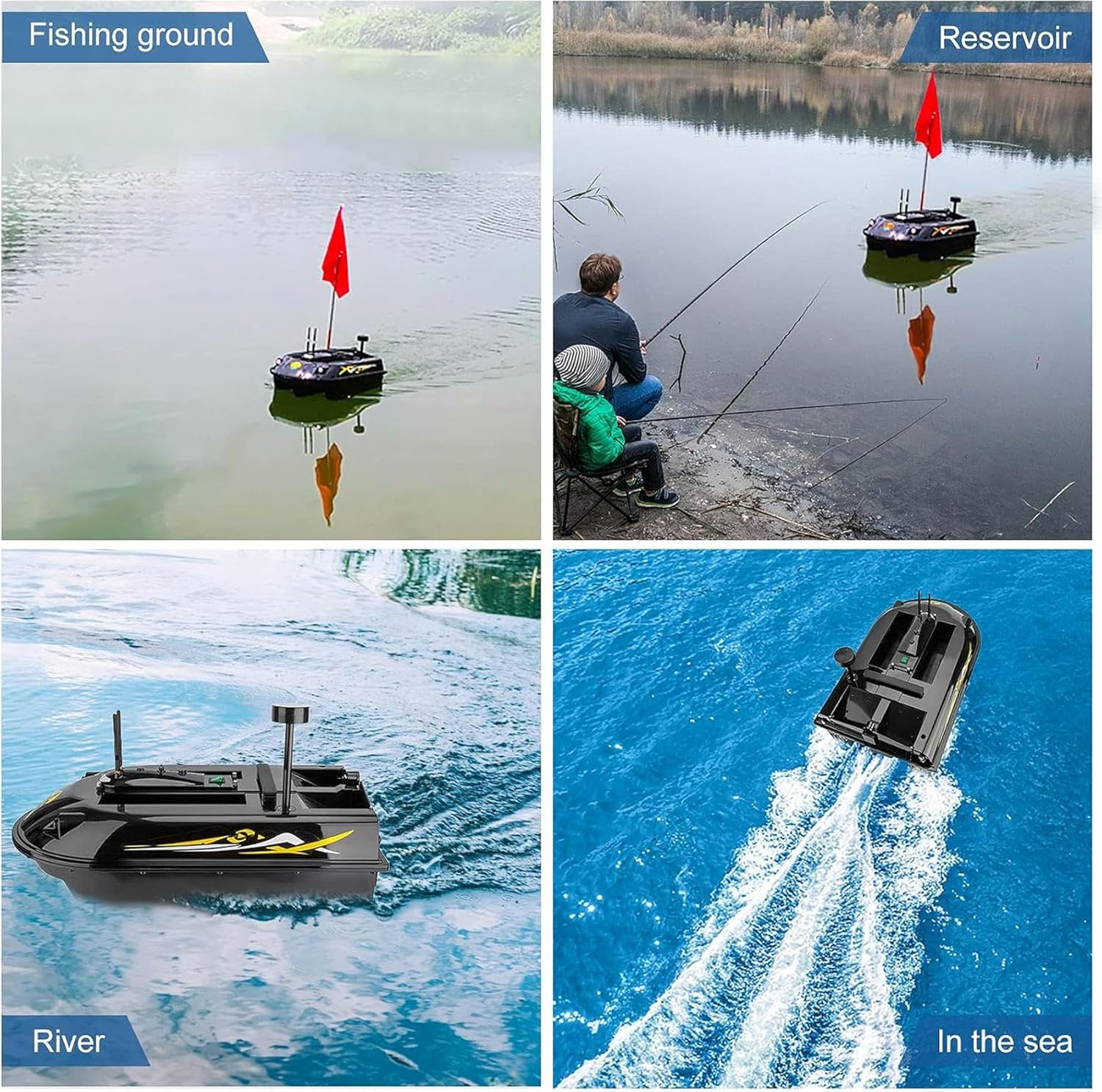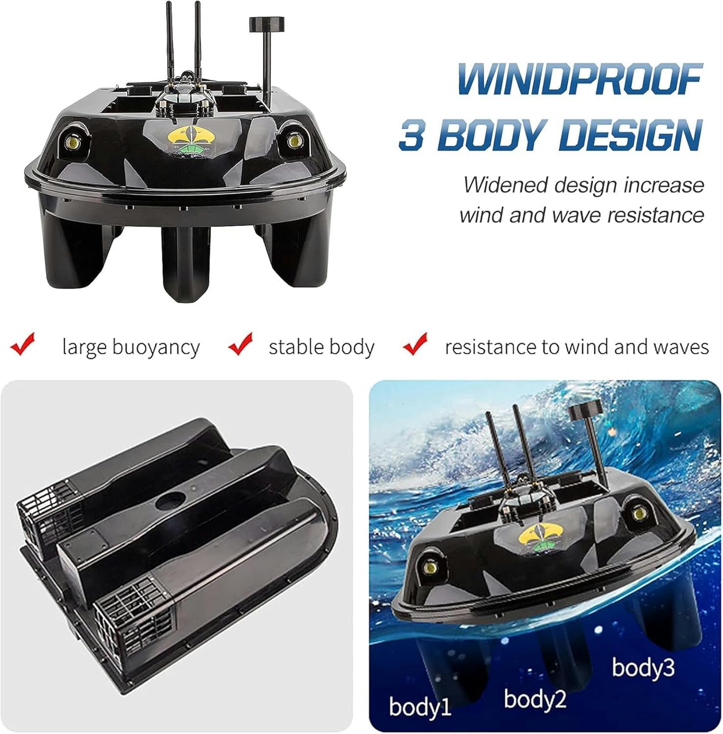 La struttura robusta e allargata resiste agli elementi duri del vento e delle onde. Capacità di carico massima circa 8 kg. Segnale forte con un raggio di controllo lungo di circa 600 metri. Funzione di navigazione GPS: posizione GPS,navigazione automatica,ritorno automatico intelligente. Telecomando touchscreen per un facile utilizzo. Memorizza 8 punti di posizione e lancia verso il bersaglio con un solo pulsante. Il motore silenzioso ad alta potenza da 36 W non spaventerà i pesci.