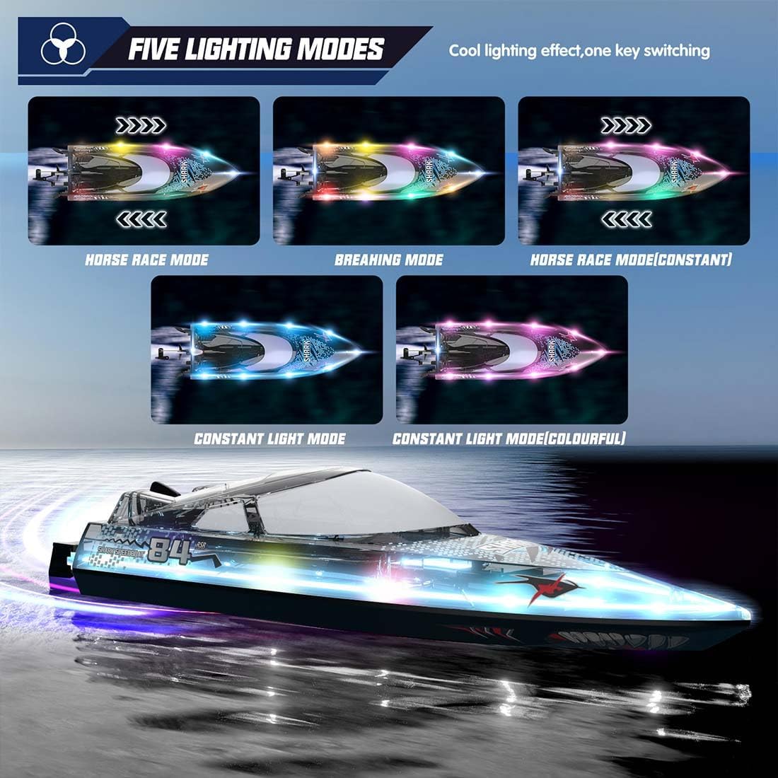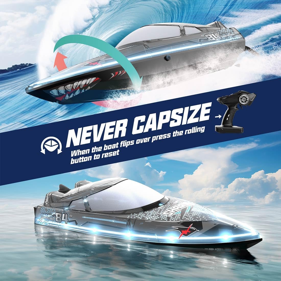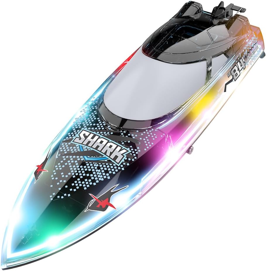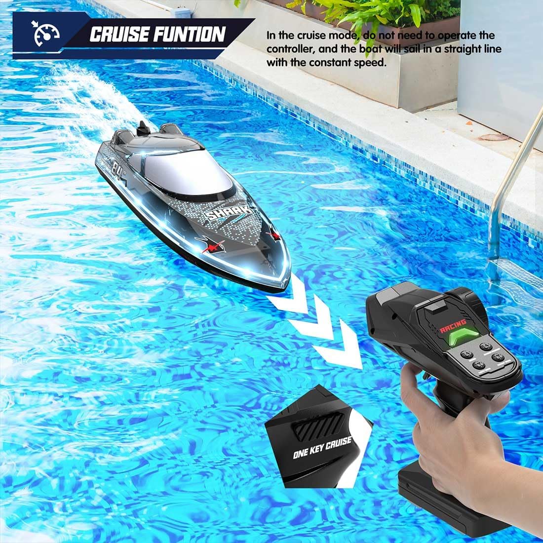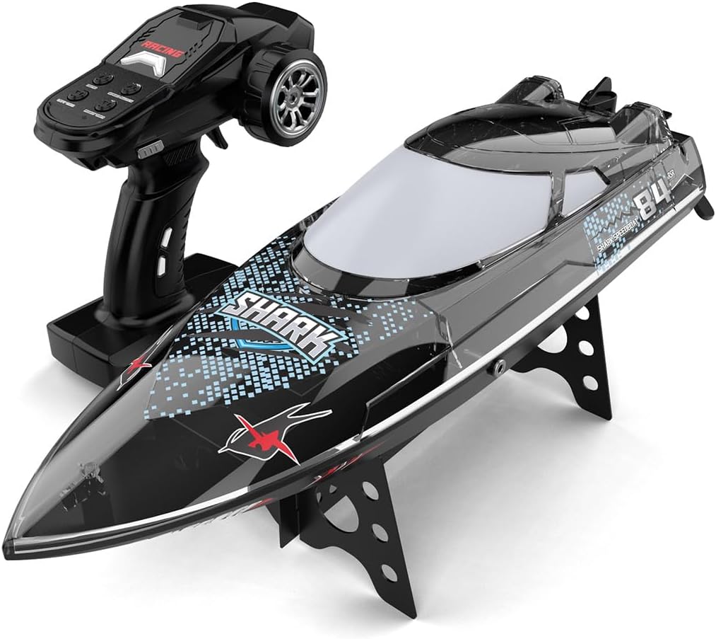 Velocità veloce: Raggiungi velocità emozionanti fino a 30 km/h con questa barca da corsa RC. La frequenza a 2,4 GHz garantisce un controllo stabile fino a 150 metri, in modo da poter correre su più barche contemporaneamente senza interferenze Controllo fluido e realistico: dotato di una forte elica e timone dello sterzo regolabile, la barca RC offre un movimento potente e curve precise. Cambia facilmente i livelli di velocità con un pulsante per adattarsi al tuo livello di abilità e goditi un'esperienza di navigazione realistica Design di sicurezza premuroso: la barca si spegne quando è fuori dall'acqua ed entra in modalità sleep dopo 5 minuti di inutilizzo. Le luminose luci di navigazione a LED, uno scomparto interno nascosto e un'ala posteriore in stile radar combinano sicurezza e design elegante Funzioni Smart Power: la batteria scarica integrata e gli allarmi fuori portata ti tengono informato, mentre la ricarica USB e una batteria al litio sostituibile ad alta capacità offrono una riproduzione più lunga. Un sistema di raffreddamento ad acqua protegge il motore e ne prolunga la durata Durevole e pronto per il regalo: con una copertura impermeabile a doppio strato, frontale anti-collisione e recupero automatico del ribaltamento, questa barca telecomandata è costruita per durare. Perfetto per laghi o piscine, è un ottimo regalo per amici o familiari per Natale o qualsiasi vacanza