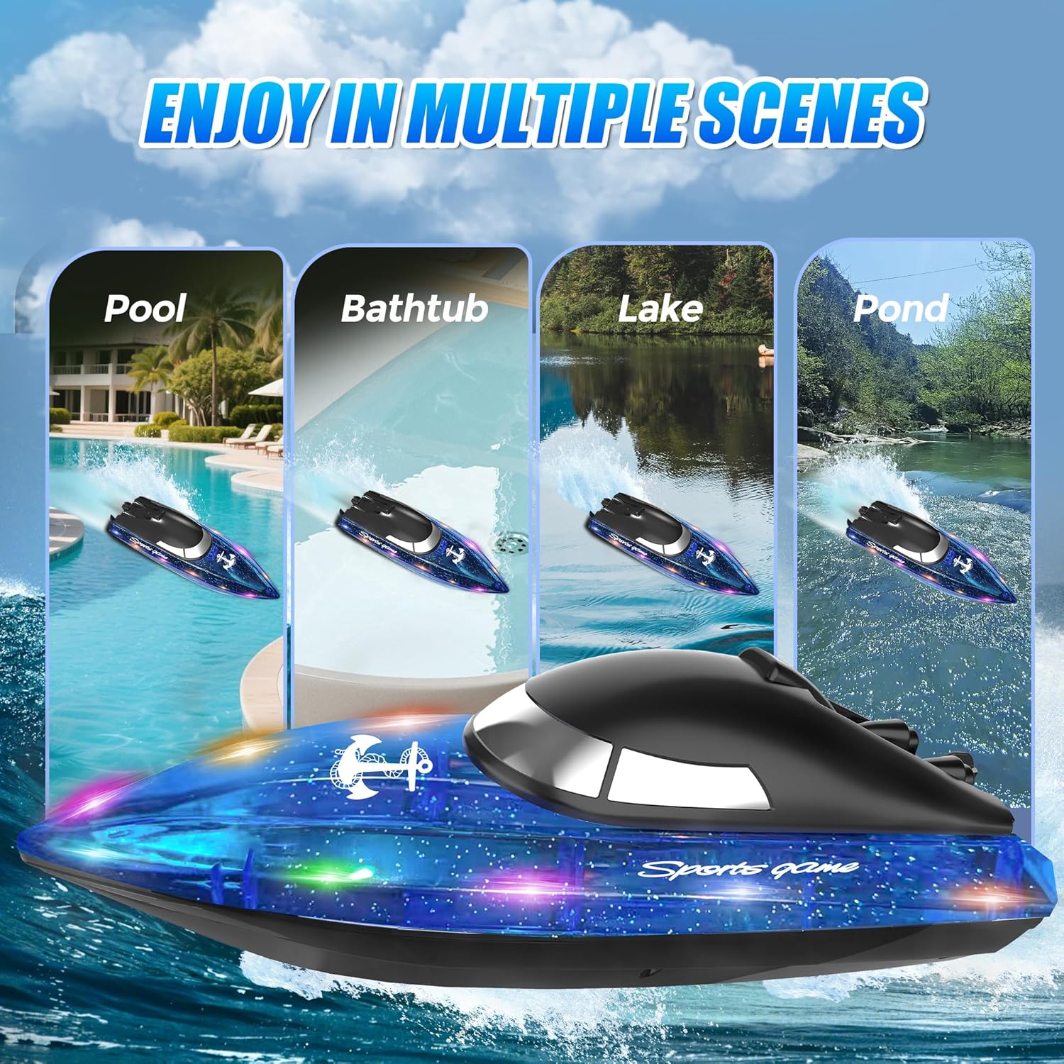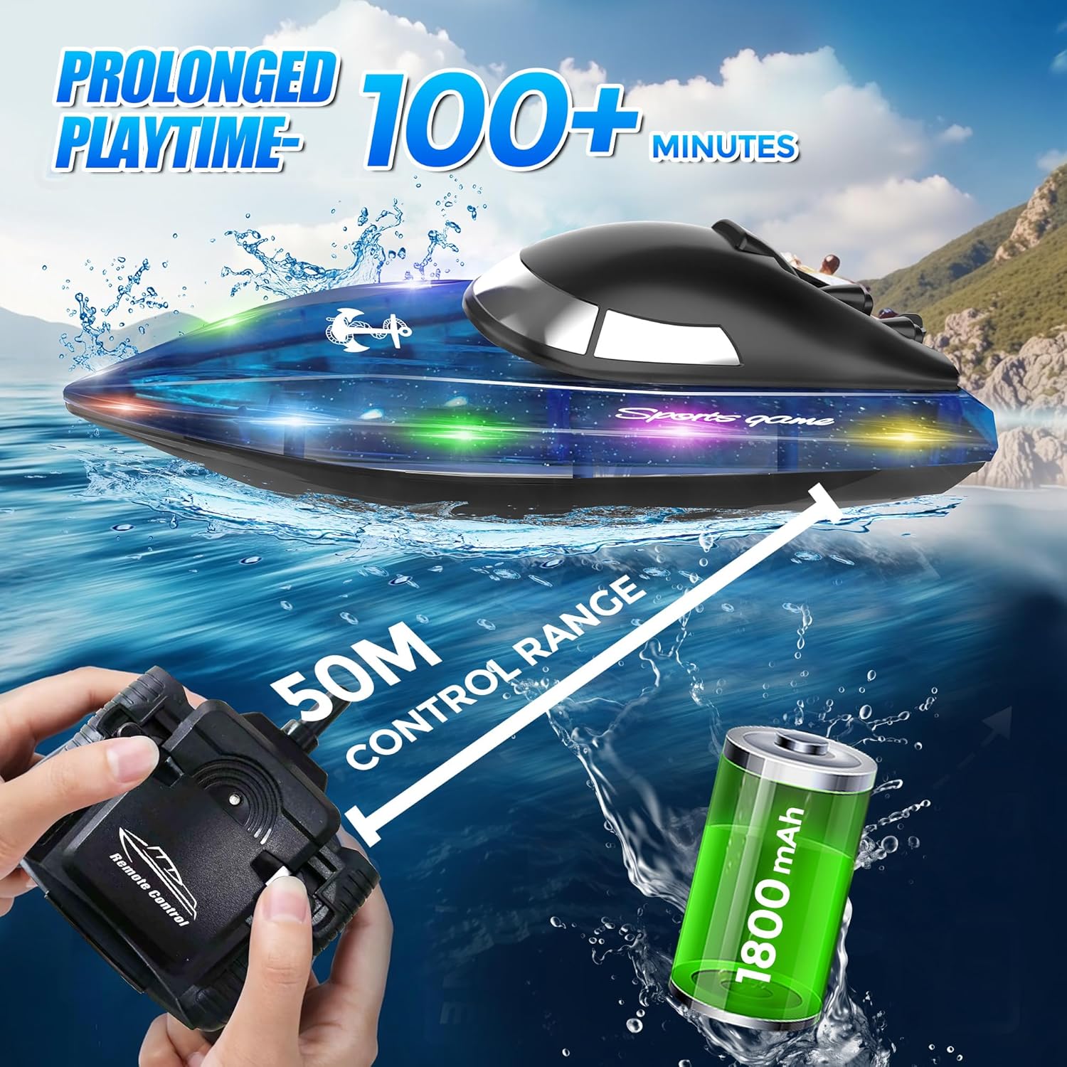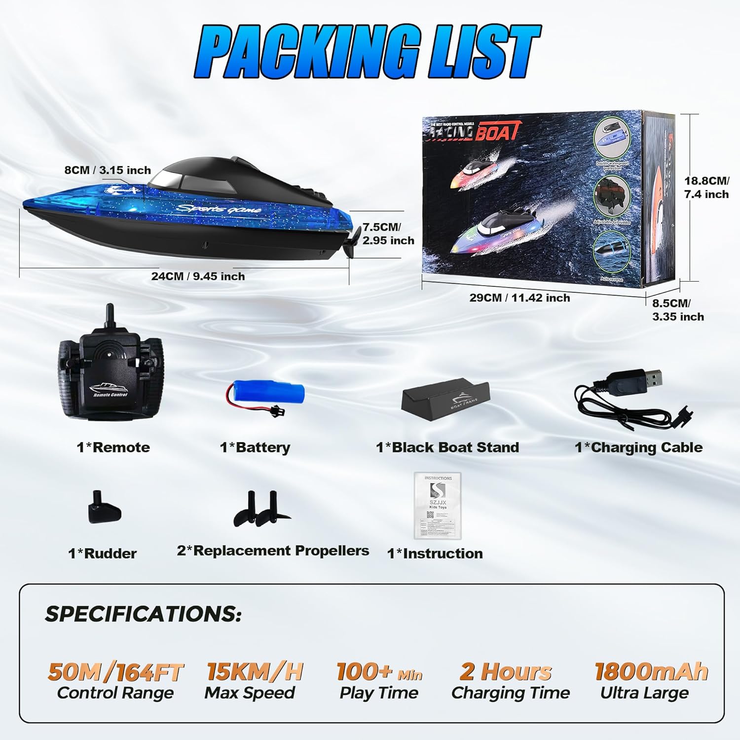 💡【Luci LED dinamiche】–La copertura di questa barca telecomandata è trasparente e decorata con paillettes. Il bordo della barca radiocomandata è dotato di 10 luci LED luminose e colorate con 3 modalità (lampeggio veloce, lampeggio lento, luce intermittente). Le luci LED dinamiche non solo sono molto belle al buio, ma consentono anche di identificare chiaramente la posizione e la direzione della barca, permettendoti di goderti il divertimento della navigazione notturna. 🔋【Oltre 100 minuti di batteria a lunga durata】–Questa barca telecomandata per bambini è alimentata da una batteria ricaricabile ad alta capacità da 1800 mAh che può fornire alla barca giocattolo un funzionamento continuo per oltre 100 minuti dopo essere stata completamente caricata (2 ore). Che tu stia navigando in piscina o facendo onde al lago, goditi un'emozione senza sosta senza ricariche frequenti: l'avventura continua! 💦【Design a doppio portello completamente impermeabile】–La barca radiocomandata adotta portelli a doppia tenuta stagna e un design aerodinamico. Questi portelli resistenti proteggono efficacemente i componenti interni, assicurando che la barca funzioni in modo fluido ed efficiente e prevengono l'ingresso di acqua durante curve strette o onde, prolungando la vita utile delle barche. 🎮 【Telecomando avanzato a 2,4 GHz】 - La barca radiocomandata per bambini con un sistema anti-interferenza a 2,4 GHz, facile da controllare. Questo giocattolo per barche permette ai bambini di gareggiare con più barche contemporaneamente senza interferenze. Ideale per piccole competizioni con gli amici o giochi acquatici all'aperto con le famiglie durante il tempo libero! La portata di 50 metri garantisce gare emozionanti in aree di gioco più ampie. 🚀【Sistema ad alta velocità e doppio motore】 Questa barca giocattolo da lago è dotata di potenti motori doppi ad alta velocità, con velocità di guida fino a 15 km/h. Le dimensioni sono perfette per vasche da bagno, piscine, piccoli stagni, fiumi e laghi, e questa barca RC ha la correzione automatica dell'imbardata e la funzione di recupero del capovolgimento che riporta la barca in posizione verticale in caso di capovolgimento, il che può portare più divertimento ai bambini. ✅【Protezione batteria scarica】Quando la velocità della piccola imbarcazione diminuisce improvvisamente e lentamente, la carica della batteria è insufficiente e l'imbarcazione è entrata in stato di bassa protezione, è necessario caricare la batteria dell'imbarcazione. Quando la spia del telecomando lampeggia, il telecomando è in stato di bassa potenza. È necessario sostituire le batterie del telecomando. 🎁【Regalo perfetto per i tuoi bambini】Questo motoscafo radiocomandato è progettato per i bambini ed è adatto a una varietà di luoghi, tra cui lago, piscina, stagno, fiume e vasca da bagno. È un ottimo regalo di compleanno e di festa per bambini, adatto a ragazzi e ragazze di 6, 7, 8, 9 e 10 anni.