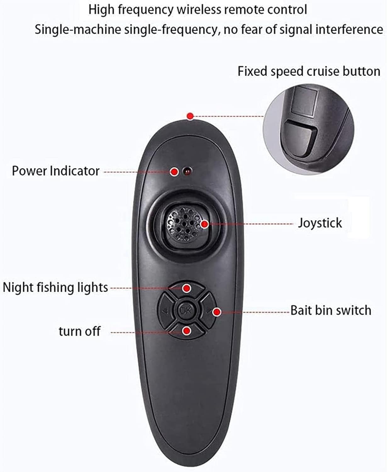 La portata di 430-540 metri consente di rilasciare l'esca in laghi, fiumi, bacini artificiali e oceani, dove si radunano i pesci. Grande silo con una capacità di carico di circa 3,3 libbre per più esche Alimentato da una batteria ricaricabile da 7,4 V/5200 mAh per 2-3 ore di funzionamento continuo. 2 luci anteriori progettate per la pesca notturna. Doppi motori ed eliche, molto potenti.