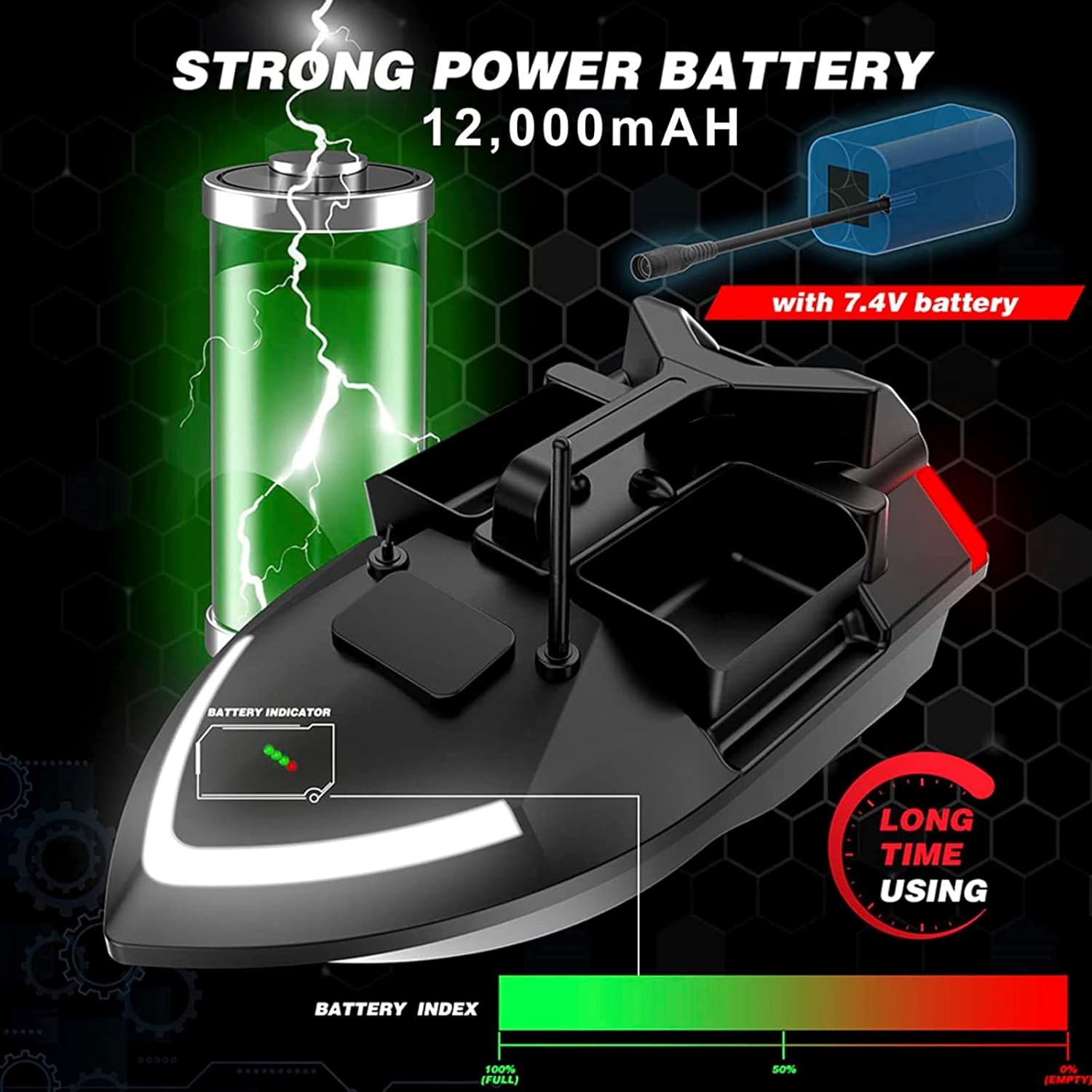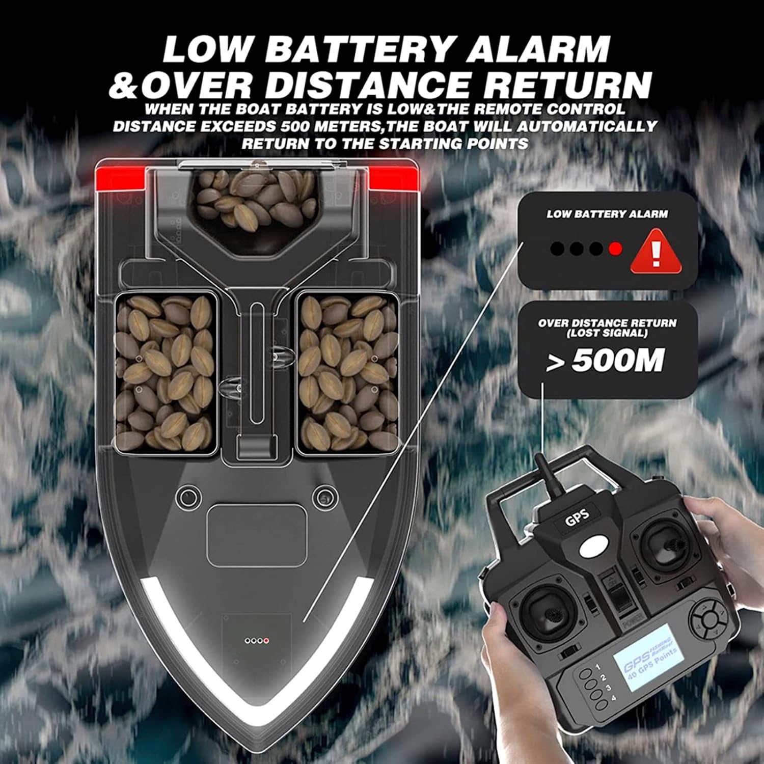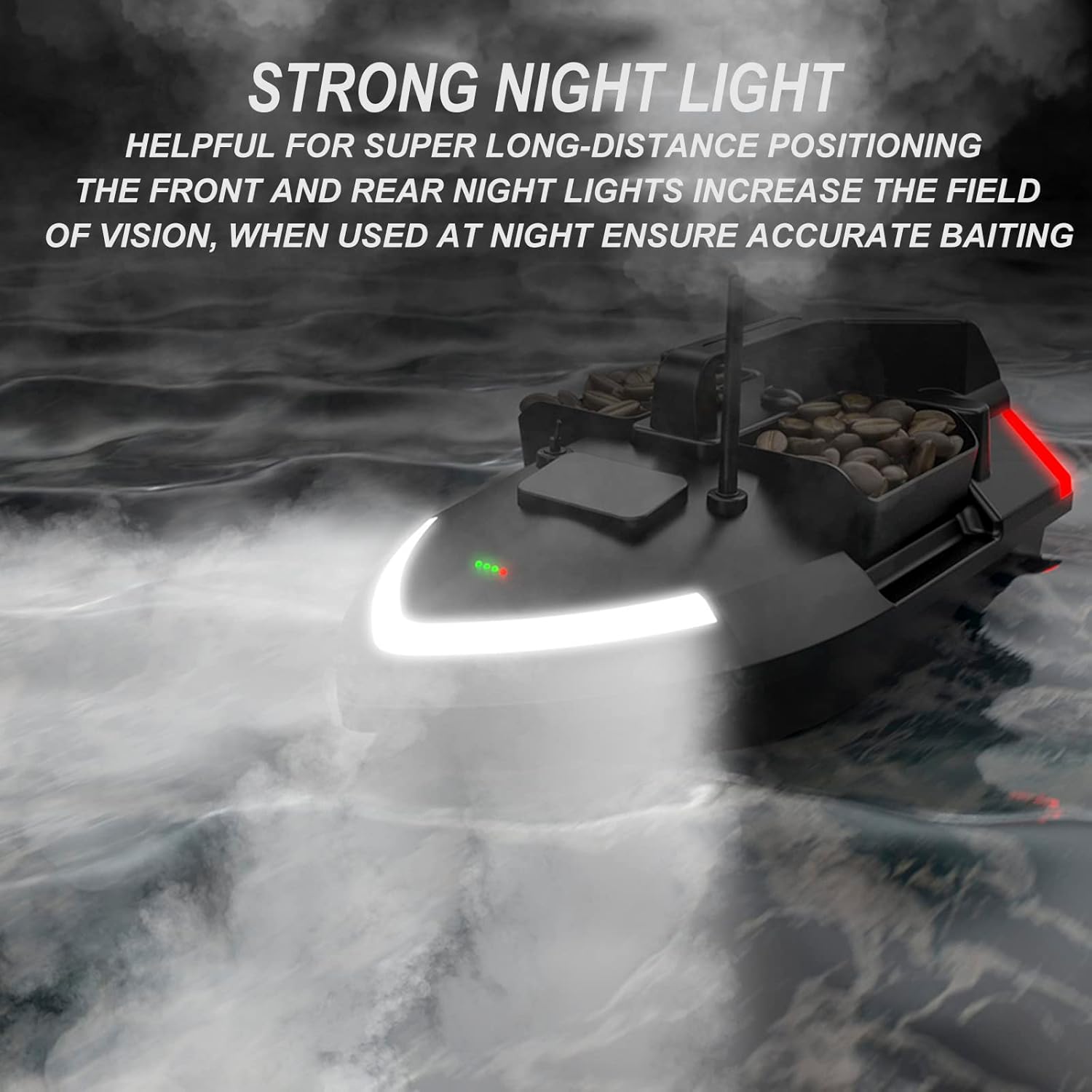 [Telecomando GPS] - Segnale anti-interferenza potenziato 500M. Distanza di posizionamento del telecomando 500 metri, 40 punti di posizionamento. La batteria ricaricabile da 12000 Mah può servire per 3-4 ore di uso continuo. [Crociera a velocità costante] - Crociera a velocità costante, guida automatica Libera le mani, raggiungi una velocità uniforme e guida in linea retta verso il punto di nidificazione designato, risparmia tempo e fatica. Tre contenitori per esche possono essere azionati in modo indipendente, possono contenere un'esca da 2 kg. [Materiale di ingegneria ABS] - Il corpo principale dello scafo adotta materiale di ingegneria ABS, che ha una resistenza e una resistenza all'usura superiori, ha una forte resistenza ai graffi, solida e stabile, forte resistenza al vento e alle onde. [LED Super Searchlight] - Le luci di svolta su entrambi i lati dello scafo hanno corrispondenti segnali di luce rossa in base al comando di virata del telecomando, in modo che l'operatore possa identificare la virata della barca in base alle luci; in caso di utilizzo a lunga distanza, il proiettore di prua facilita l'utente nell'individuare la direzione di navigazione della barca. [Doppio motore, pagaia a tre foglie] - Lo scafo presenta un potente design a doppio motore che fornisce potenza sufficiente per far viaggiare lo scafo ed è dotato di un'elica a tre pale per una maggiore spinta e trasferimento dell'acqua nell'acqua per una migliore guida velocità ed esperienza.