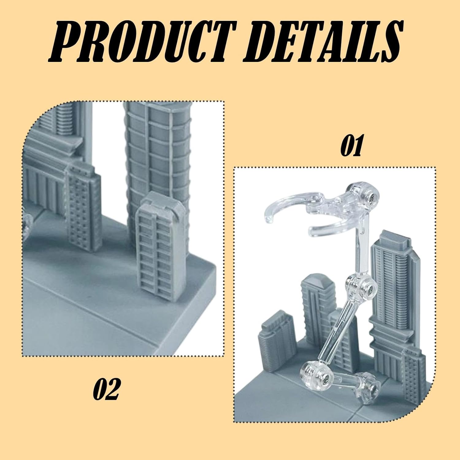 【Presentazione migliorata】: trasforma la tua esposizione con questa base espositiva con sfondo urbano che aggiunge profondità e contesto alla tua collezione, fornendo al contempo un supporto pratico 【 a doppio adattatore】: questo versatile supporto per action figure è dotato di due adattatori intercambiabili (3,0 cm/1,18 e 2,5 cm/0,98) per adattarsi a varie dimensioni e tipologie di modelli 【Ampia compatibilità】: progettato come base di visualizzazione dell'adattatore intercambiabile universale, adatto per i modelli delle serie , e con vita inferiore a 3 cm 【Supporto sicuro】: questo affidabile supporto per modelli offre un supporto stabile grazie alla sua struttura in PP, garantendo che i tuoi preziosi modelli siano esposti in modo sicuro e ben visibile 【Sfondo di visualizzazione 】: il supporto dettagliato del diorama della scena cittadina offre un ambiente urbano immersivo che migliora l'attrattiva visiva delle action figure da te raccolte