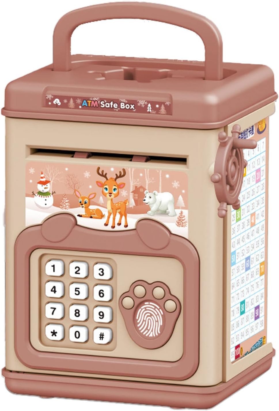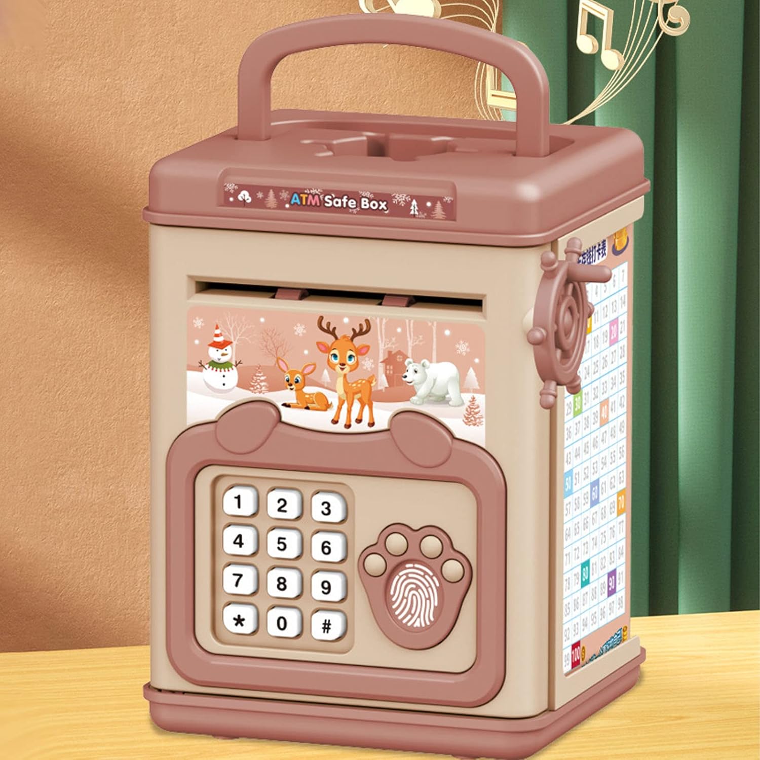Roll manuale: metti i soldi della carta in banca, gira la ruota accanto ad essa, i soldi della carta verranno trasformati nella banca di risparmio di denaro, lascia che i bambini sperimentano il divertimento di risparmiare denaro. Password di impronte digitali: ha la funzione a doppia protezione della password e dell'impronta digitale. Quando la password e l'impronta digitale sono confermate correttamente, la porta si aprirà automaticamente. La password predefinita è 0000, è possibile modificare la password. Educational: ha una forma unica che Desgin affascerà i tuoi figli. Non li aiuterà a sviluppare l'abitudine di risparmiare il più possibile, ma anche a portare loro molta gioia. Prompt vocale: ogni fase di archiviazione ha interazione vocale, semplice operazione per promuovere l'interesse dei bambini. Costruito in musica dinamica, puoi cambiare brani. : puoi fare questa cassetta di deposito di monete di grande capacità come per i tuoi ragazzi e ragazze a Natale, Halloween, Pasqua, compleanno.