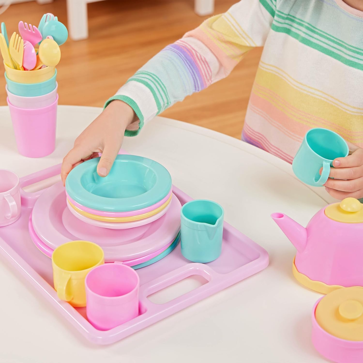 Set di 34 pezzi di piatti giocattolo e Tea Party: un set completo di stoviglie e tè perfettamente dimensionato per mani piccole e immaginazione più grande! Design a misura di bambino: gli accessori colorati sono resistenti e facili da afferrare, si abbinano perfettamente a diversi set da gioco e la borsa con cerniera riutilizzabile aiuta a riporli in modo pulito e ordinato. Include: teiera con coperchio rimovibile, zuccheriera con coperchio rimovibile, lattiera, 4 tazze, 4 bicchieri, 4 ciotole, 4 piatti, 4 forchette, 4 cucchiai, 4 coltelli e vassoio di servizio. Giocattoli educativi: giocare con questo accessorio da tavola stimola l'immaginazione e incoraggia la creatività. Questi utensili da cucina sono durevoli e raffinati, ideali da aggiungere a qualsiasi cucina giocattolo e negozio. Età consigliata: suggerito a partire dai 3 anni (parti piccole); insegna il gioco di ruolo, sviluppa la motricità fine classificando forme e colori e incoraggia la creatività.