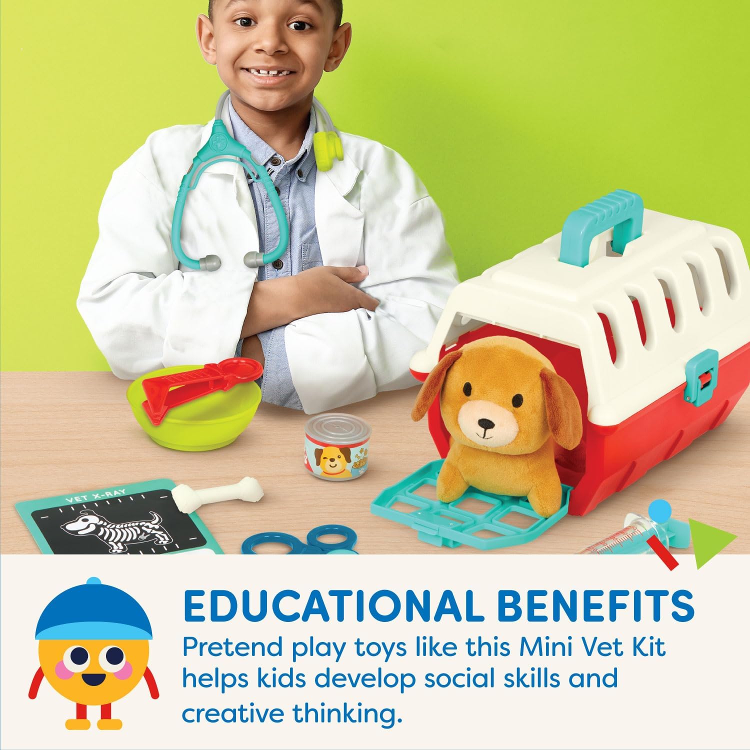 11 Pieces: This pretend play set includes a vet carrier, dog plush, clamp, syringe, stethoscope, food can, bone, checklist, and bandage sticker sheet. Carrier Included: Easily store and transport all the pieces with the pet carrier! Developmental Benefits: Pretend play is a great way to spark creativity and build social and emotional skills. Age Recommendation: This vet play set is recommended for kids 2 years +. Battat – Puppy Care Vet Kit
