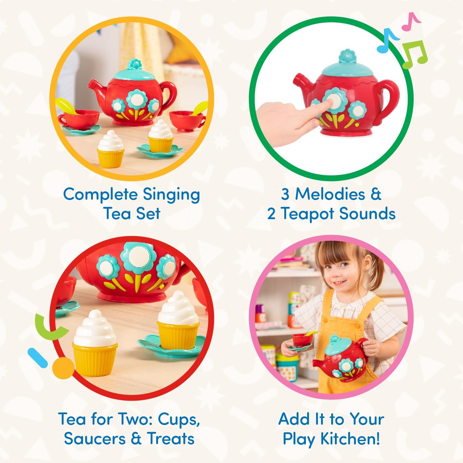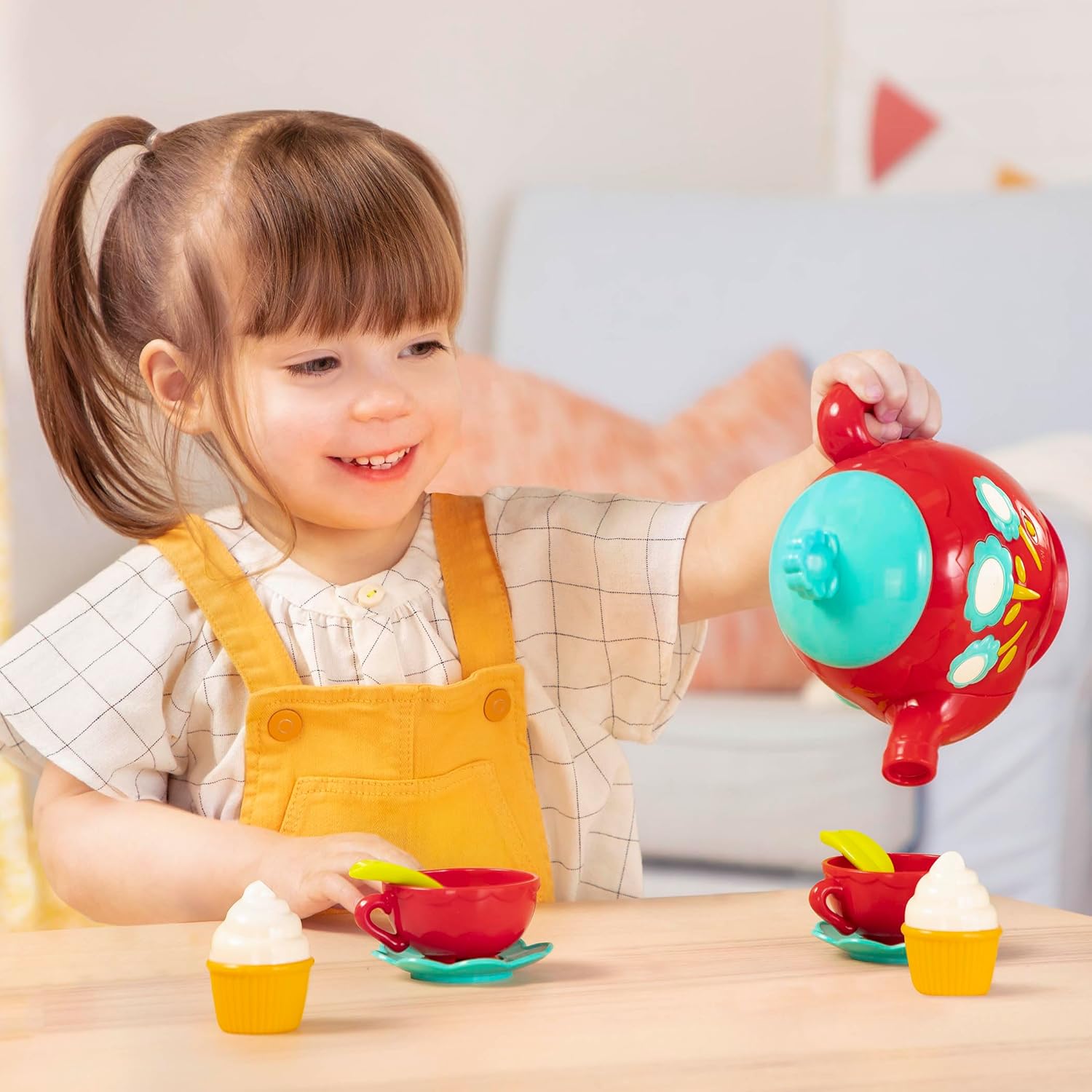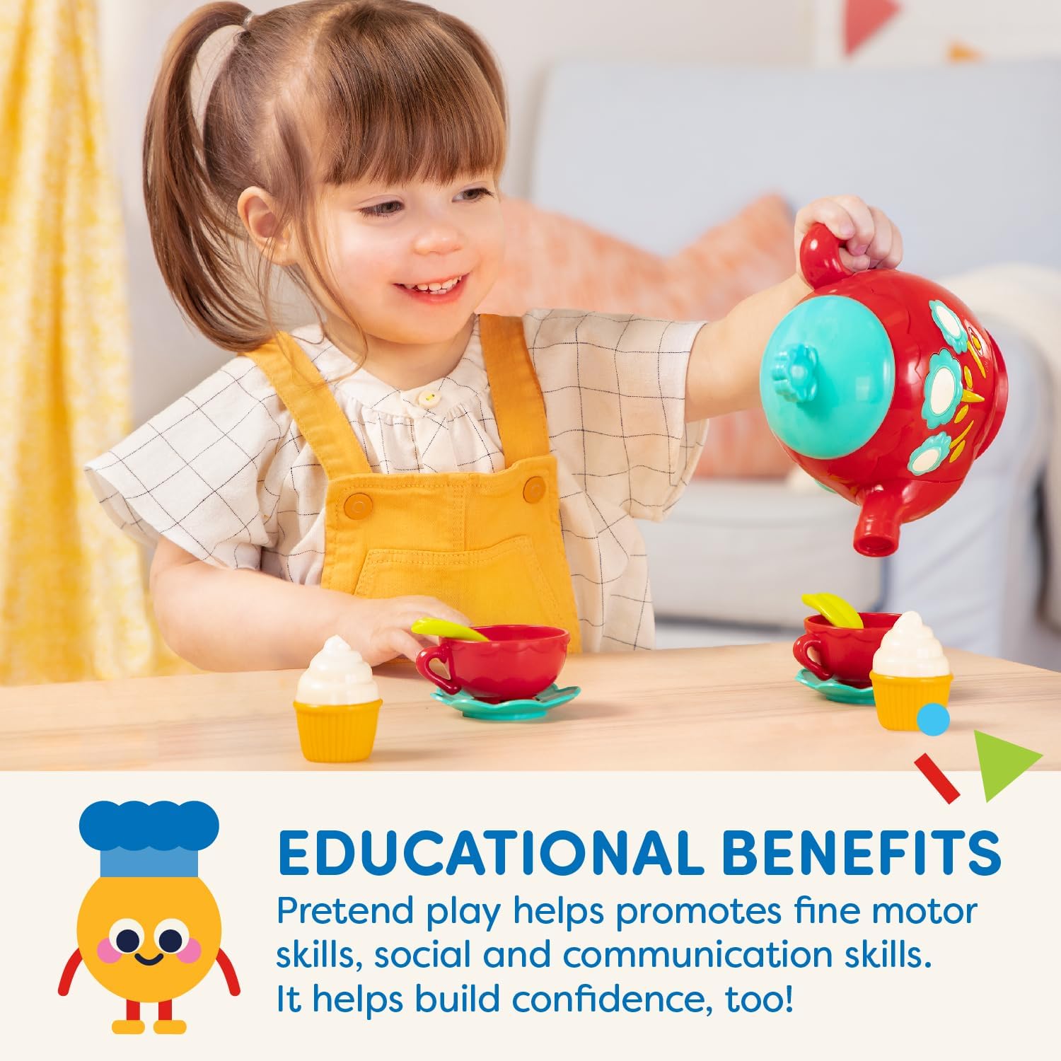 SET DA TÈ COMPLETO PER BAMBINI: Tutto il necessario per preparare il tè (e i cupcake) per 2 persone. L'aggiunta perfetta alla cucina dei bambini. COLORATA E ALLEGRA: la teiera emette 3 melodie e 2 suoni di teiera. Ricordate sempre che i migliori amici fanno sempre i turni per versare! SET DI 9 PEZZI: Include 1 teiera musicale, 2 tazze da tè, 2 piattini, 2 cucchiai e 2 tortine. DETTAGLI REALISTICI: Sollevate il coperchio della teiera per sentirla bollire e spingetelo di nuovo verso il basso per sentirla fischiare quando ha finito! Premendo ogni fiore si possono ascoltare diverse melodie per intrattenere gli ospiti! APPRENDIMENTO: migliora la coordinazione occhio-mano, il gioco immaginativo e il rapporto causa-effetto.