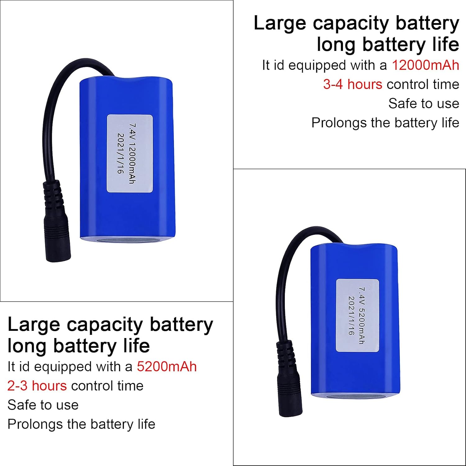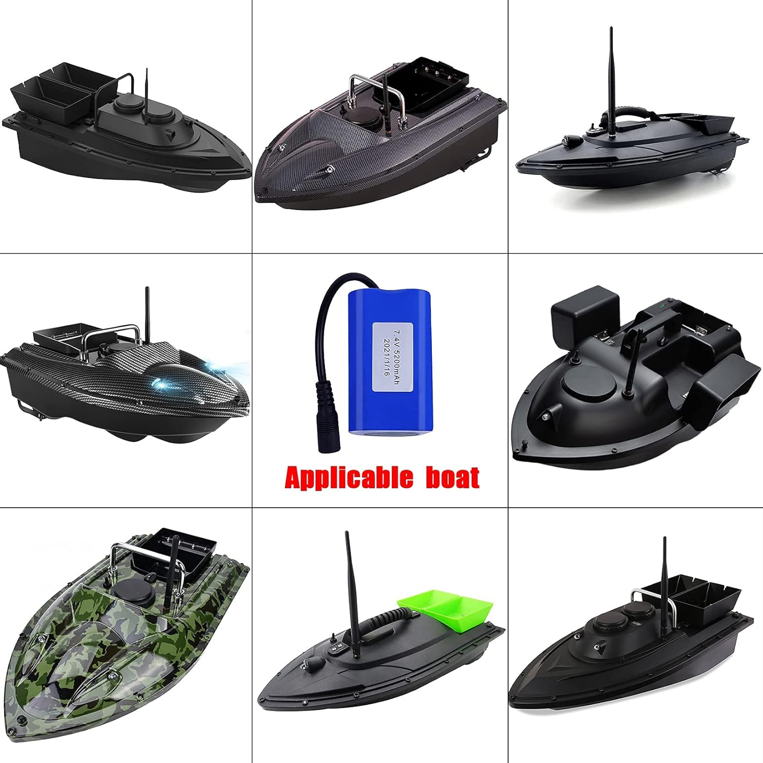 La batteria ricaricabile ad alta capacità consente un utilizzo prolungato. Compatibile: perfetto per barche da pesca con esche telecomandate con capacità di carico di 1,5 kg~3 kg. Batteria della barca: batteria Lipo da 7,4 V 5200 mAh/12000 mAh. Leggero e portatile. Facile da sostituire e installare. Ciclo di carica: la batteria Lipo ha un'elevata efficienza di accumulo di energia e può essere ricaricata più volte.