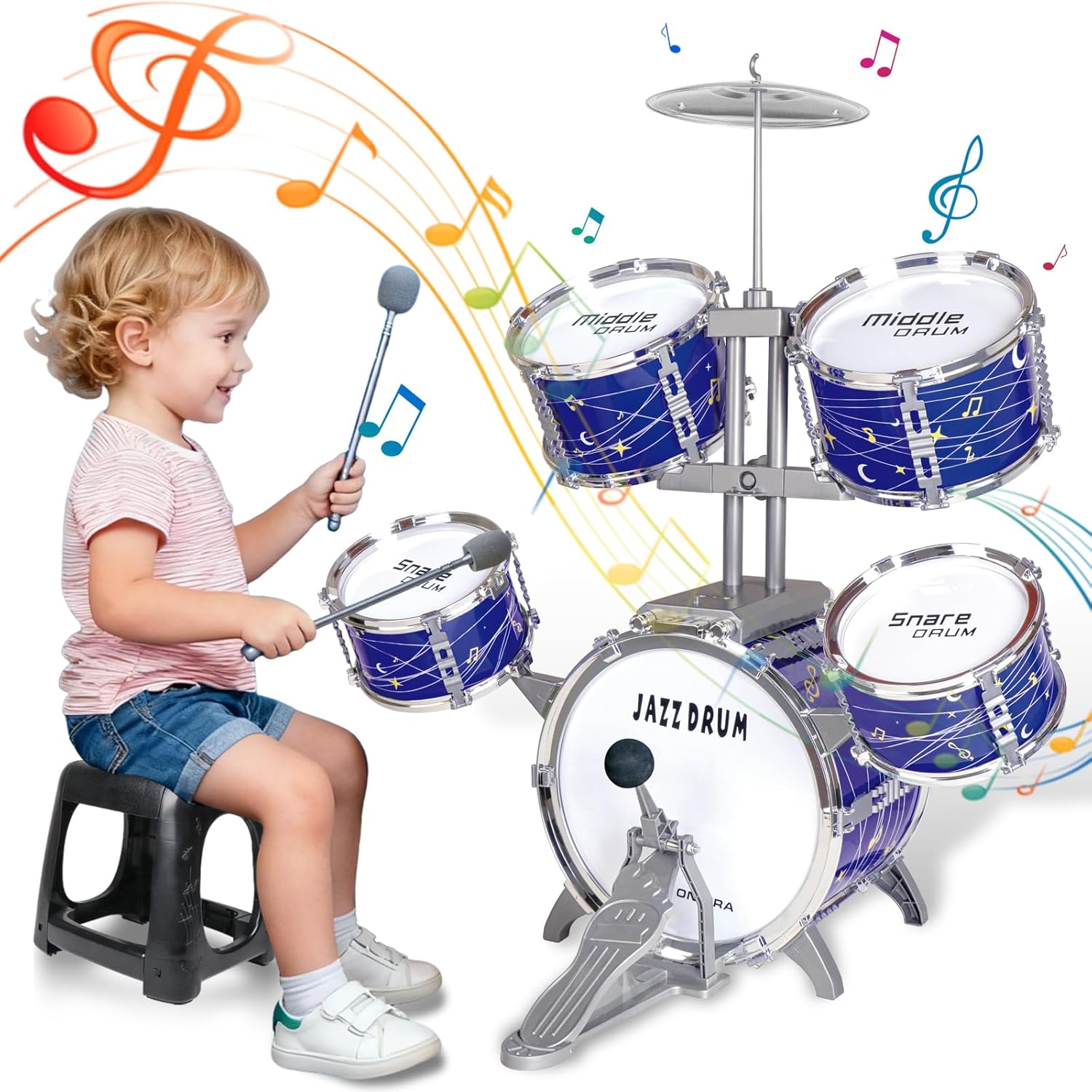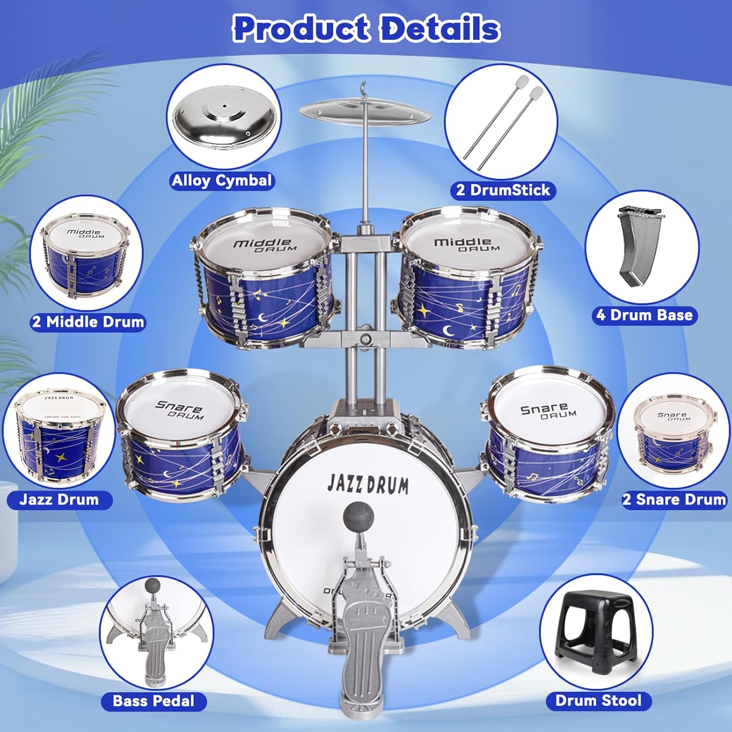 【Batteria per Bambini Aggiornata】Noaideoi Il set di tamburi jazz aggiornato per bambini è realizzato interamente in plastica e comprende una grancassa con pedale, due tamburi medi, due rullanti, un piatto, due bacchette e uno sgabello stabile. Il set di tamburi assemblato è alto circa 78 cm e vanta un design elegante e robusto. Progettato per bambini di età compresa tra 3 e 6 anni. NOTA: fare riferimento all'immagine per informazioni dettagliate sulle dimensioni. 【Dettagli Raffinati e Materiali Resistenti】 Questa batteria per bambini è realizzata in lega, plastica ABS, EVA e altri materiali atossici e inodori. Le sue finiture impeccabili, i bordi arrotondati e la struttura robusta la rendono sicura e adatta ai bambini. L'inclinazione migliorata a 30° offre un comfort ottimale ai bambini da 1 a 3 anni. La pelle della batteria è in EVA spesso e flessibile, resistente e in grado di offrire un suono ricco e costante, per la gioia dei bambini. 【Dettagli Raffinati e Materiali Resistenti】 Questa batteria per bambini è realizzata in lega, plastica ABS, EVA e altri materiali atossici e inodori. Le sue finiture impeccabili, i bordi arrotondati e la struttura robusta la rendono sicura e adatta ai bambini. L'inclinazione migliorata a 30° offre un comfort ottimale ai bambini da 1 a 3 anni. La pelle della batteria è in EVA spesso e flessibile, resistente e in grado di offrire un suono ricco e costante, per la gioia dei bambini. 【Giocattolo Musicale Educativo e Divertente】 Questo set di tamburi musicali per bambini è un ottimo modo per stimolare l'interesse dei più piccoli per le percussioni, favorendo lo sviluppo del senso del ritmo e della fiducia in se stessi. È la scelta ideale tra gli strumenti musicali educativi per bambini dai 3 ai 5 anni. Può anche essere utilizzato come giocattolo per genitori e figli, favorendo il legame e i momenti di gioia con i bambini e promuovendo uno sviluppo positivo. 【Batteria Realistica per Bambini】 Questa batteria realistica permette ai bambini di scoprire appieno il piacere di suonare la batteria. Il design classico dei pedali contribuisce allo sviluppo della loro concentrazione, destrezza e motricità, in particolare la coordinazione occhio-mano. La testa della bacchetta è rivestita in gomma spugnosa, rendendo l'esecuzione più agevole e confortevole. Il set include anche uno sgabello robusto per consentire ai bambini di sedersi e suonare comodamente. 【Batteria a Tema Cielo Stellato】 La nostra batteria per bambini riproduce il cielo notturno, con un fantastico bordo blu stellato. Stelle, lune e note musicali danzanti punteggiano il cielo notturno, simboleggiando la capacità dei bambini di diventare brillanti batteristi stellati. Questa fantastica e adorabile batteria jazz per bambini di età compresa tra 1 e 7 anni è una delle preferite.