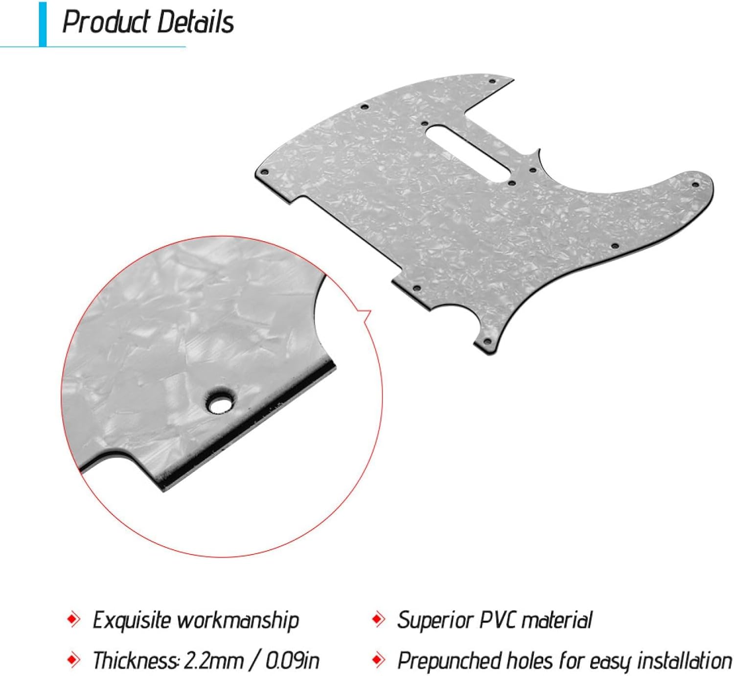 Adatto per chitarre elettriche stile Telecaster. Con pellicola protettiva sulla parte superiore. Un ottimo e speciale sostituto per il vecchio battipenna della tua chitarra. Tutti i materiali sono ecologici, termostabilità, nessun odore. Cinque colori sono per la vostra opzione.