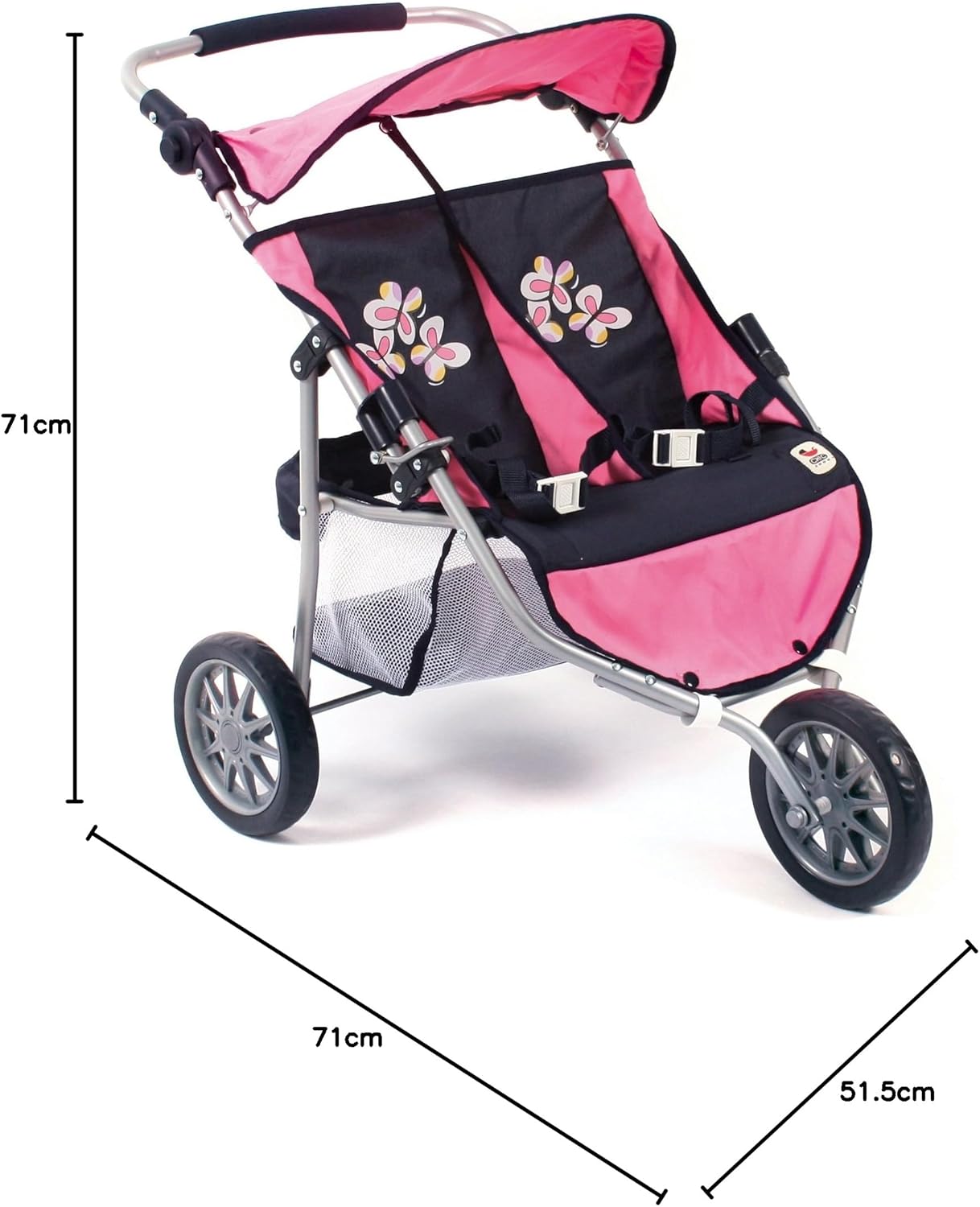 Moderno passeggino a 3 ruote con tettuccio regolabile. Passeggino per gemelli con manubrio regolabile in altezza 50 – 75 cm. Passeggino per gemelli con parasole, cinture di sicurezza e grande rete portaoggetti. Adatta per tutte le bambole fino a 50 cm. Stimola la creatività del bambino. Dimensioni: 67 x 51,5 x 71 cm. Peso: 2,8 kg.