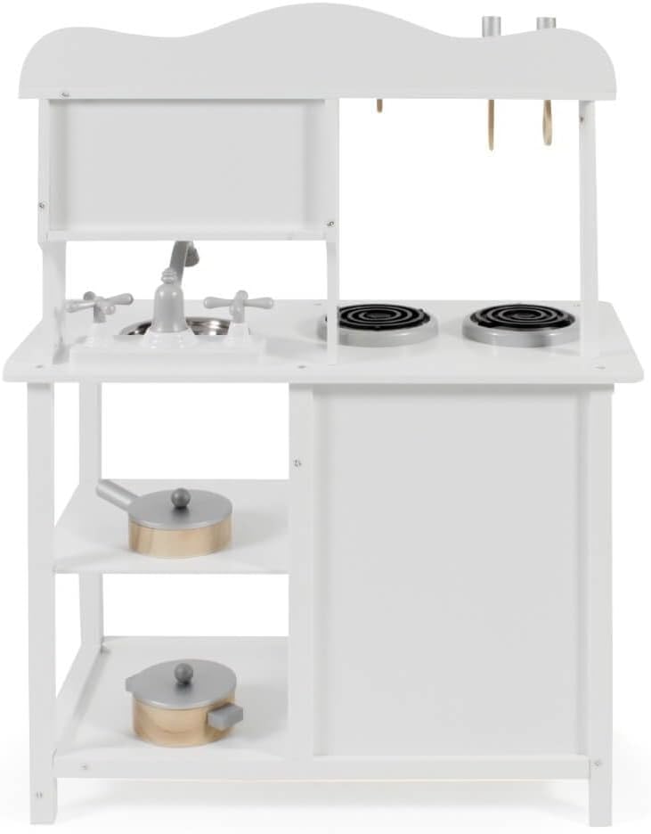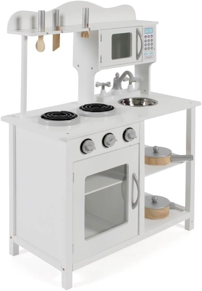 Le cucine giochi promuovono la creatività dei tuoi bambini e ti permettono di usare la tua immaginazione per creare deliziosi piatti per i tuoi ospiti La splendida cucina in legno è dotata di due piani cottura con manopole rotanti, un forno, un microonde con pannello di controllo multicolore e un lavello estraibile con rubinetto Come accessorio da cucina sono inclusi una pentola con coperchio, una padella con coperchio, un cucchiaio, un coltello e una forchetta in legno Tutte le manopole producono suoni realistici dei clic Materiale: MDF, plastica/dimensioni: 60 x 30 x 85 cm; altezza del piano di lavoro: 47 cm, peso: 6,2 kg
