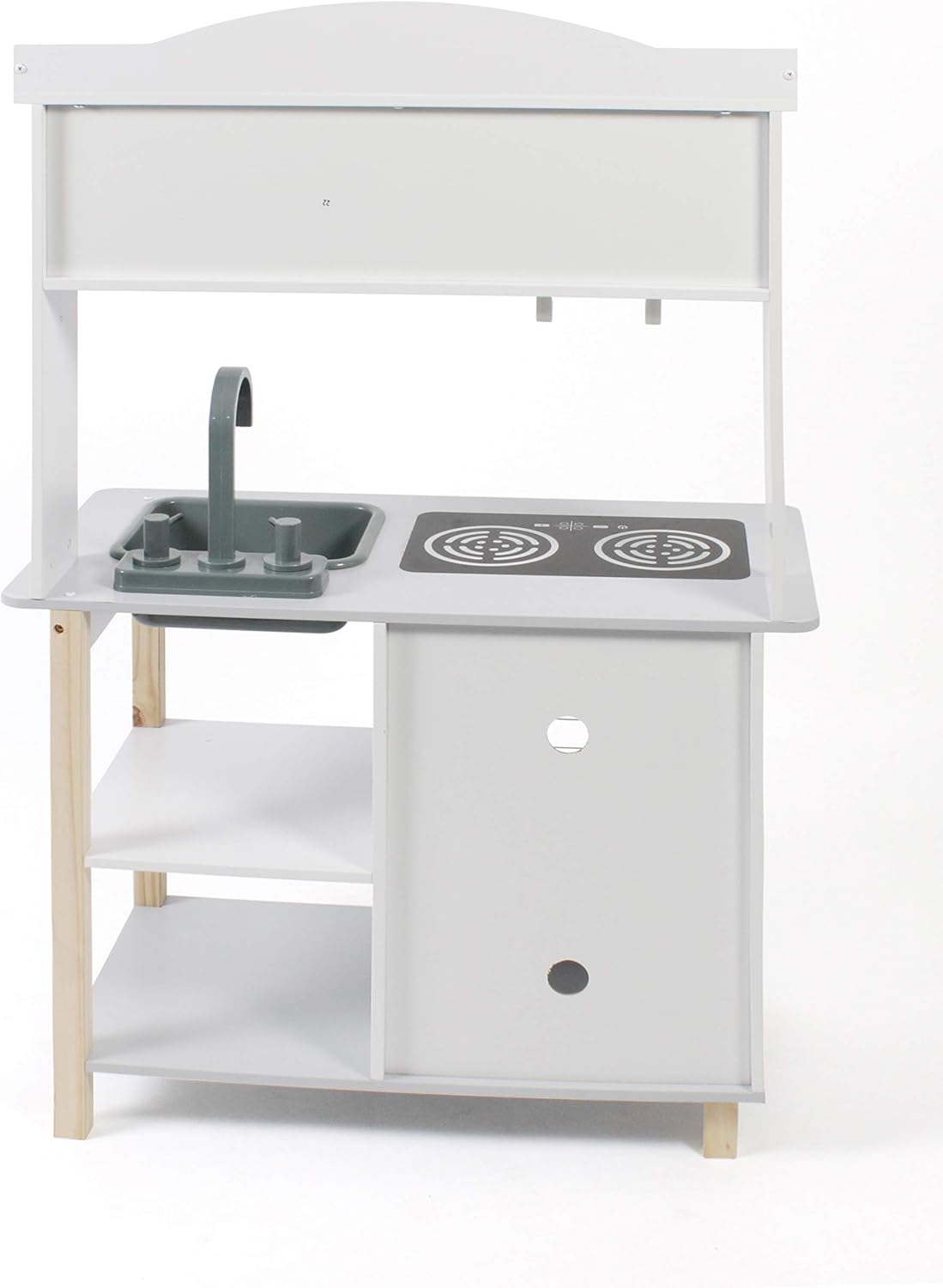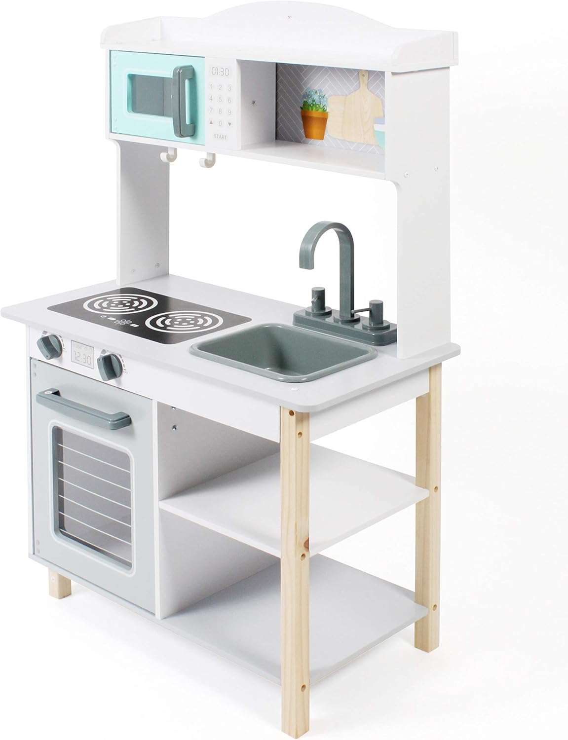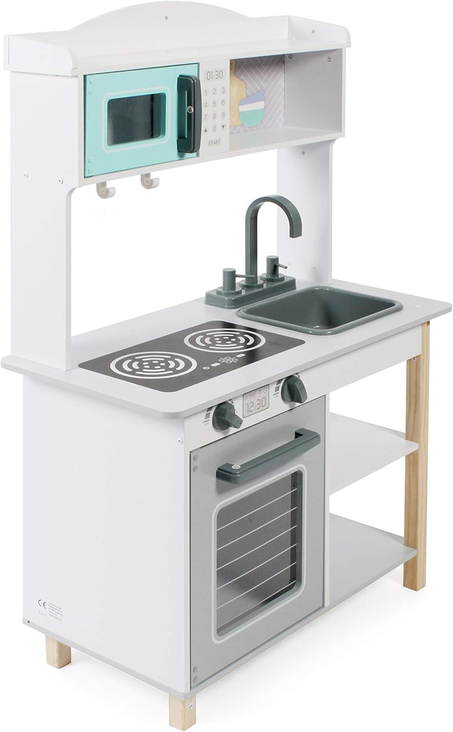 La splendida cucina in legno è dotata di due fornelli, un forno a microonde con pannello di controllo, forno, ripiani per riporre gli oggetti e un lavello estraibile con rubinetto. Tutte le manopole producono suoni realistici dei clic Le cucine da gioco promuovono la creatività dei tuoi bambini e ti permettono di usare la tua immaginazione per cucinare piatti deliziosi per i tuoi ospiti. Dimensioni: 59,5 x 30 x 94 cm; altezza piano di lavoro: 45,5 cm, peso: 8 kg Età consigliata: la cucina giocattolo è adatta per bambini dai 3 anni in su