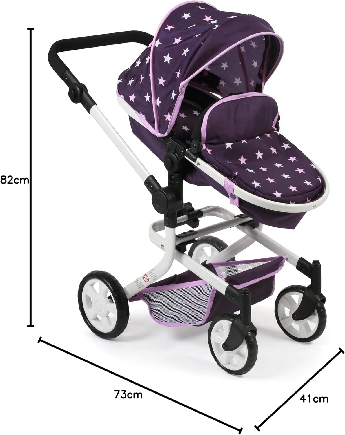 Carrozzina per bambole combinata con molte pratiche funzioni e telaio elegante La maniglia è regolabile in altezza da 47 a 80 cm e si adatta così all'altezza del bambino Il cursore può anche essere ruotato, in modo che il passeggino possa essere guidato da entrambi i lati Il passeggino sportivo è dotato di una cintura di sicurezza a 3 punti e può essere utilizzato sia in direzione di marcia che di fronte alla mamma delle bambole Adatto per bambole fino a 52 cm, dimensioni dell'articolo: 73 x 41 x 82 cm, peso: 4 kg
